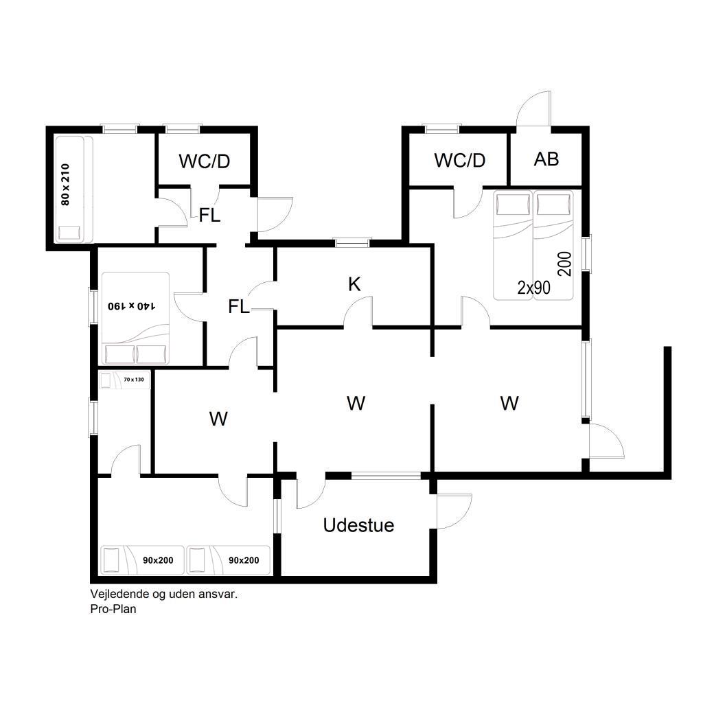 Sengestørrelser: 1 dobbeltseng med 2 madrasser 90 x 200 cm + 1 dobbeltseng med 140 x 190 cm + 2 enkeltsenge 90 x 200 cm + 1 enkeltseng 70 x 130 cm + 1 køjeseng 80 x 210 cm.