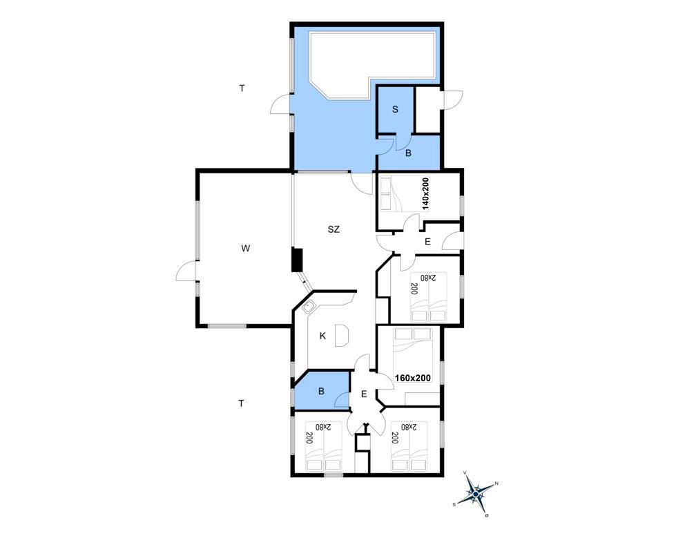 Sengestørrelser: 1 dobbeltseng 160 x 200 cm + 3 dobbeltsenge med 2 madrasser 80 x 200 cm + 1 dobbeltseng 140 x 200 cm.