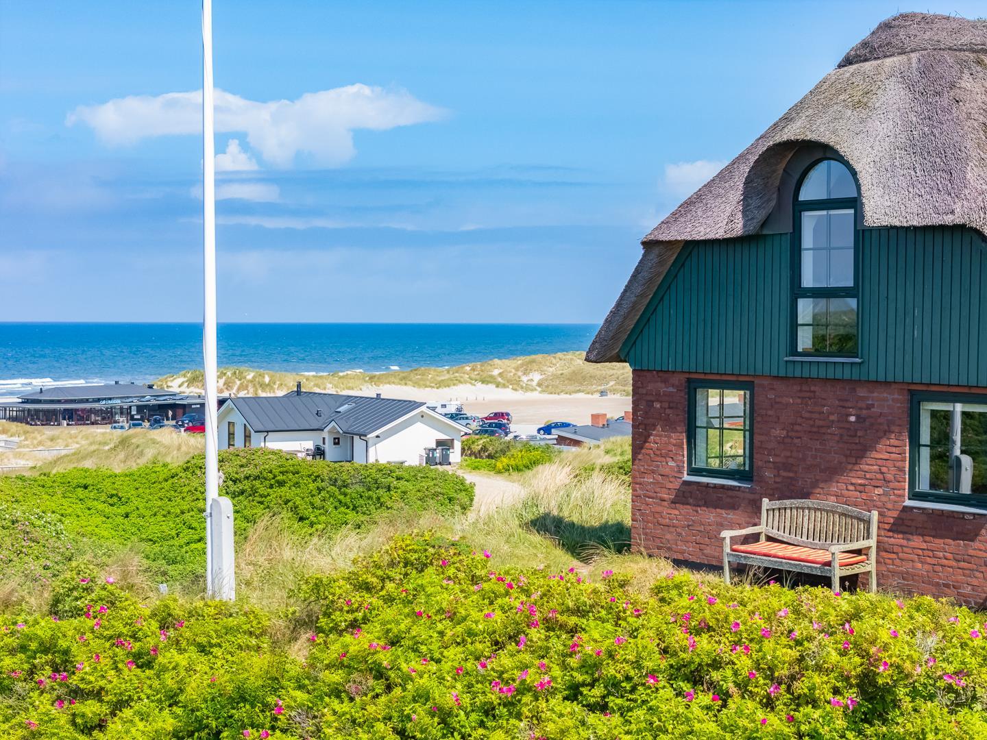 Her finder du et unikt sommerhus, perfekt placeret på en af Vestkystens bedste beliggenheder. Med en fantastisk udsigt over stranden og det mægtige Vesterhav, som du kan nyde fra alle sider af huset – nord, syd og vest. Mod øst åbner landskabet sig med Henne Strand by og det vidtstrakte hedeområde nord for byen.