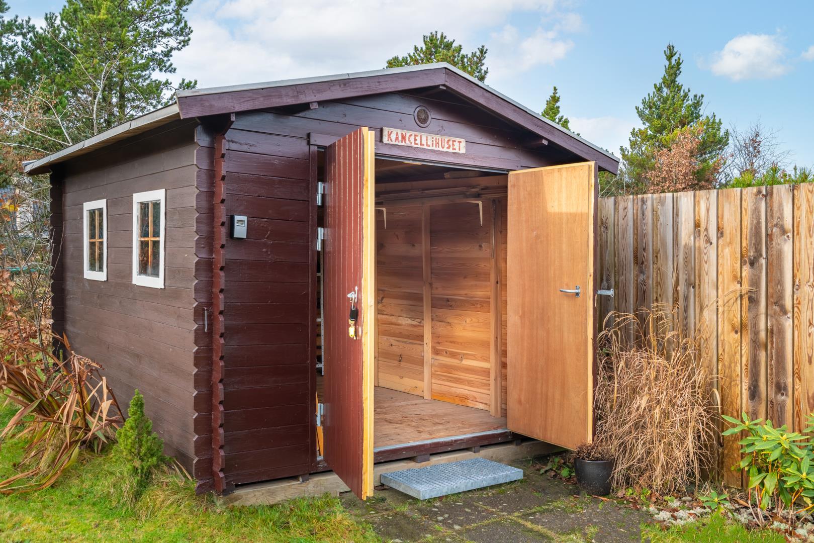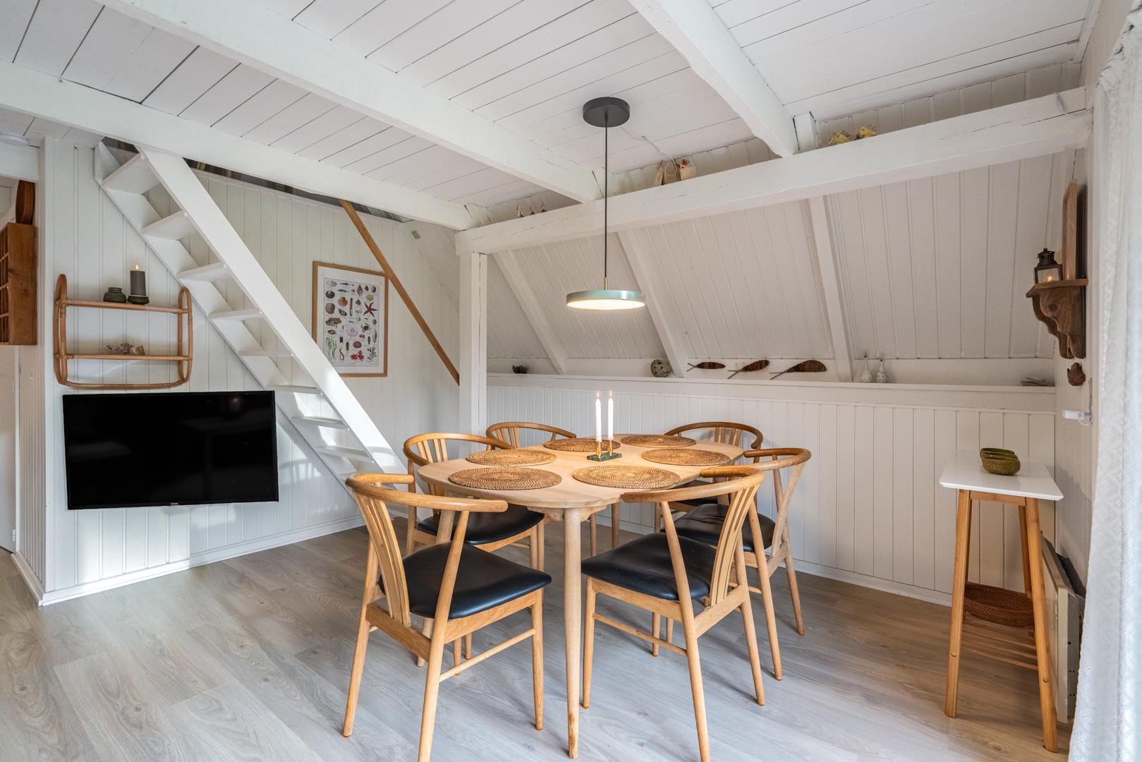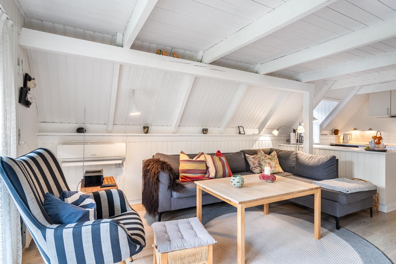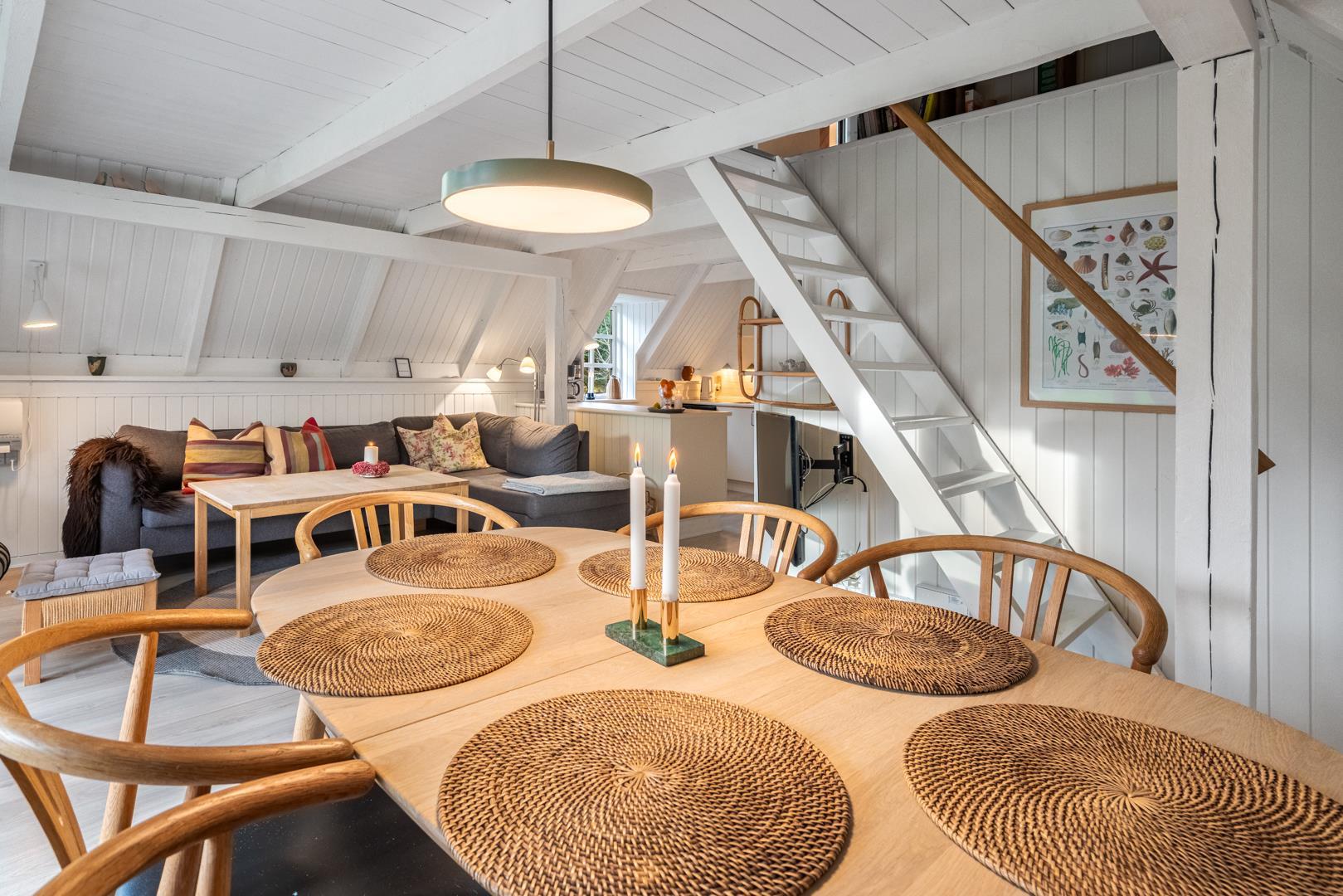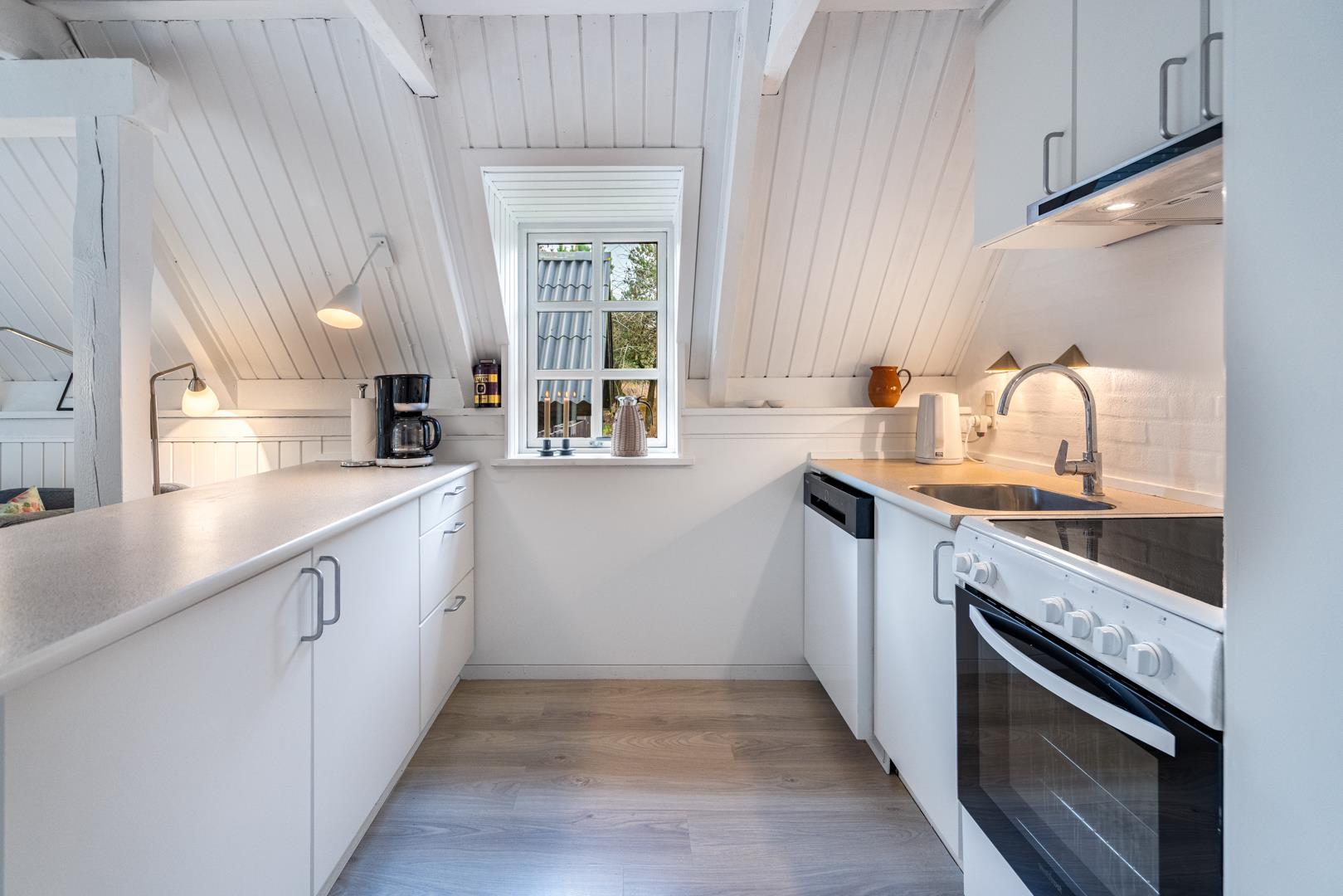 Huset er lyst og praktisk indrettet med køkken/alrum og direkte udgang til en delvist overdækket træterrasse med stor udendørs spa. Køleskabet er placeret i gangen – funktionelt og nemt tilgængeligt.