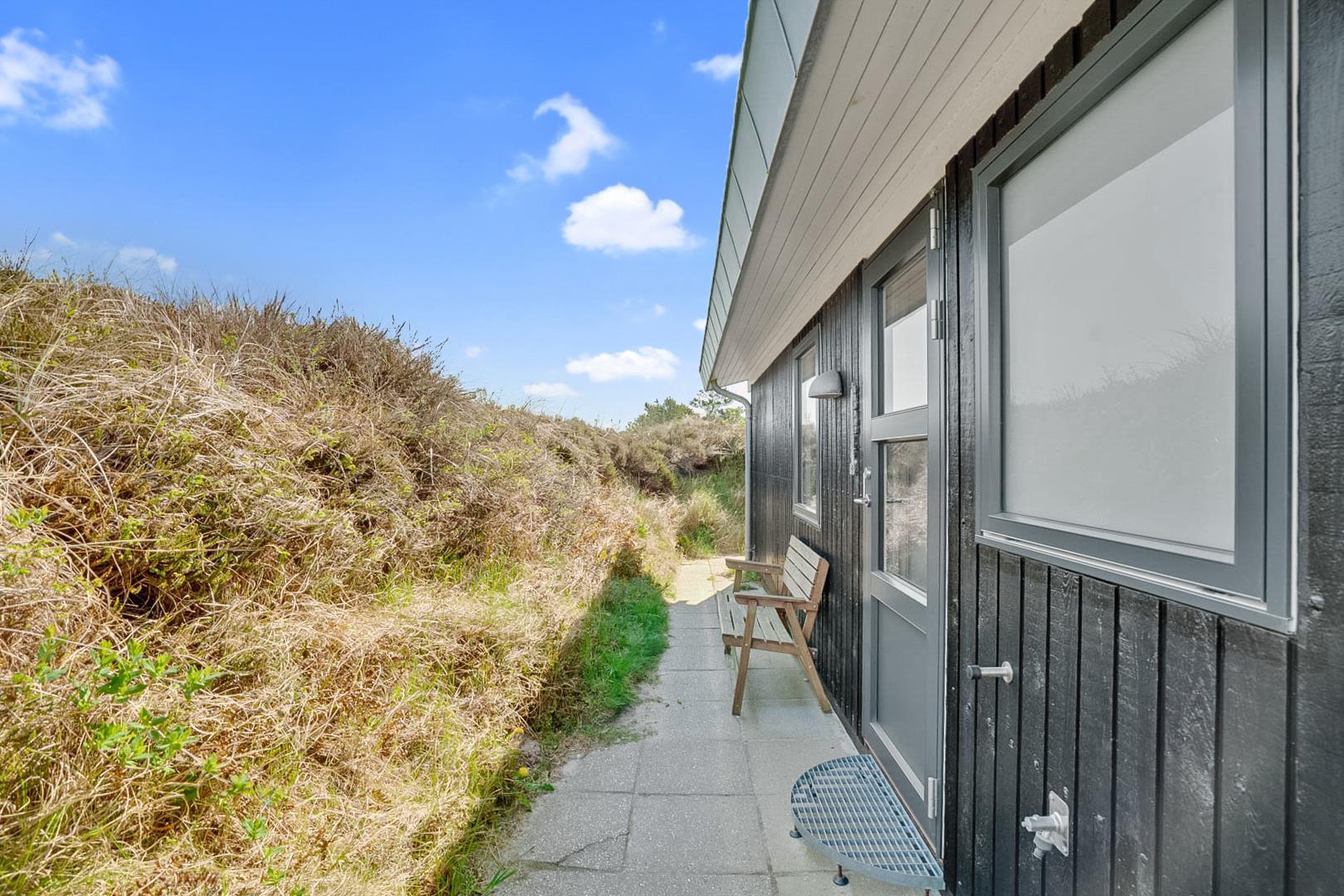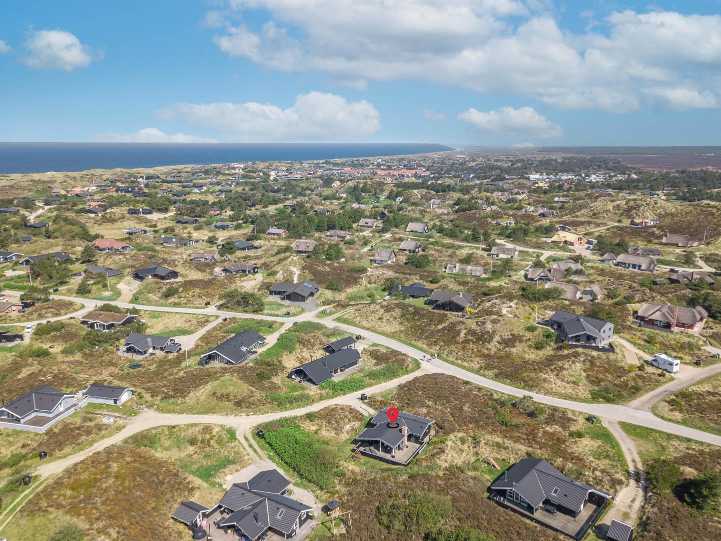 Tilbagetrukket fra Hjelmevej på en flot og letkuperet lynggrund. Ikke langt fra huset er der en sti, som går gennem det skønne klitlandskab og ned til Vesterhavet. På 5 minutter er man på områdets 18-hullers golfbane eller ud i Blåbjerg Plantage med motionsstier og mountainbike-ruter.
