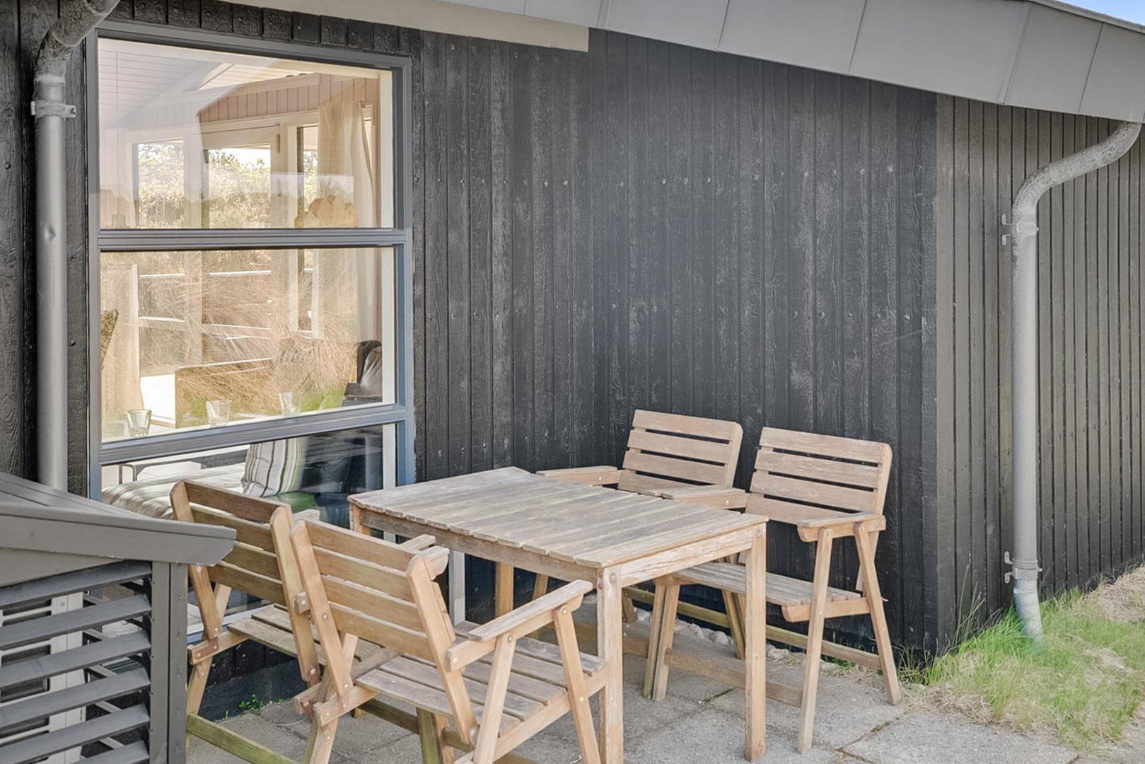 På den store lukkede træterrasse kan solen og den friske luft nydes i fulde drag. I dette skønne feriehus er rammerne skabt for en god ferie i Henne Strand.