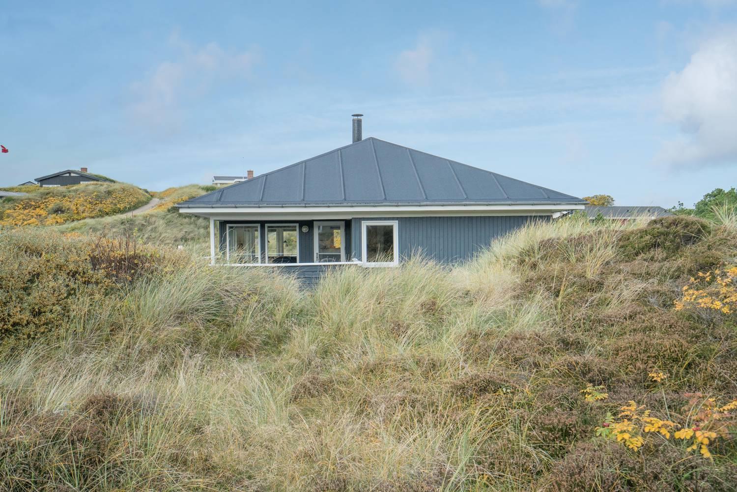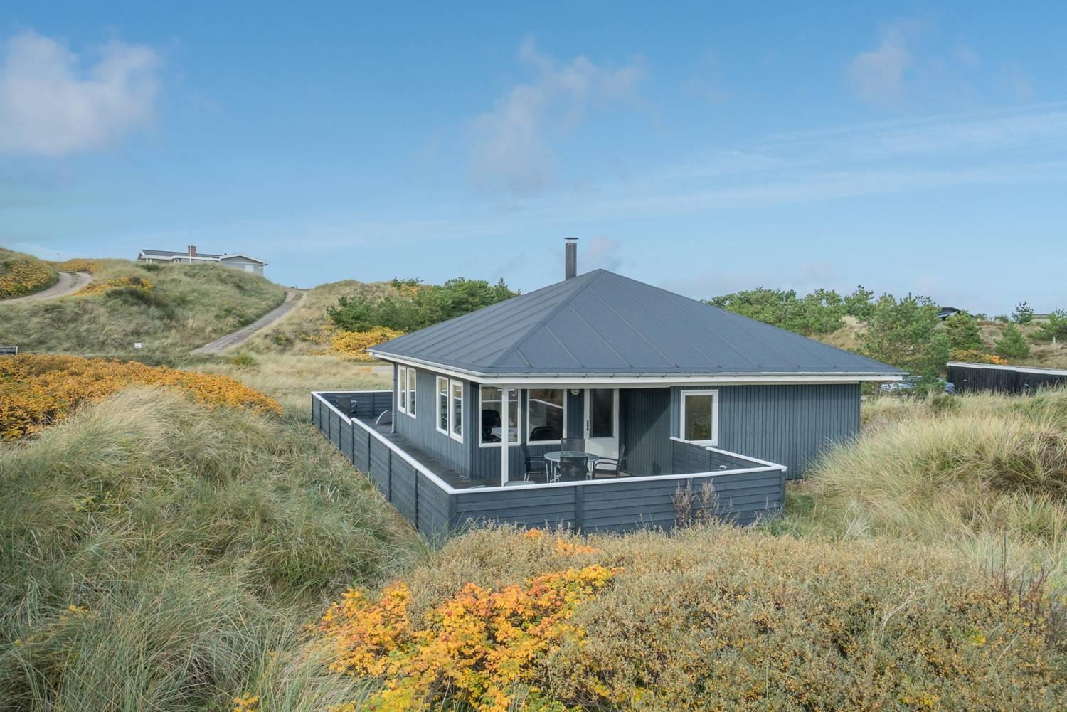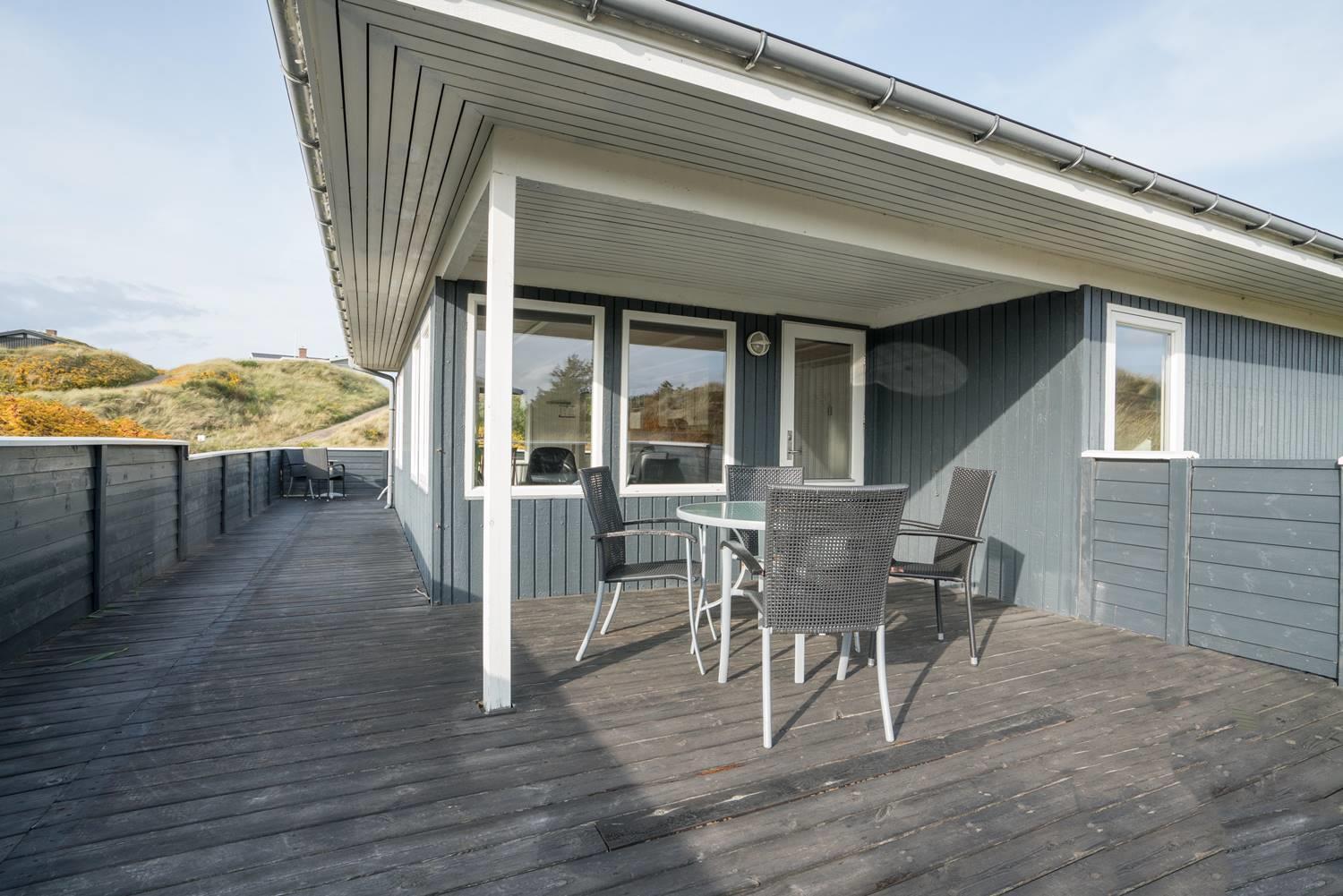 Flot feriehus i Henne Strand med sauna, skønne terrasser og tæt på stranden, perfekt til afslapning i naturskønne omgivelser.