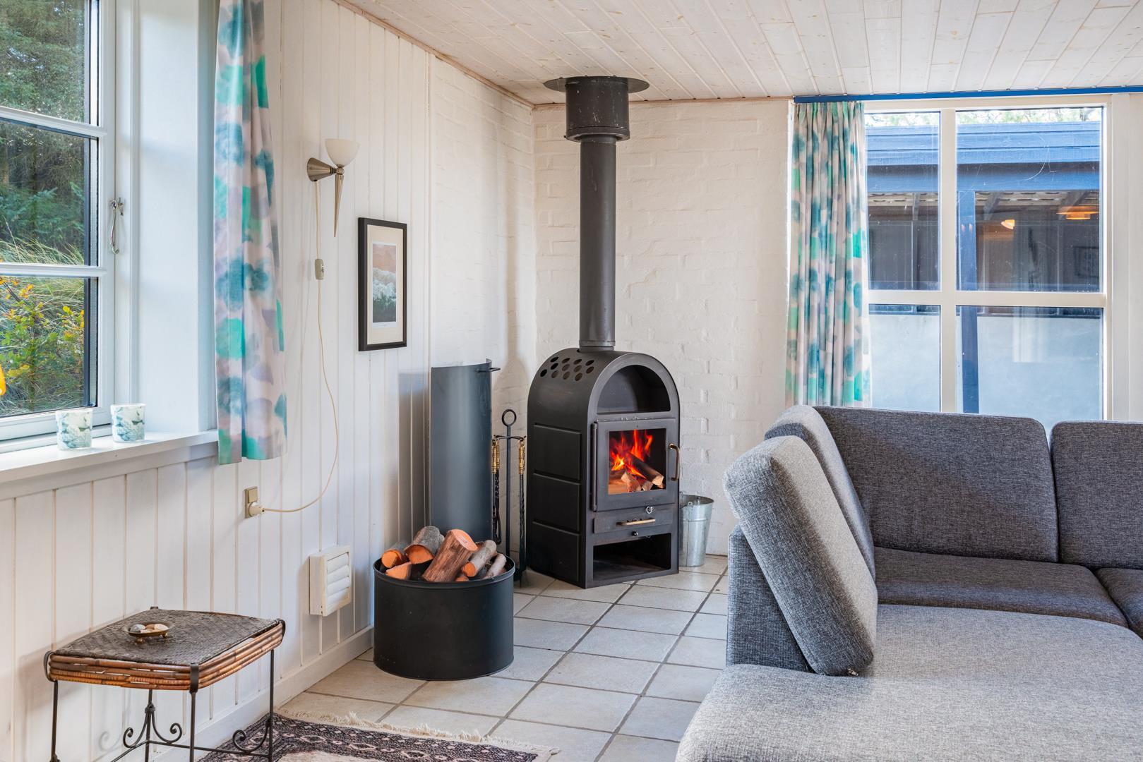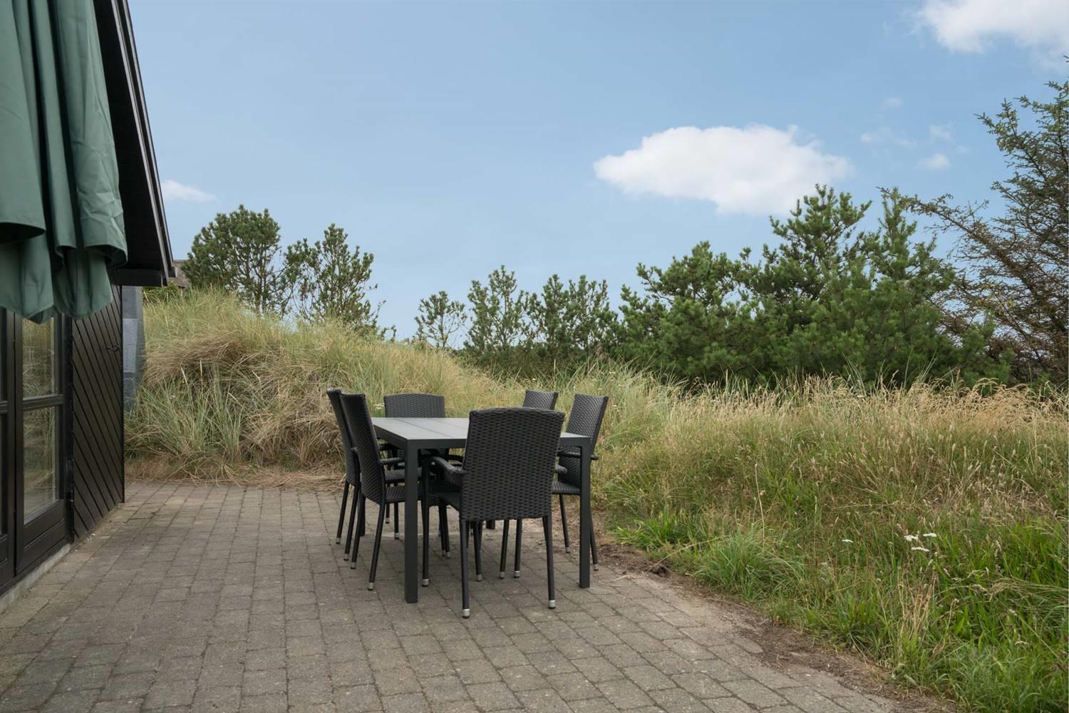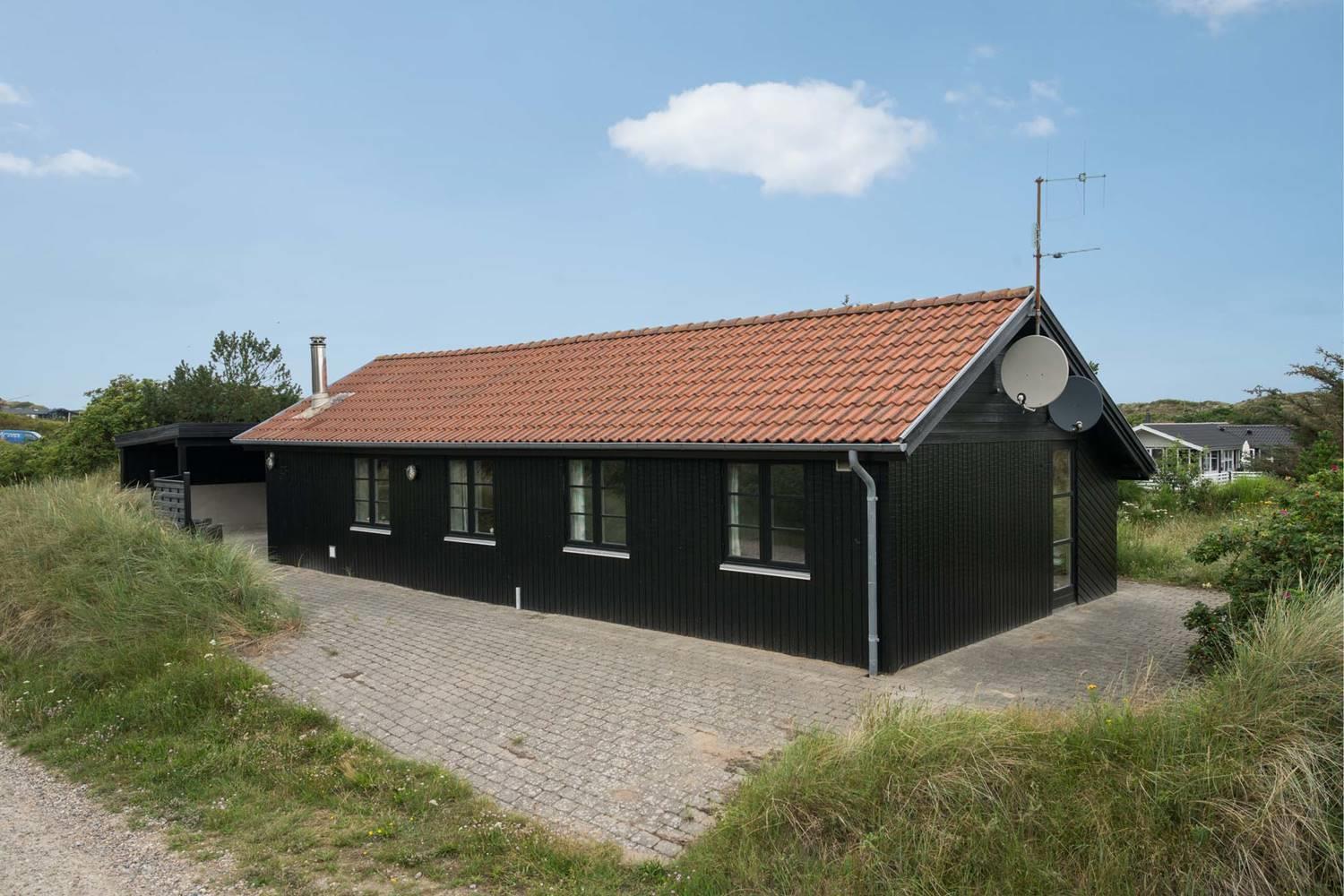 Velholdt feriehus centralt beliggende på en naturgrund kun 500 m fra byen og Vesterhavet. Huset fremstår overalt tidssvarende. Endvidere god fliseterrasse omkring huset samt integreret depotrum og carport med redskabsrum. Huset er desuden udstyret med varmepumpe og solvarmeanlæg. Dejligt køkken/alrum med loft til kip og spiseplads med udgang til ugenerede terrassearealer på husets bagside. Køkkenet ligger i forbindelse med rummelig opholdsstue med sofagruppe og brændeovn. Badeværelse med badekar, med side dysser ,vaskemaskine og tørretumbler samt adgang til sauna.