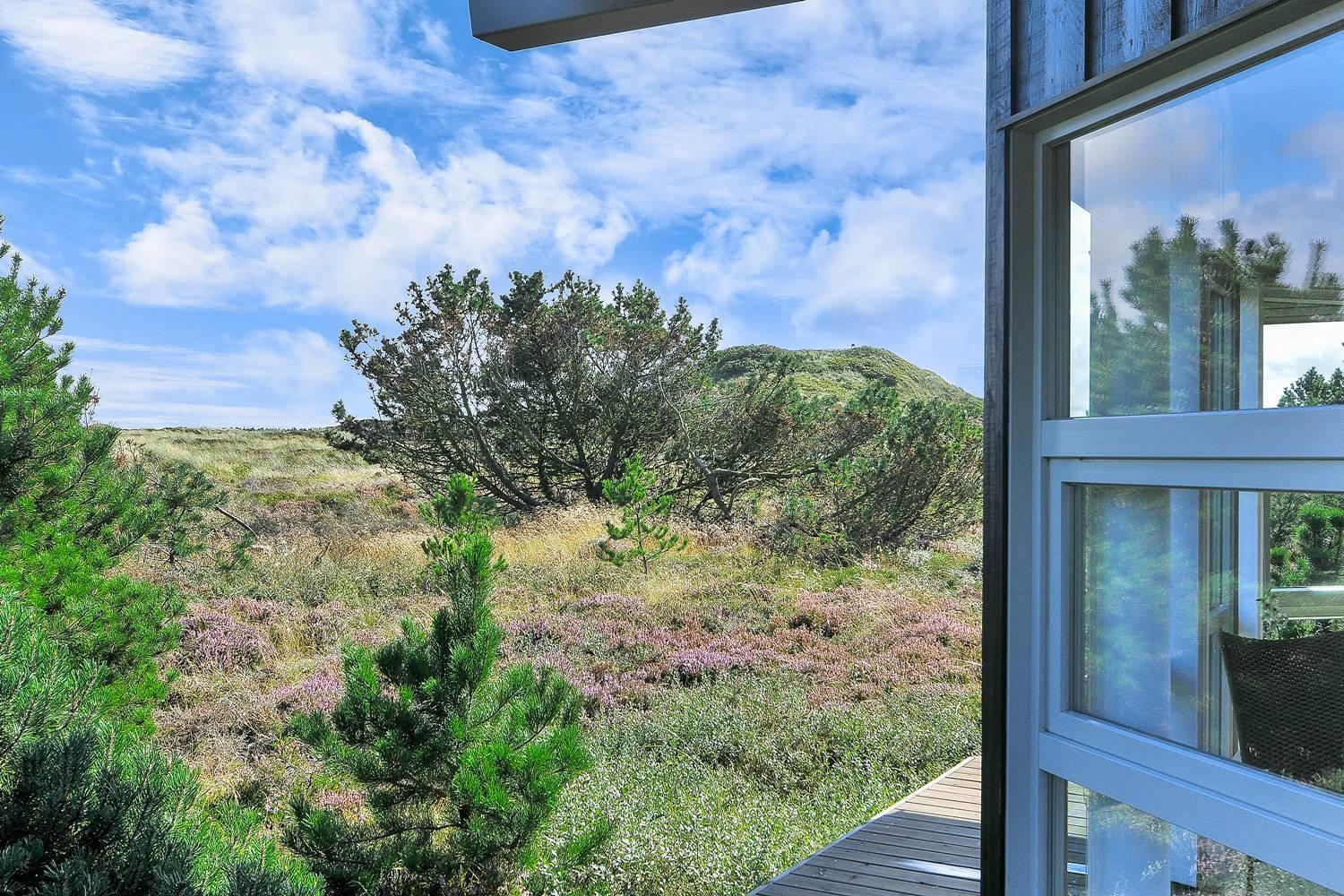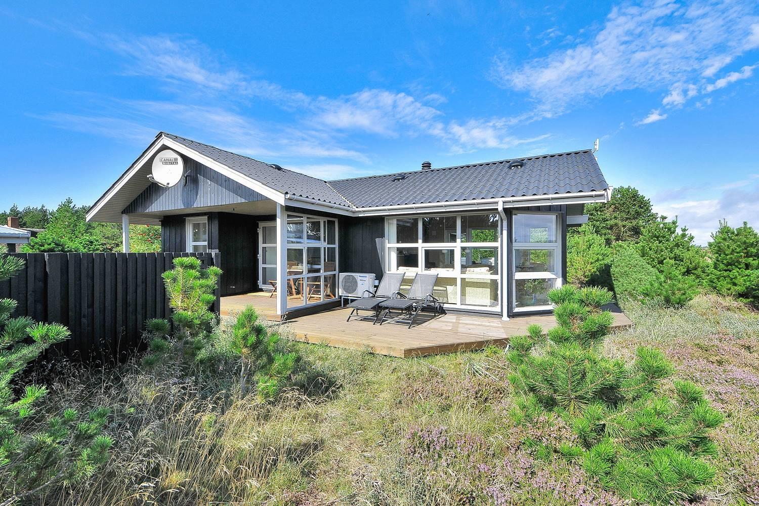 Feriehus på klitgrund med ugenert terrasse og udsigt til fredet hedeområde nær Henne Strand.