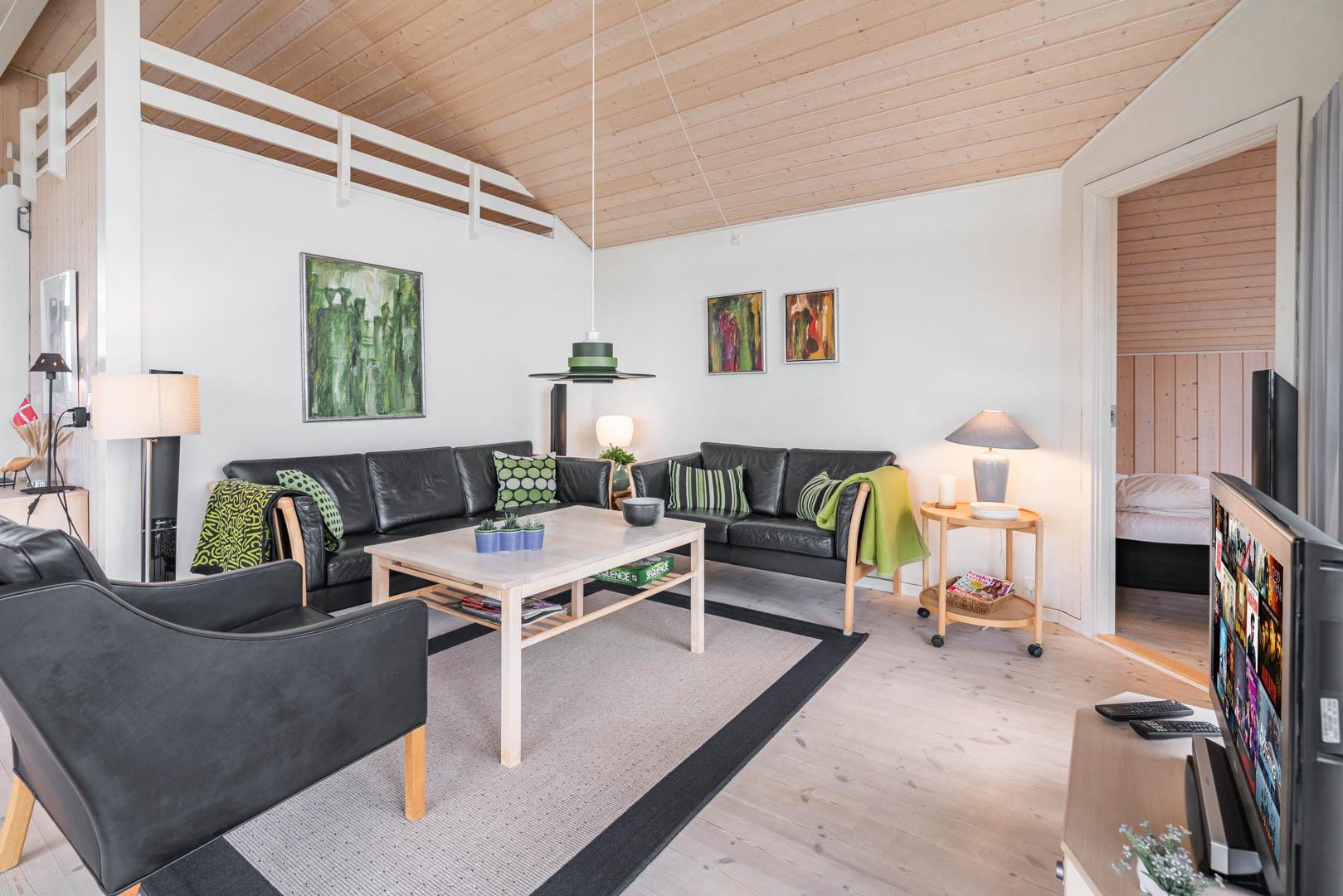 Huset byder på et smagfuldt indrettet opholdsrum med store vinduespartier, der giver et fantastisk lysindfald og udsigt til naturen. Fra den rummelige og lyse stue er der direkte udgang til solrige træterrasser, hvor udelivet virkelig kan nydes.