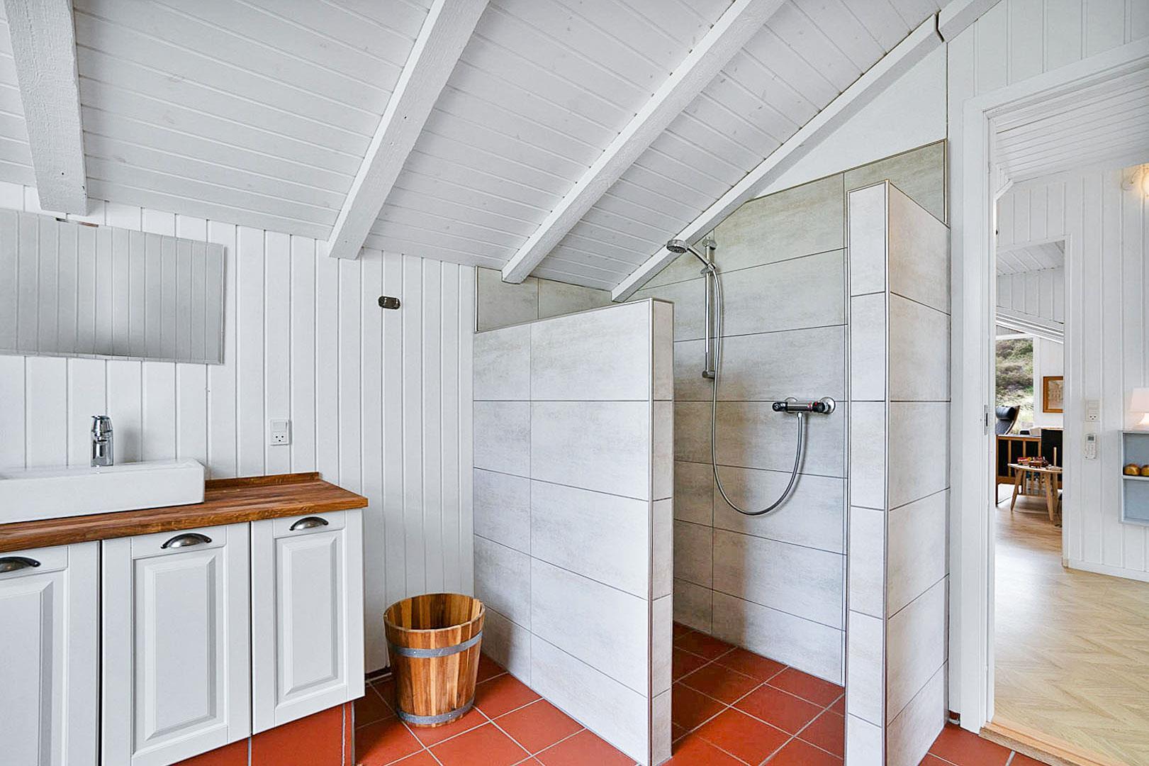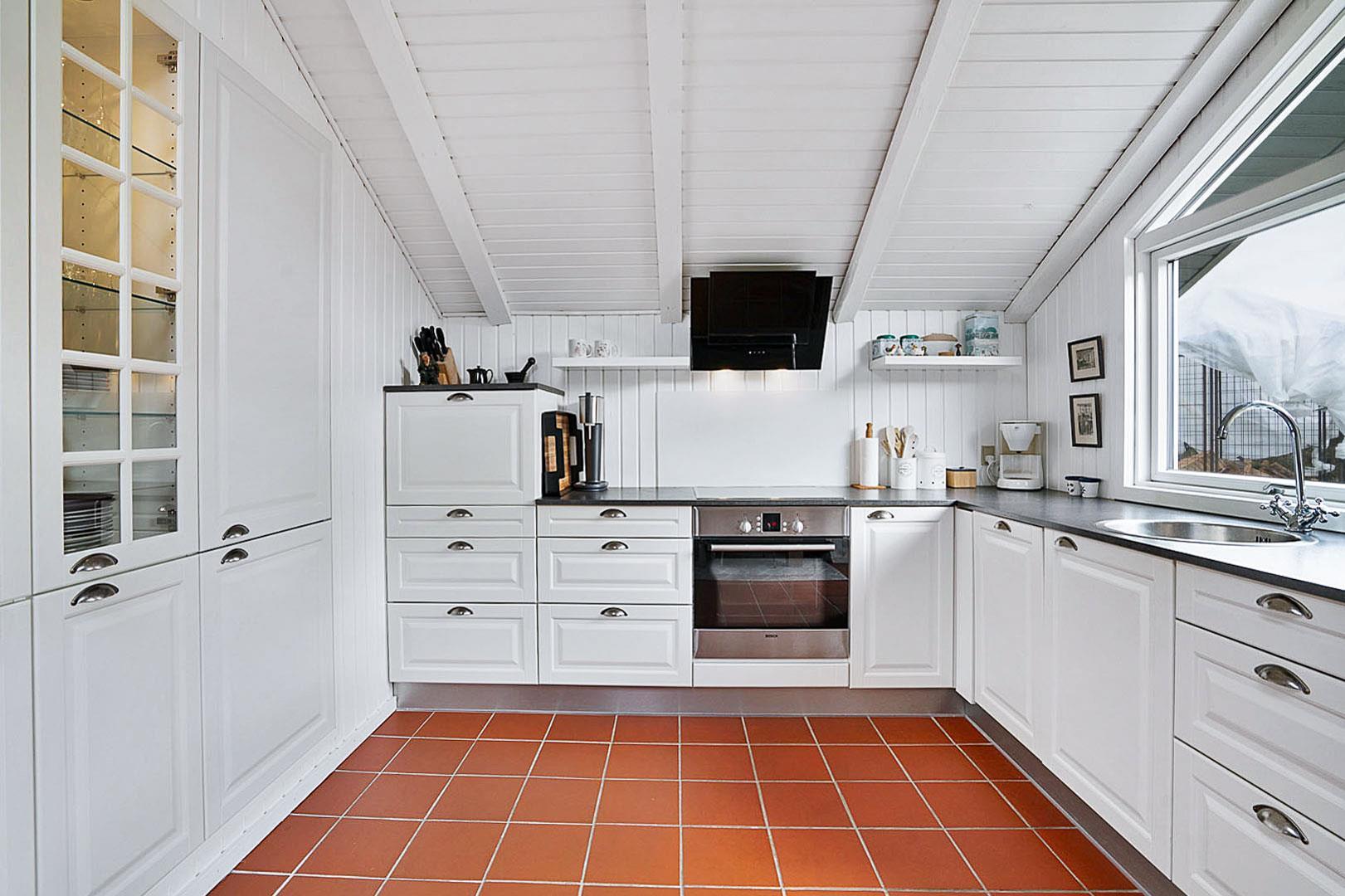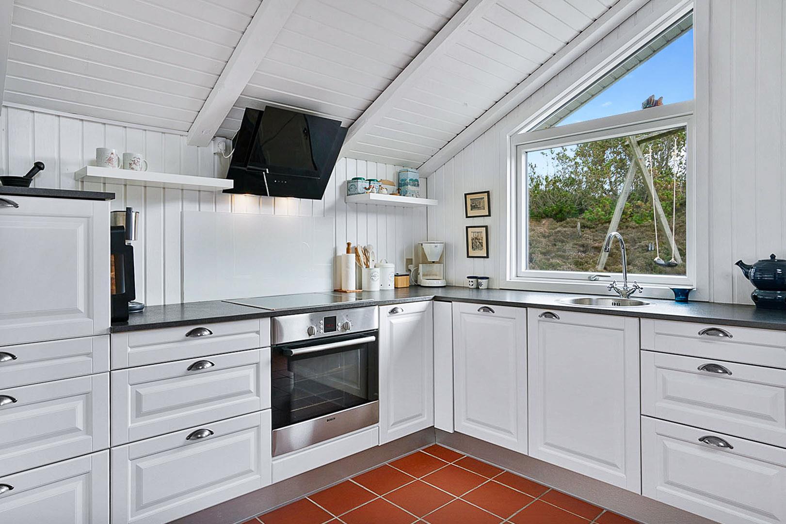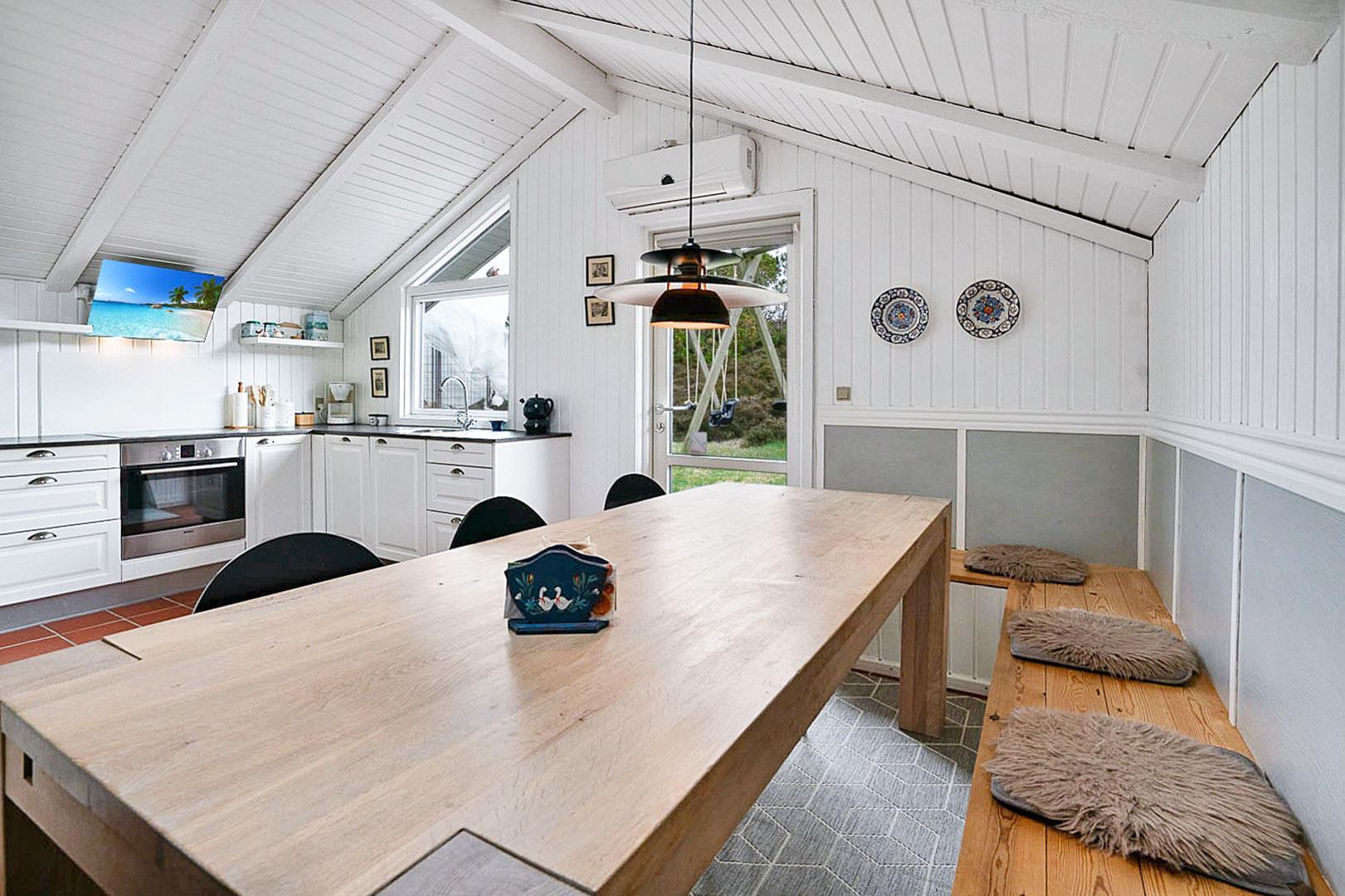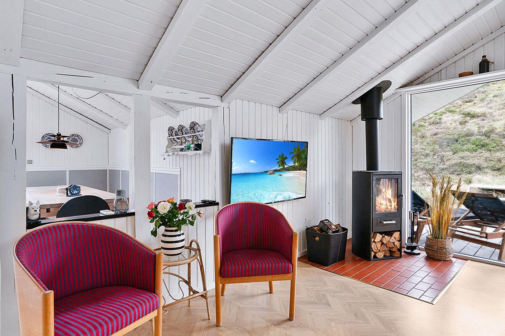 Sommerhuset er dejligt lyst, og har derfor et meget imødekommende og indbydende udtryk. Det lækre køkken åbner op til en hyggelig stue hvor du har direkte udgang til den store terrasse. I stuen kan du nyde varmen fra brændeovnen, der er centralt placeret og skaber den perfekte hyggestemning uanset hvor du befinder dig i rummet. Yderligere finder du 3 skønne soveværelser med dobbeltsenge og et fint badeværelse.