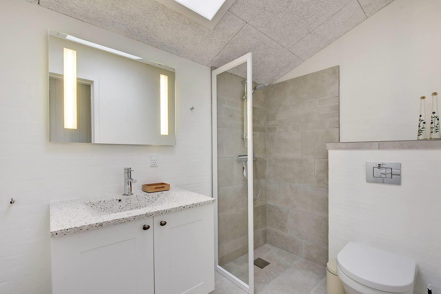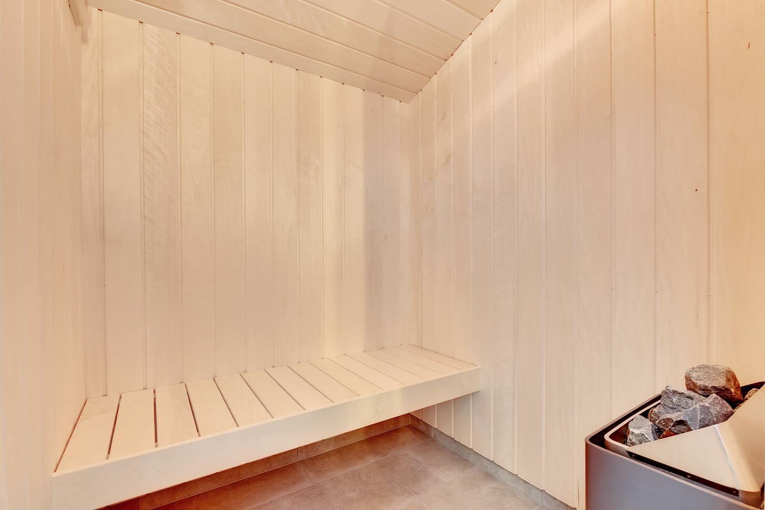 Feriehuset har 2 flotte badeværelser med bruser og gulvvarme, det ene råder over sauna og badekar. Fra stuen er der udgang til stor overdækket træterrasse, samt fliseterrasse der fordeler sig på 3 sider på huset således man kan nyde solen hele dagen. 4 gode soverum. samt alkove hvor børnene kan hygge sig. Stor entre med vaskemaskine og tørretumbler. Til børnene er der 2 fodboldmål på den ene terrasse, samt gynge og sandkasse. Fremhæves skal også den pragtfulde overdækkede terrasse med terrassevarmere som er med til at forlænge terrassesæsonen og gøre grillaftenen længere. Et "super-hus hvor rammerne er til stede for en rigtig god ferie - hele året. Parkering med autocamper på grunden ikke tilladt. Huset er udstyret med kvalitets Continental senge.