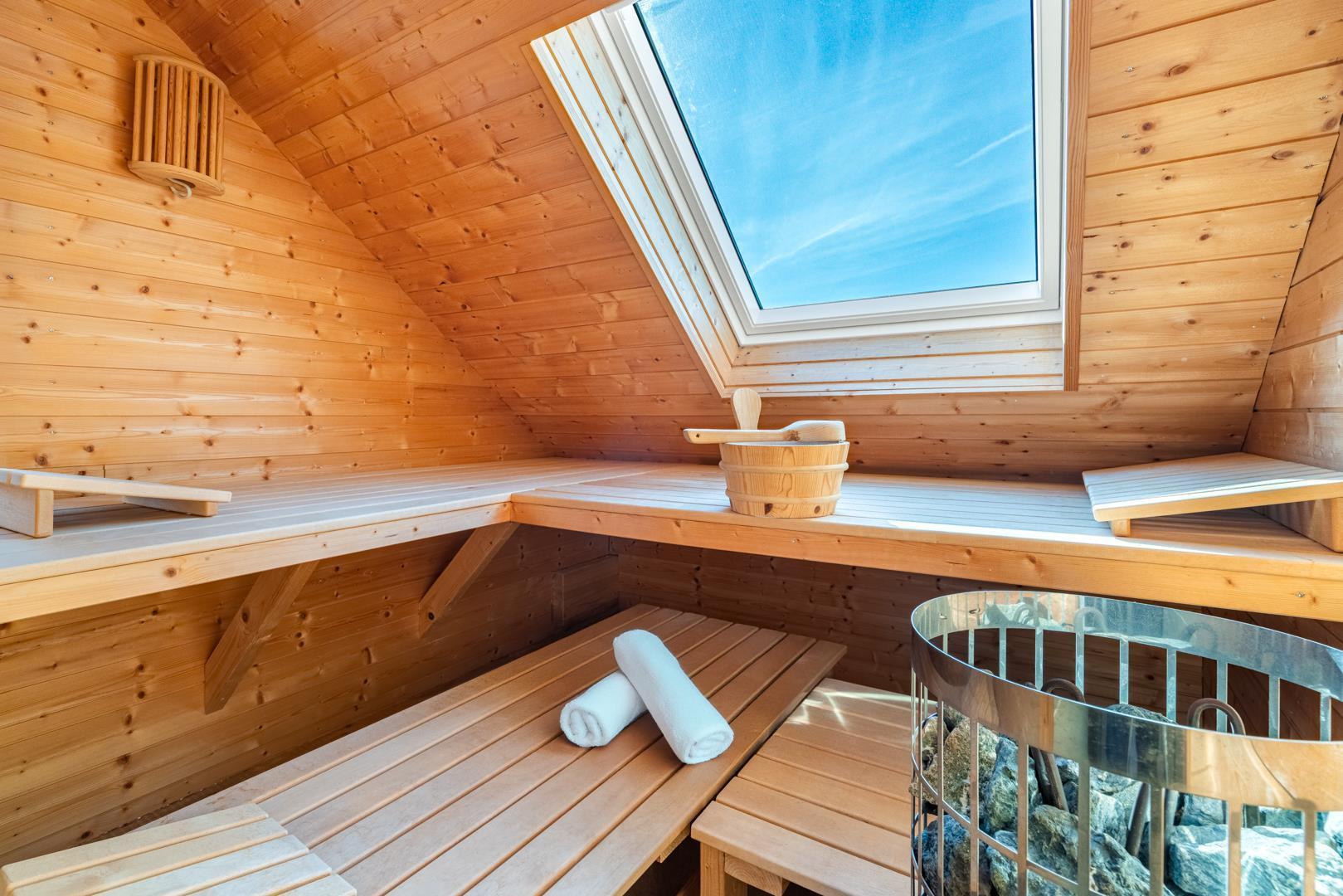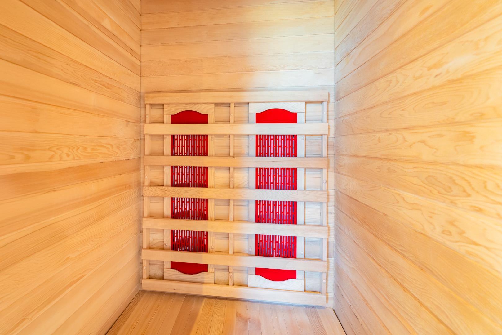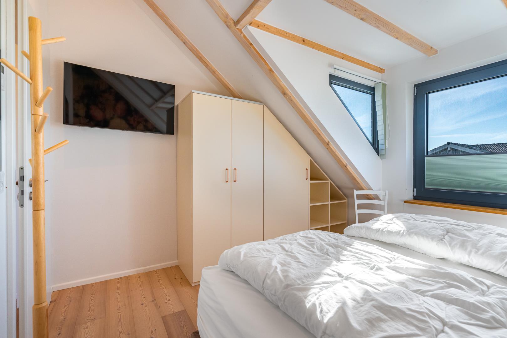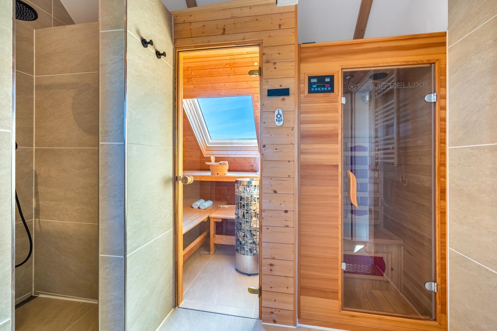 Huset har nu en anden etage, som byder på en fantastisk udsigt over det brede klitlandskab og aftenhimlen. Her finder du et andet soveværelse med en box madrasser, et lille yogarum, et lækkert badeværelse med finsk sauna med udsigt over havet og en infrarød sauna. Loungeområdet ovenpå med sofa og liggestol gør den afslappende ferie perfekt.