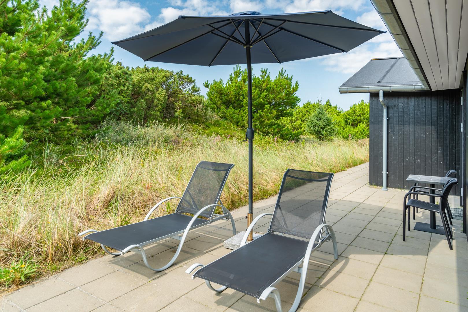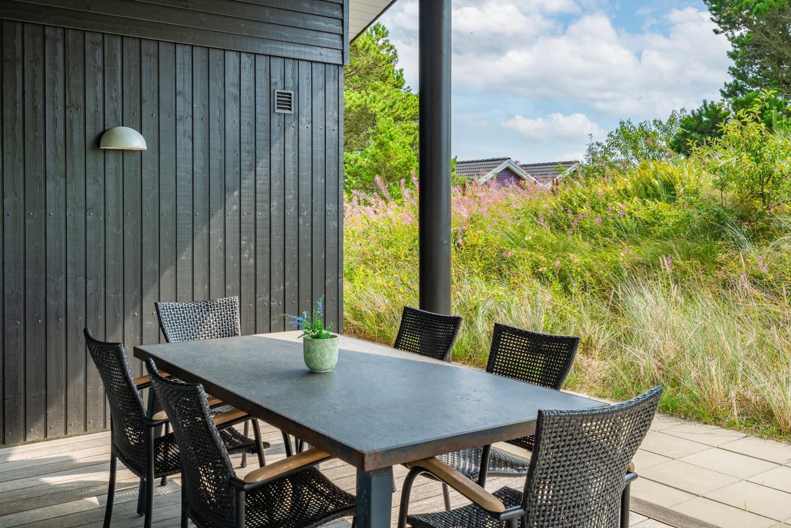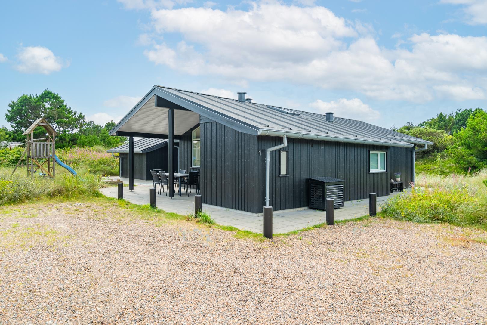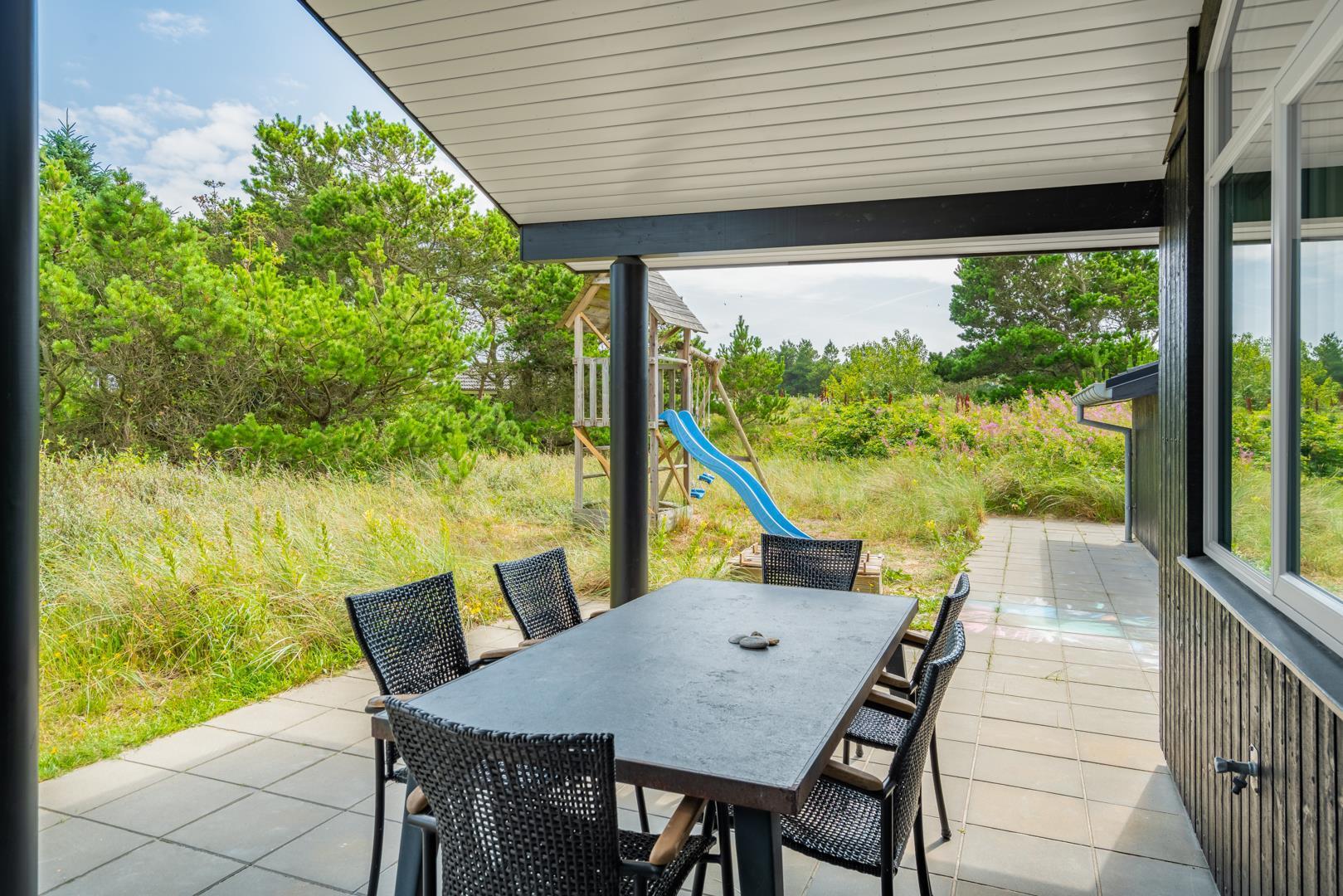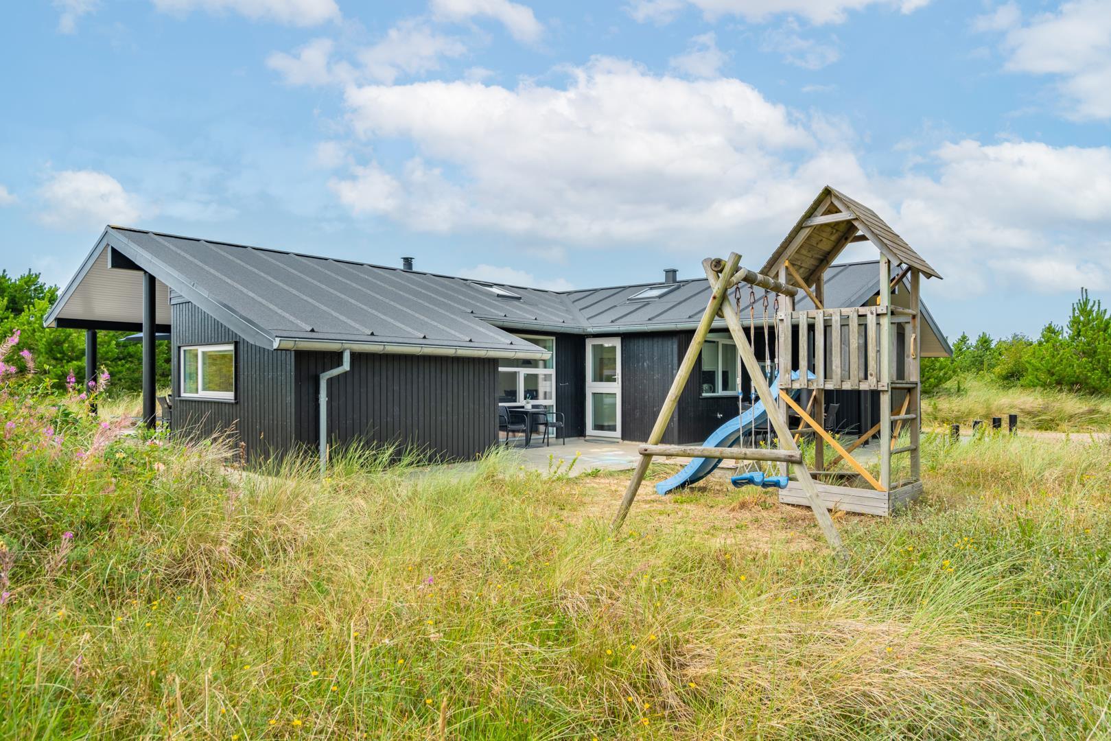 Udendørs kan I nyde to delvist overdækkede terrasser på i alt 100 m2 med havemøbler, liggestole og grill. Børnene kan lege i legehuset med rutchebane, og der er gode læforhold på den store naturgrund. Huset ligger kun 700 meter fra Vesterhavet og 900 meter fra Henne Strands indkøb og restauranter, hvilket gør det til et ideelt udgangspunkt for en afslappende ferie ved kysten.