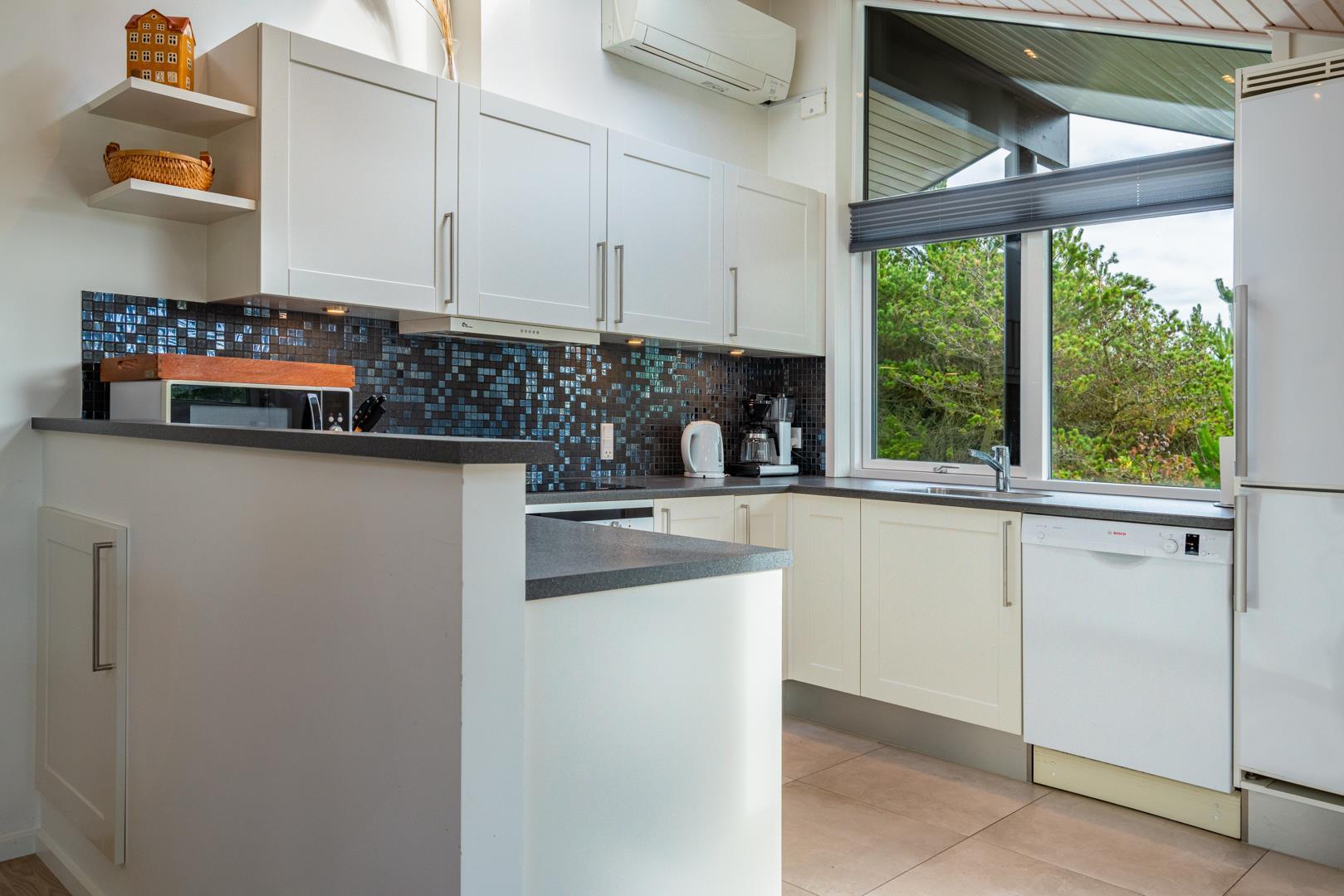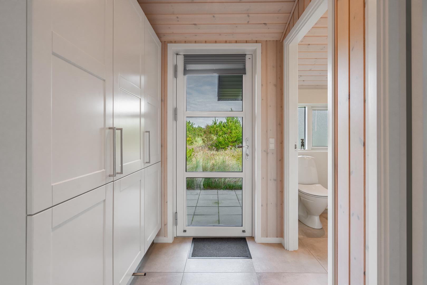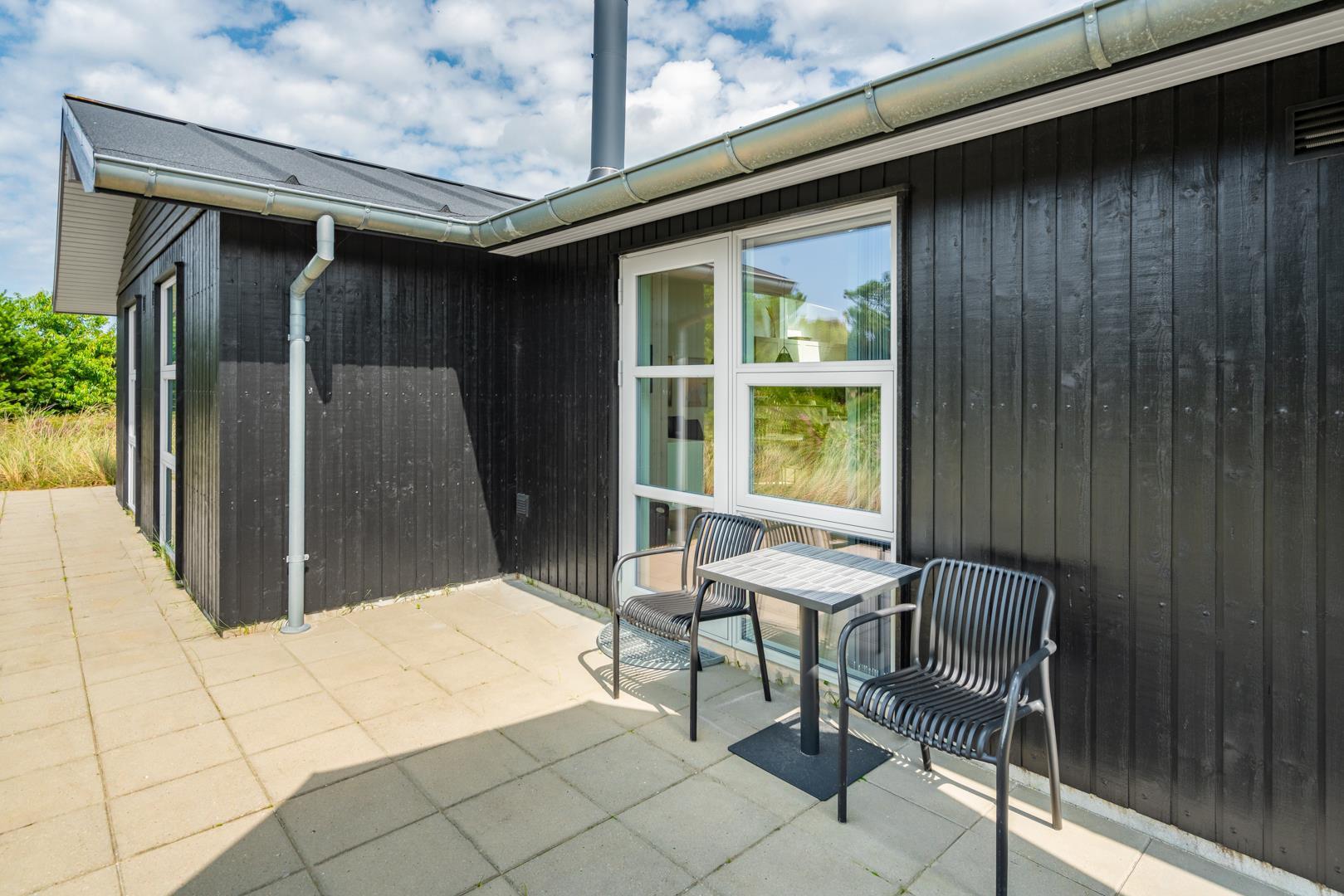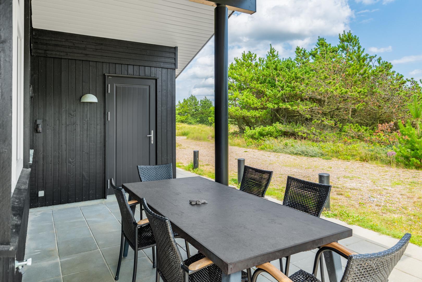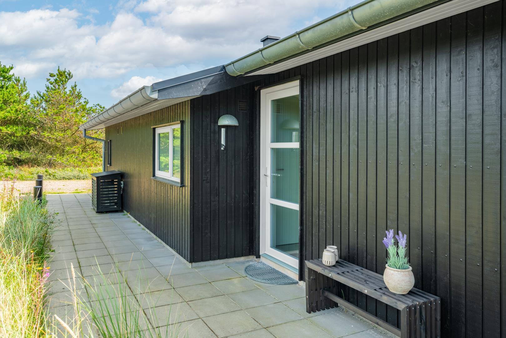 Udendørs kan I nyde to delvist overdækkede terrasser på i alt 100 m2 med havemøbler, liggestole og grill. Børnene kan lege i legehuset med rutchebane, og der er gode læforhold på den store naturgrund. Huset ligger kun 700 meter fra Vesterhavet og 900 meter fra Henne Strands indkøb og restauranter, hvilket gør det til et ideelt udgangspunkt for en afslappende ferie ved kysten.
