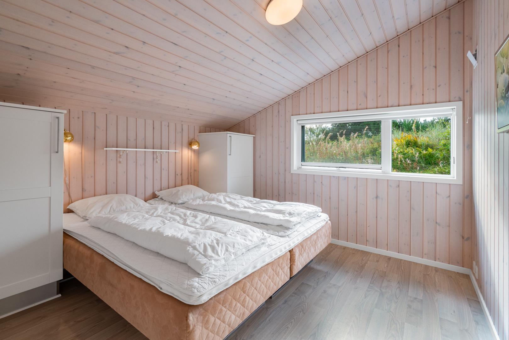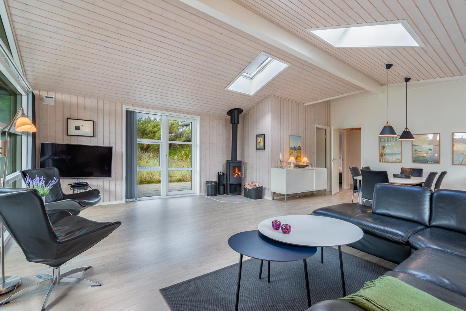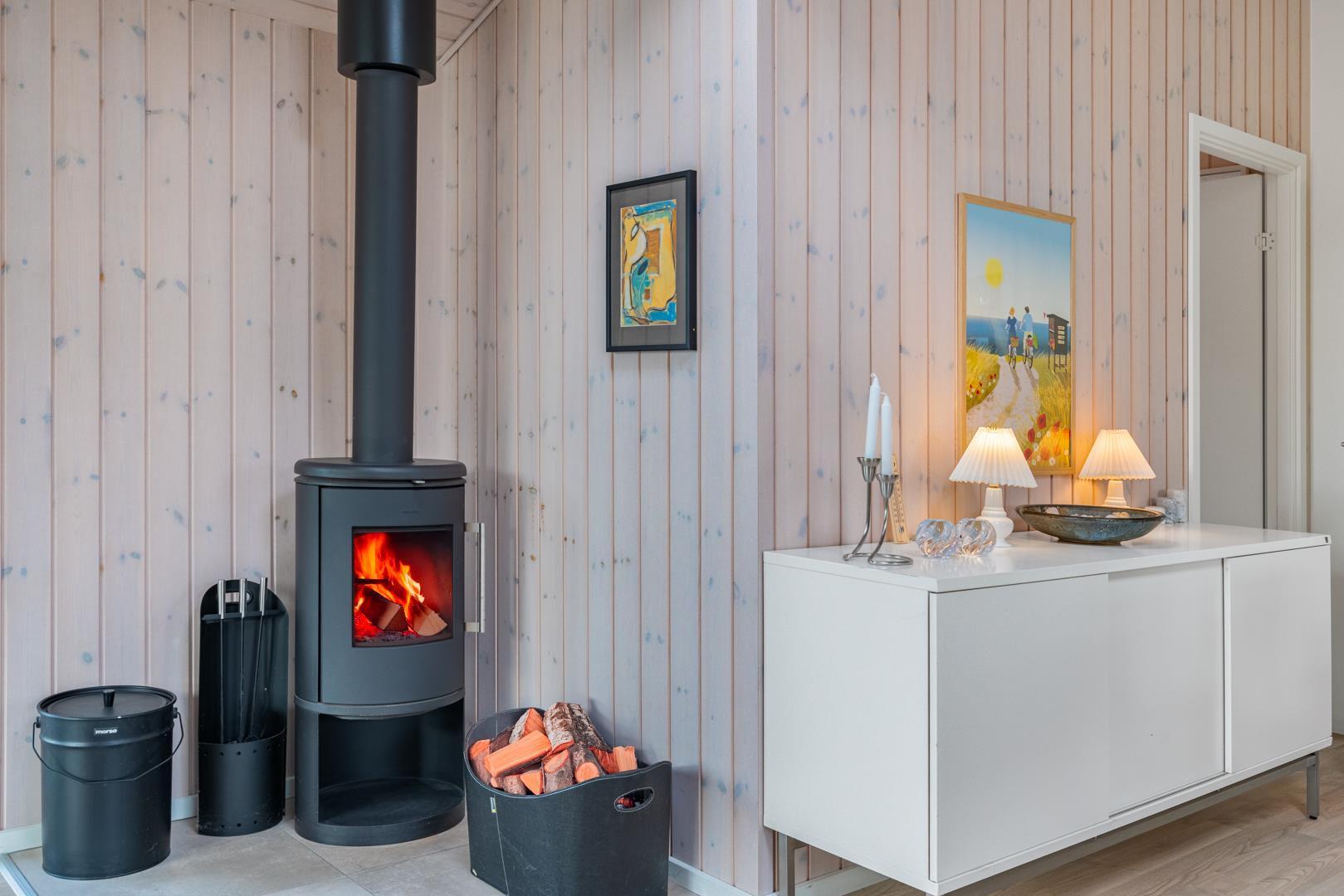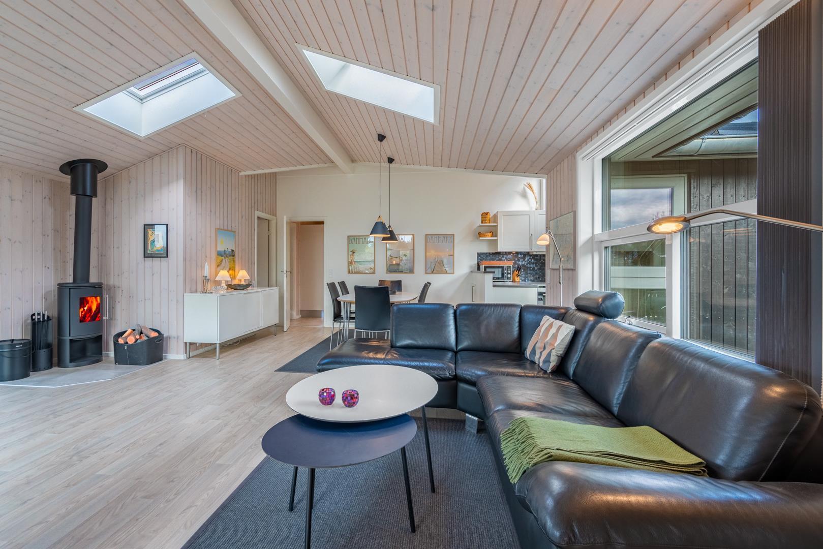 Dette flotte og moderne sommerhus fra 2018 byder på lyst og venligt interiør med åbent køkken og en stor stue med brændeovn. Huset har tre gode soveværelser og to badeværelser, hvor det ene er udstyret med både sauna og spa for ekstra velvære.