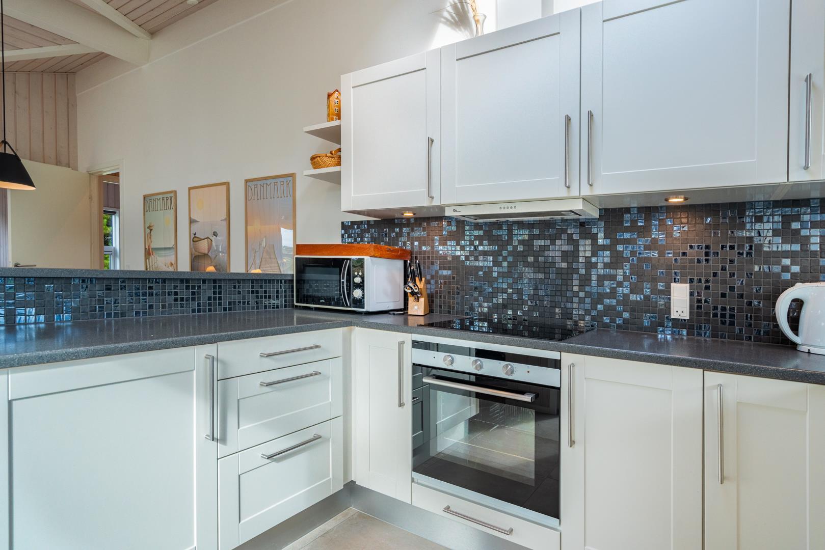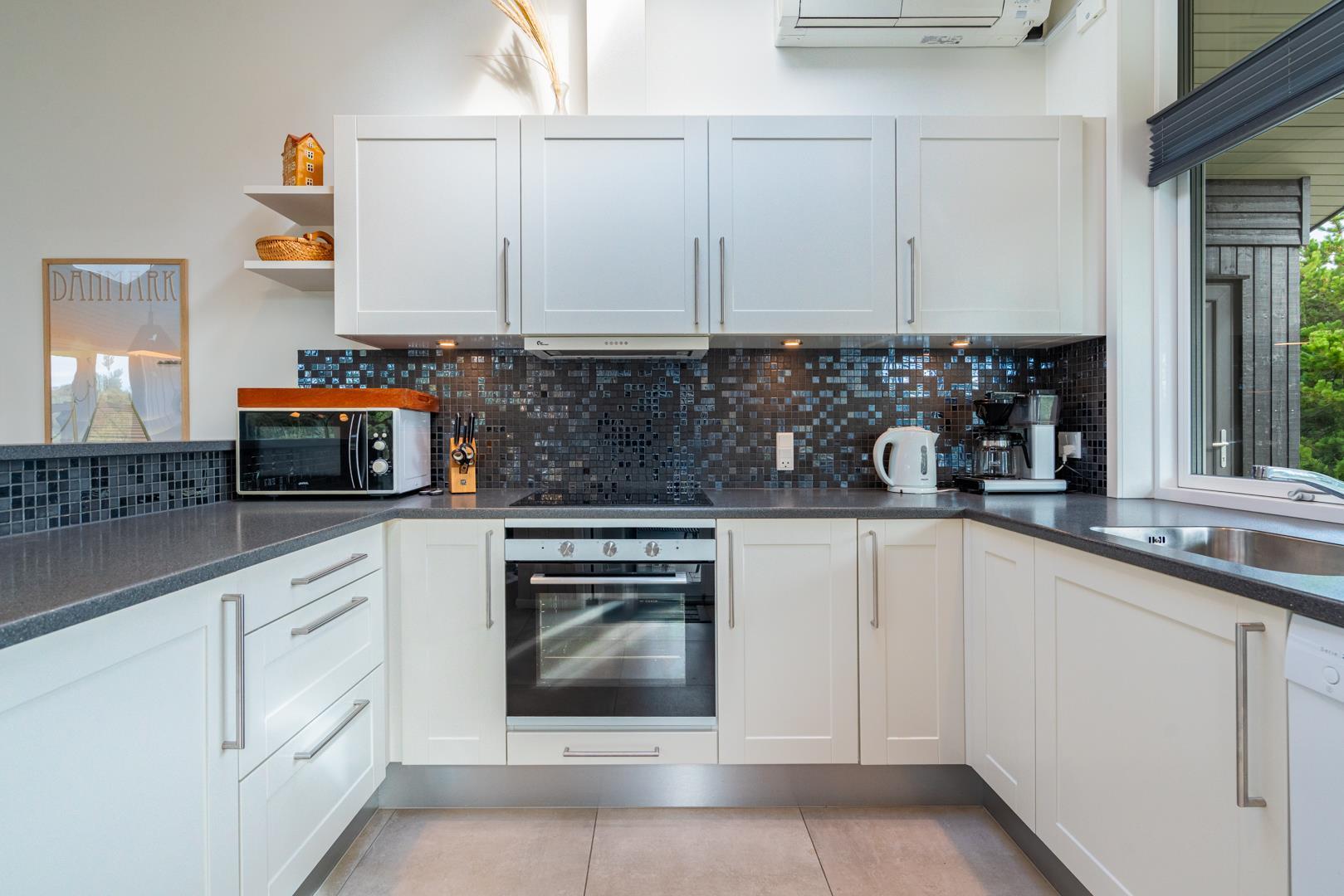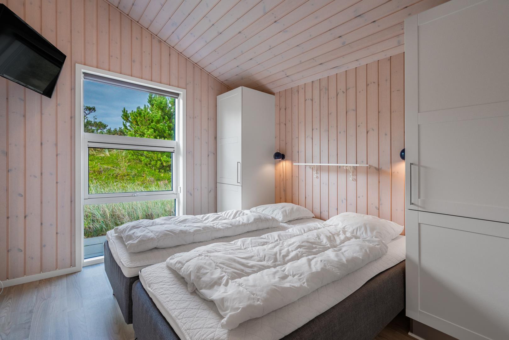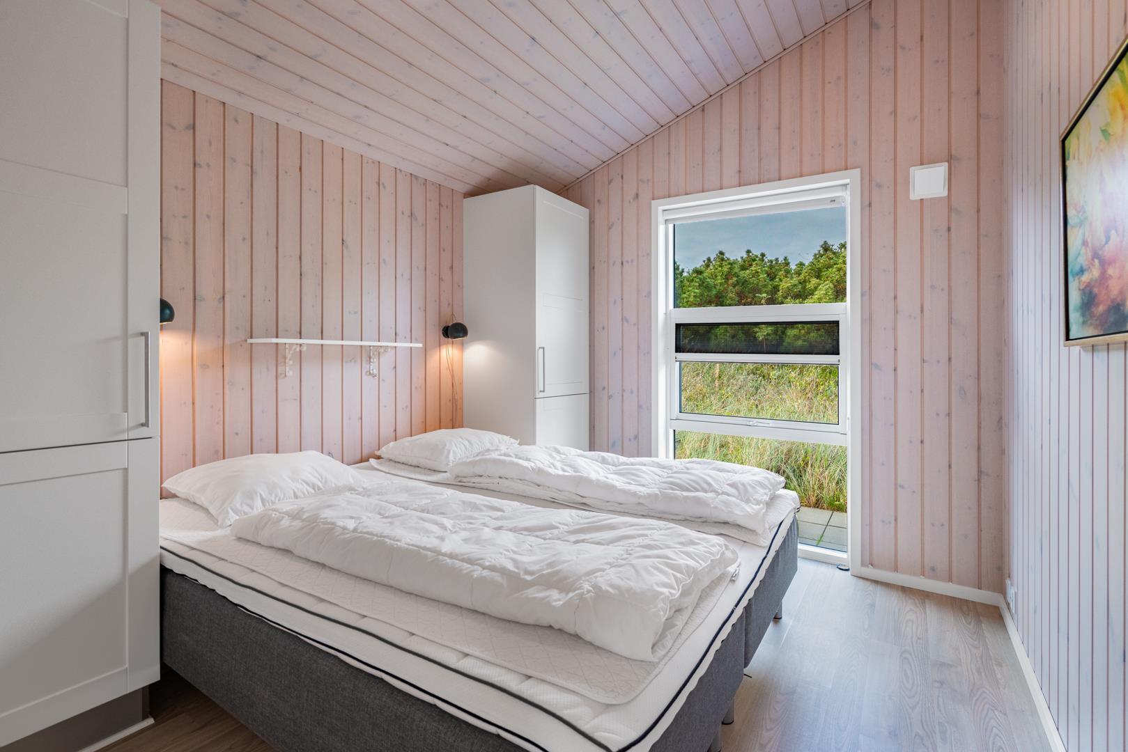 Dette flotte og moderne sommerhus fra 2018 byder på lyst og venligt interiør med åbent køkken og en stor stue med brændeovn. Huset har tre gode soveværelser og to badeværelser, hvor det ene er udstyret med både sauna og spa for ekstra velvære.