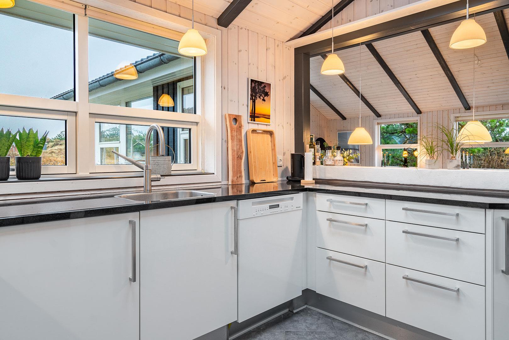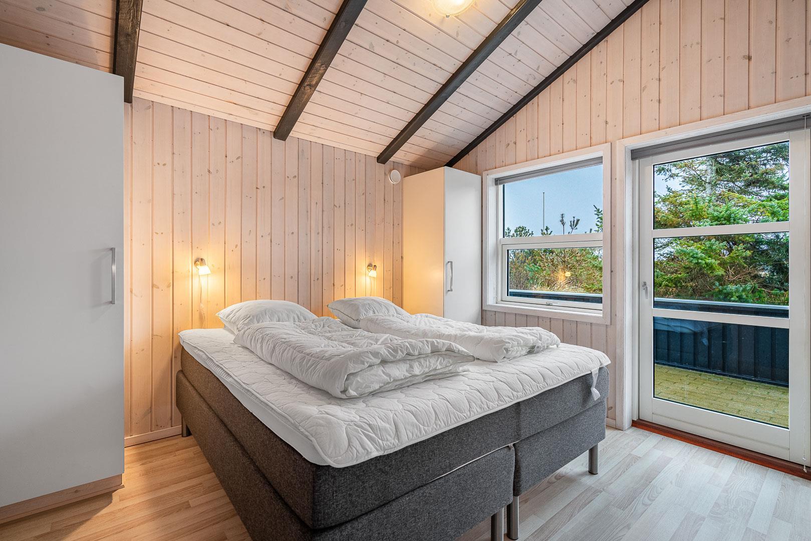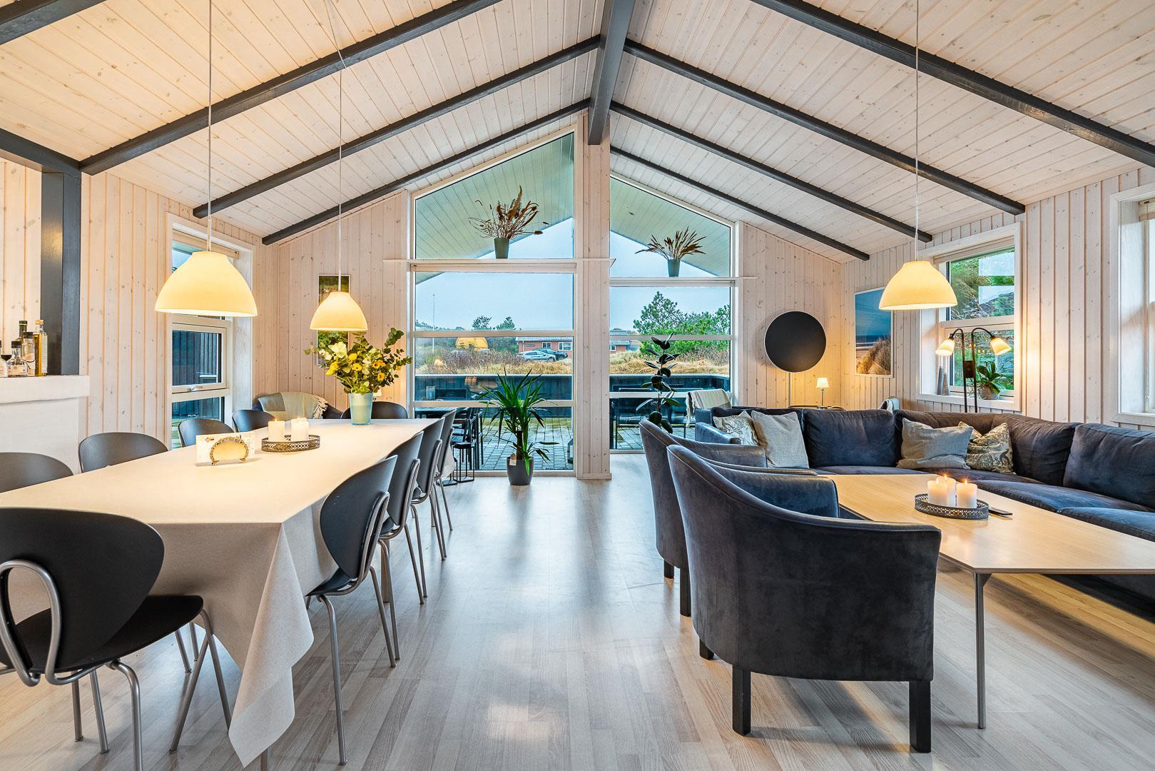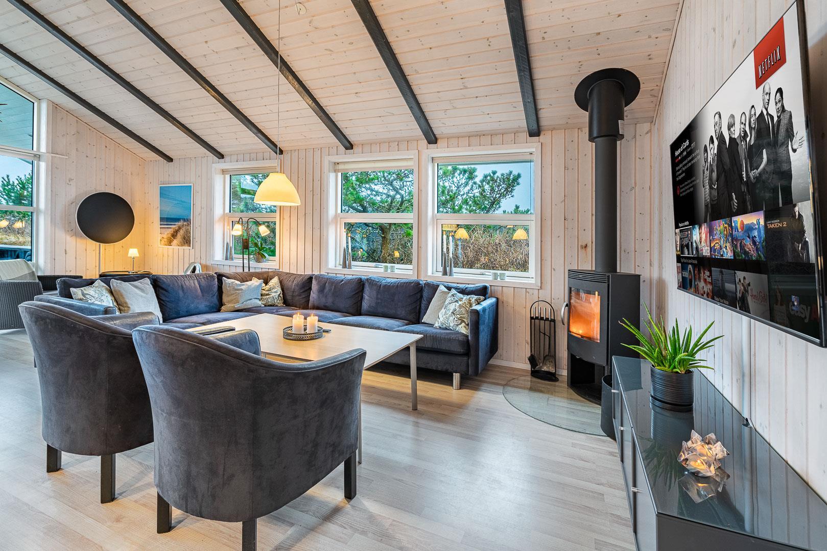 Velkommen til dette fantastiske sommerhus i Henne Strand ved Vestkysten, der kan rumme op til 10 personer. Hvert hjørne af dette sommerhus er indrettet med smagfulde og lyse materialer, der skaber en dejlig atmosfære. Et stort og lækkert køkken ligger i åben forbindelse med den fine stue med brændeovn og god plads til alle. Stuen er rummelig og indbydende, perfekt til både afslapning og socialt samvær. Fra stuen er der udgang til den dejlige store terrasse, hvor du kan slappe af i den luksuriøse udendørsspa og nyde den friske luft. Terrassen strækker sig næsten rundt om hele sommerhuset - hvert soveværelse har sin egen udgang, så du kan nyde morgensolen eller aftensolen i fulde drag. I feriehusets finder du 5 soveværelser hvoraf alle er med skønne dobbeltsenge.