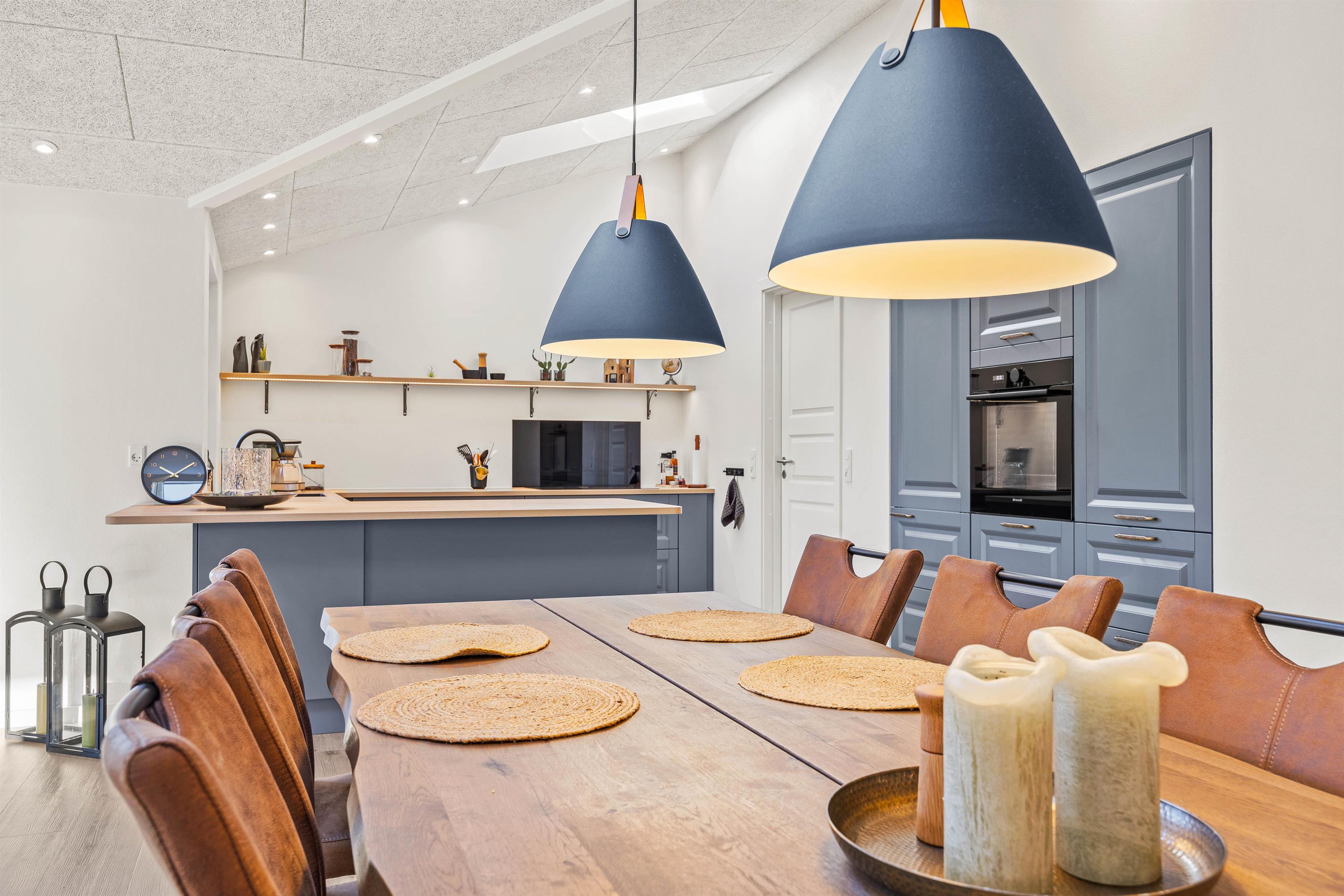 Indenfor byder sommerhuset på en harmonisk kombination af smagfuld indretning og moderne bekvemmeligheder, hvor hver detalje er nøje gennemtænkt. De 8 sovepladser fordelt på 4 komfortable soveværelser med dobbeltsenge sikrer en god nats søvn for alle gæster. Det elegante blå køkken fungerer som sommerhusets hjerte – et naturligt samlingspunkt for hyggelige stunder med madlavning og fælles måltider.