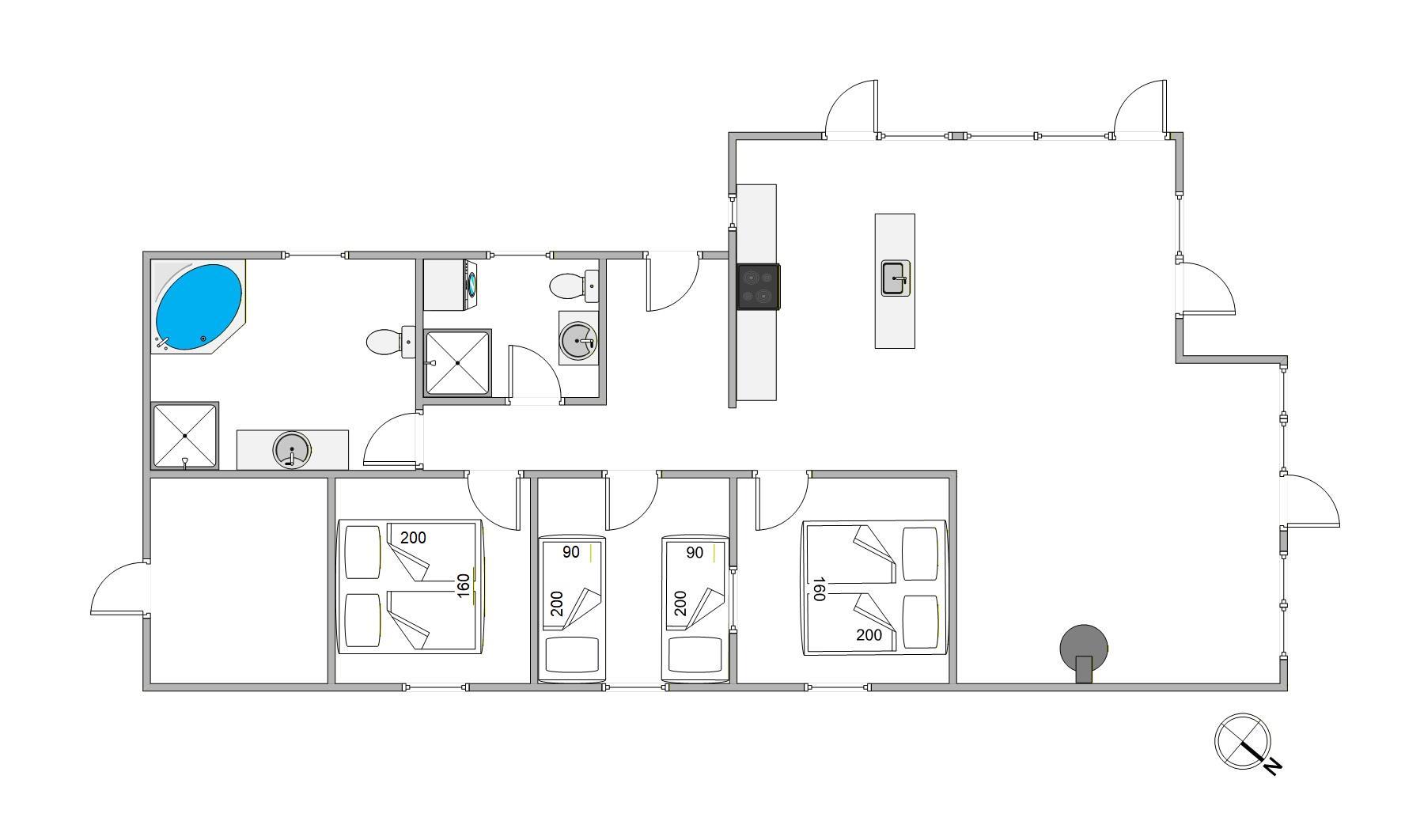 Sommerhuset rummer op til 6 personer og er indrettet med fokus på både komfort og funktionalitet. De 3 lyse soveværelser er fordelt på 2 værelser med dobbeltsenge og ét med 2 enkeltsenge – her er der god plads til både familier og vennepar. De 2 rummelige badeværelser har gulvvarme, og på det ene badeværelse kan I nyde et afslappende bad i spabadet efter en lang dag i naturen.