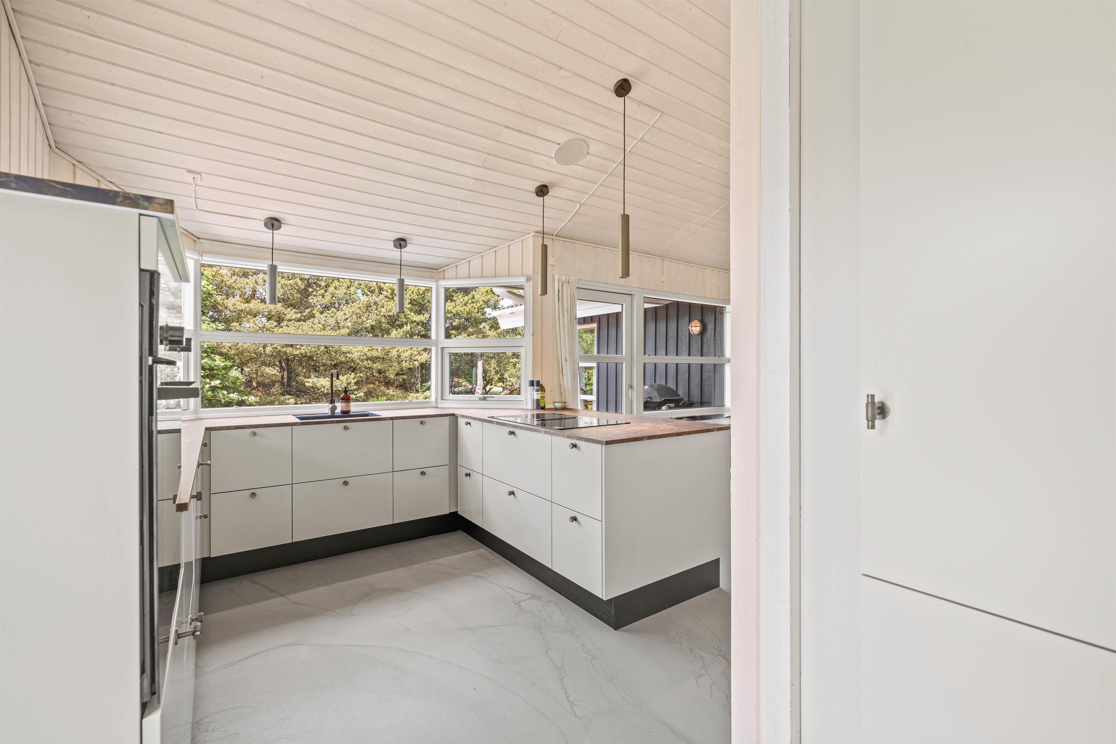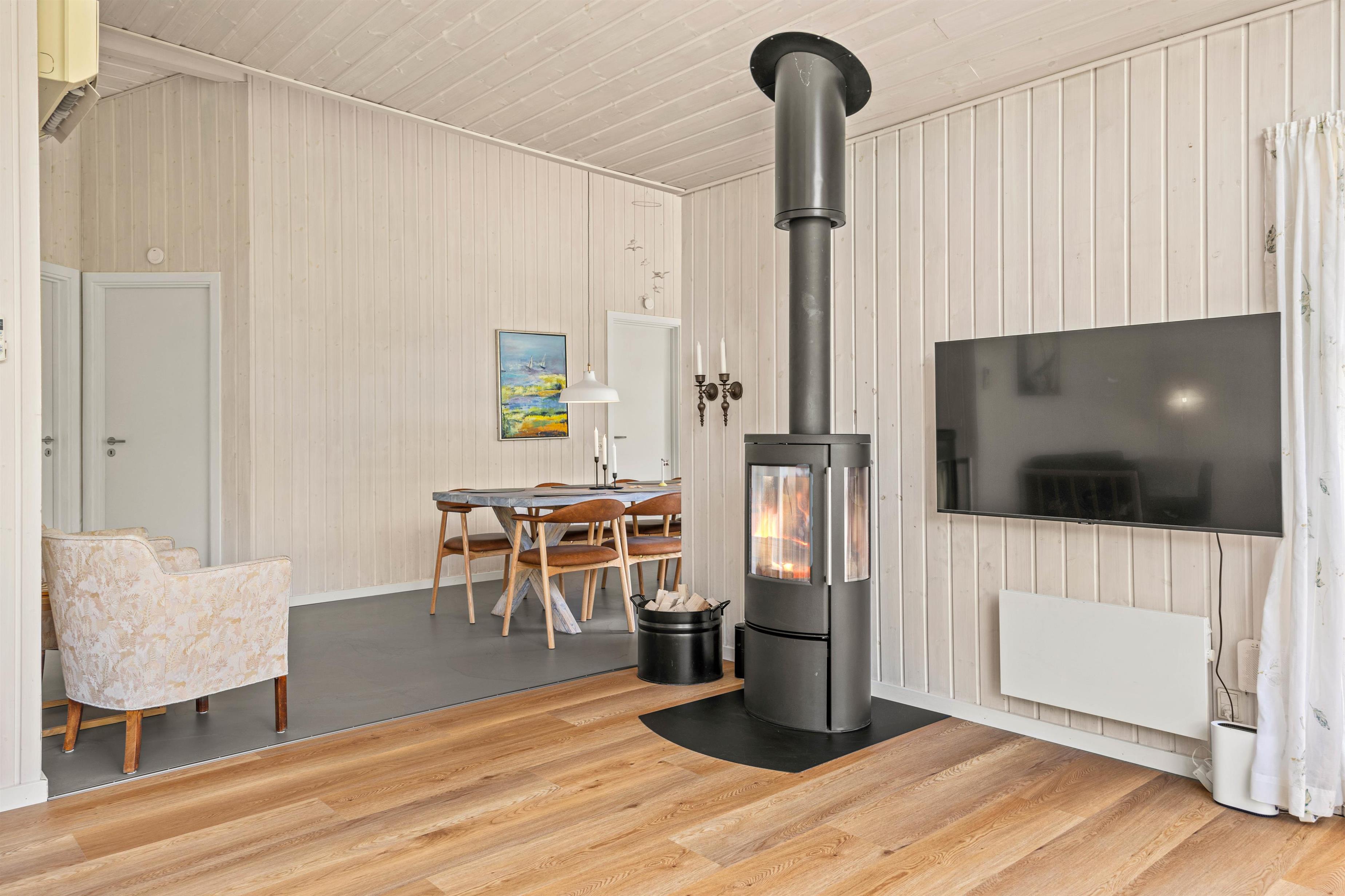Sommerhuset er renoveret i 2025 og fremstår lyst og indbydende. I husets centrale alrum smelter stue og køkken sammen i ét åbent rum, hvor der er god plads til både fælles måltider og hyggelige stunder foran brændeovnen. Varmepumpen sørger for et behageligt indeklima året rundt, og med både Chromecast og internet har I gode muligheder for underholdning, når I vil koble af med en film eller serie. Der er også Bluethooth højtaler i køkken.