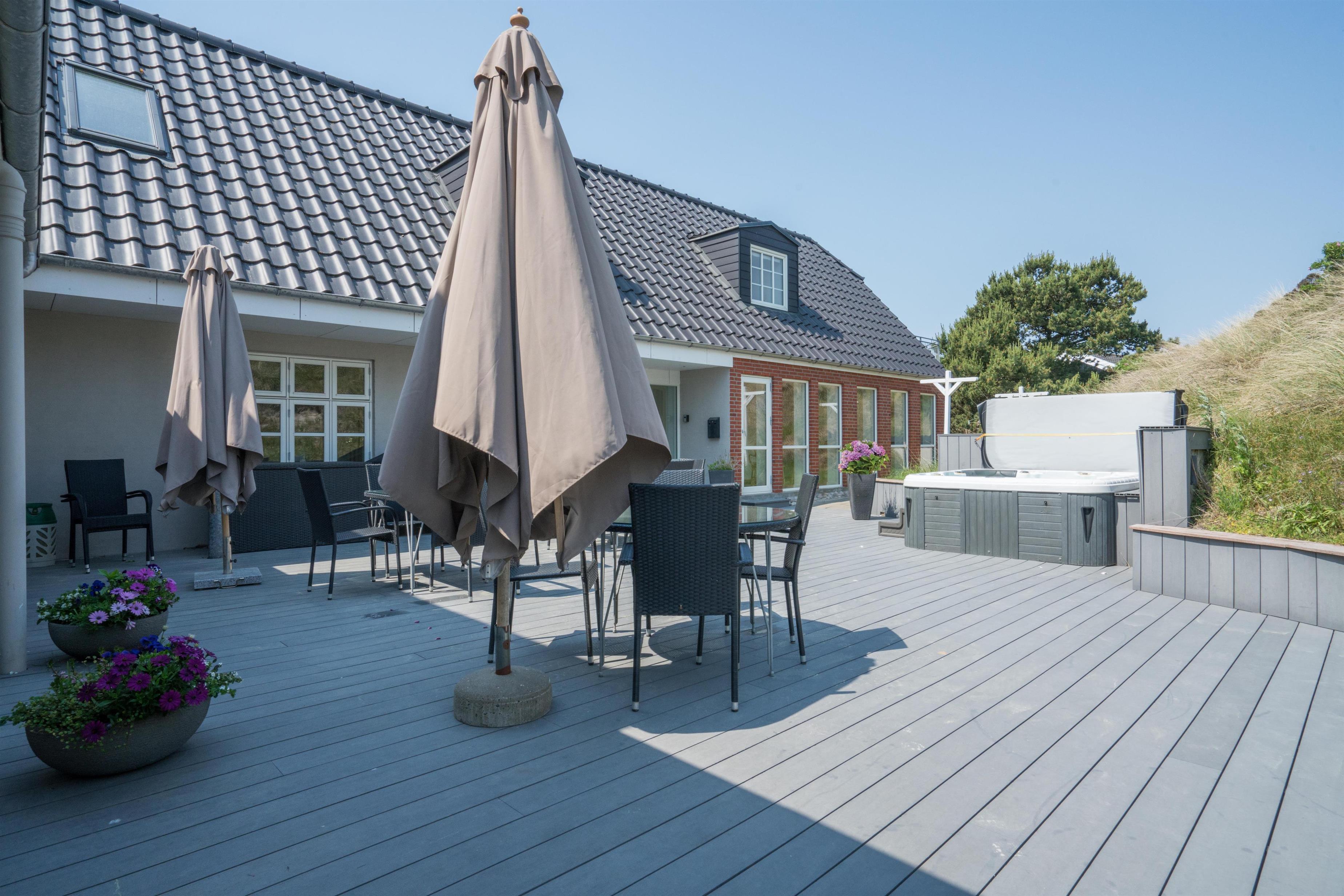 På 1 sal kan man samles til hygge og afslapning. Der er herfra adgang til den nord-vest vendte altan som byder på flotte solnedgange med en malerisk udsigt ud over det spændende sommerhusområde. Der er tre store møblerede terrassemiljøer rundt om huset.
