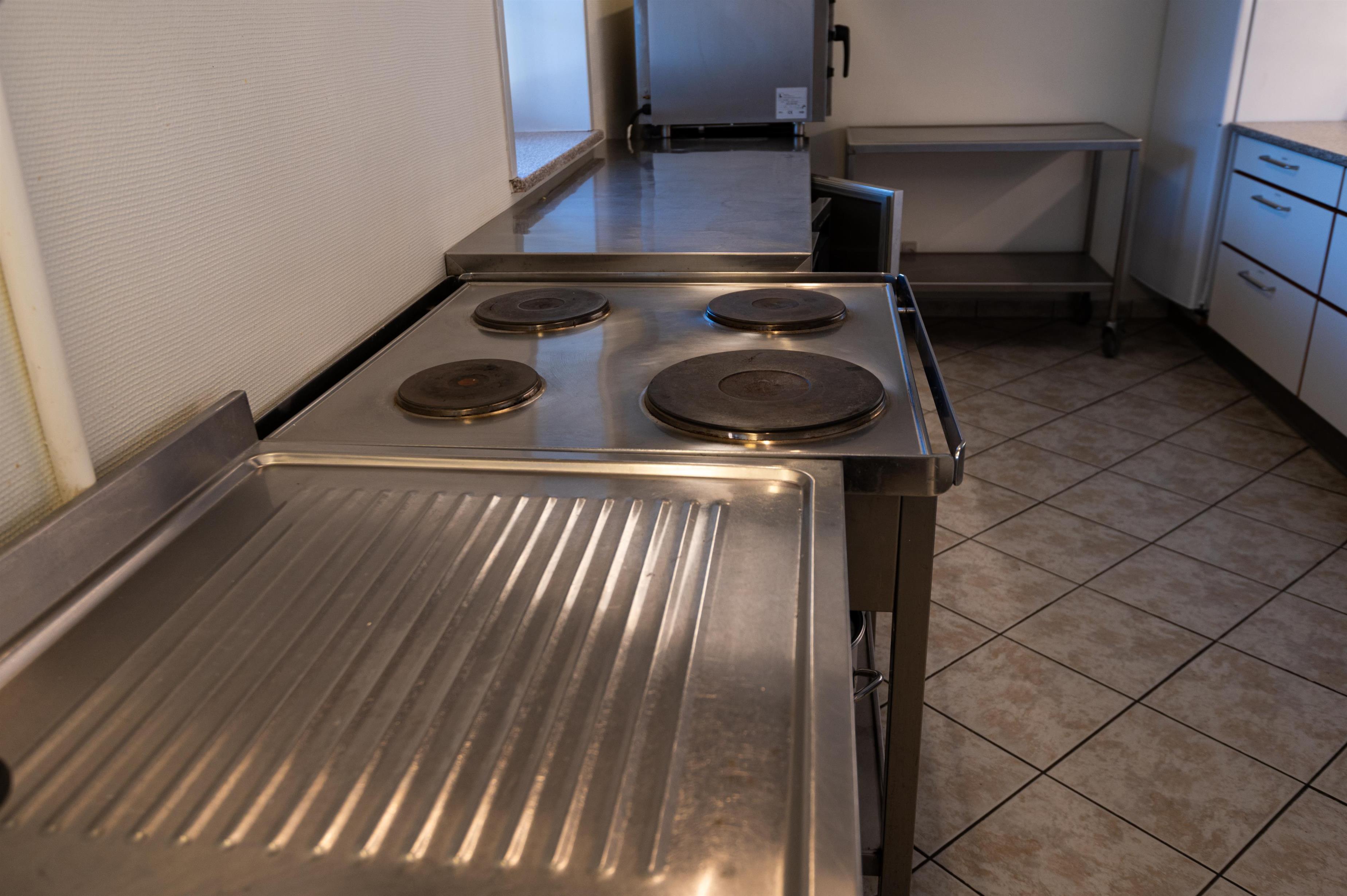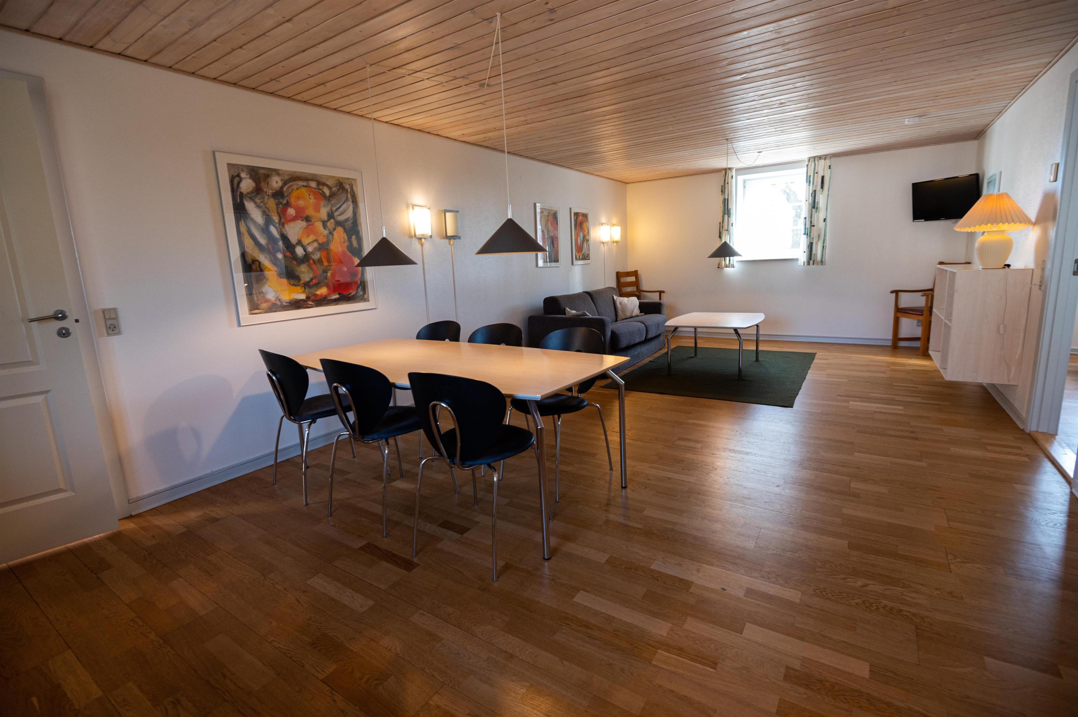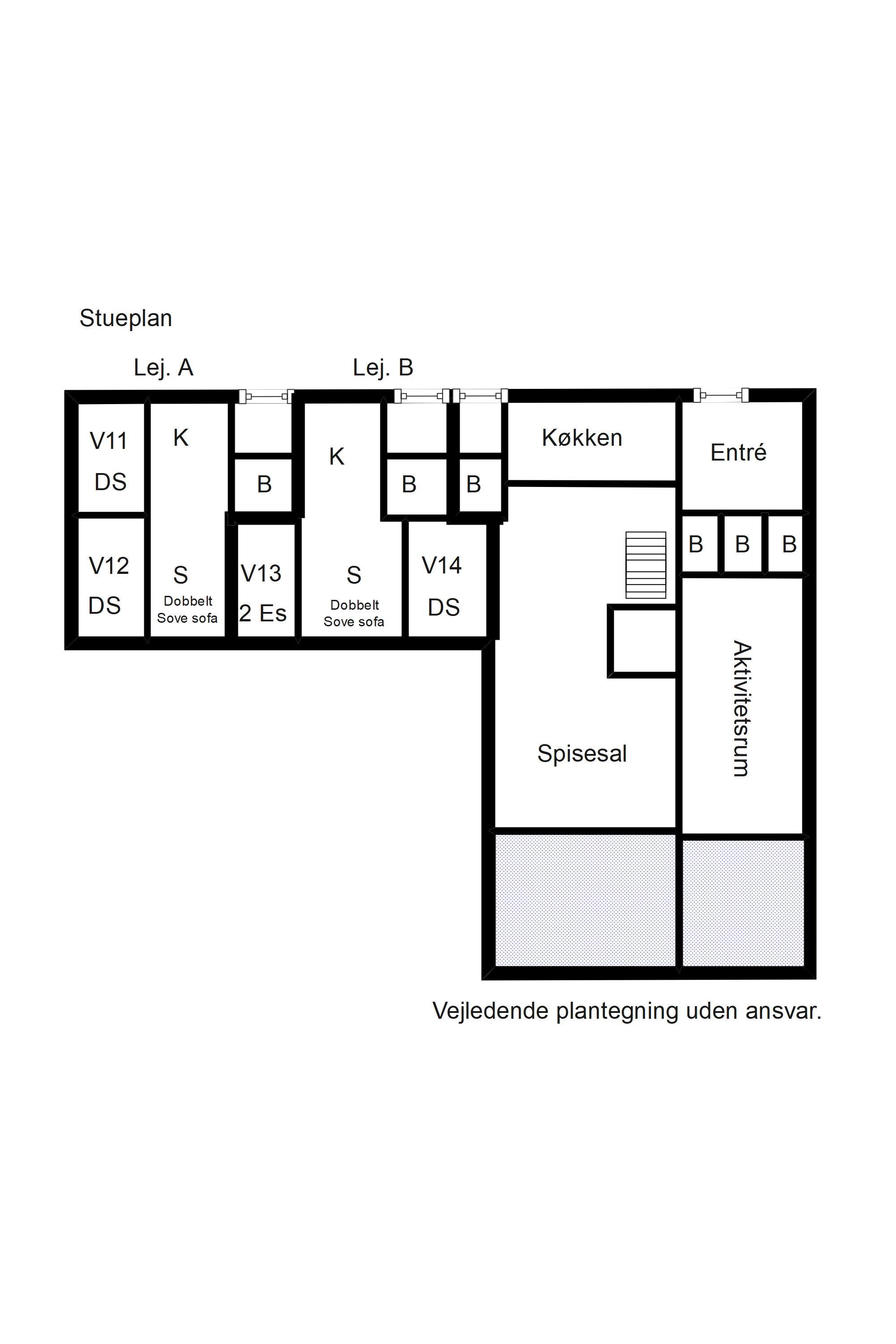 Hovedhuset indeholder et aktivitetsrum med pool, bordfodbold, dart og X-box spillemaskine, en spisestue med tilhørende industrikøkken med service til 60 personer, industriopvaskemaskine, stegeovn og alt til madlavning I køkkenet er der en madelevator op til 1 salen hvor opholdsstue, værelsesfløj og konference lokalet findes.