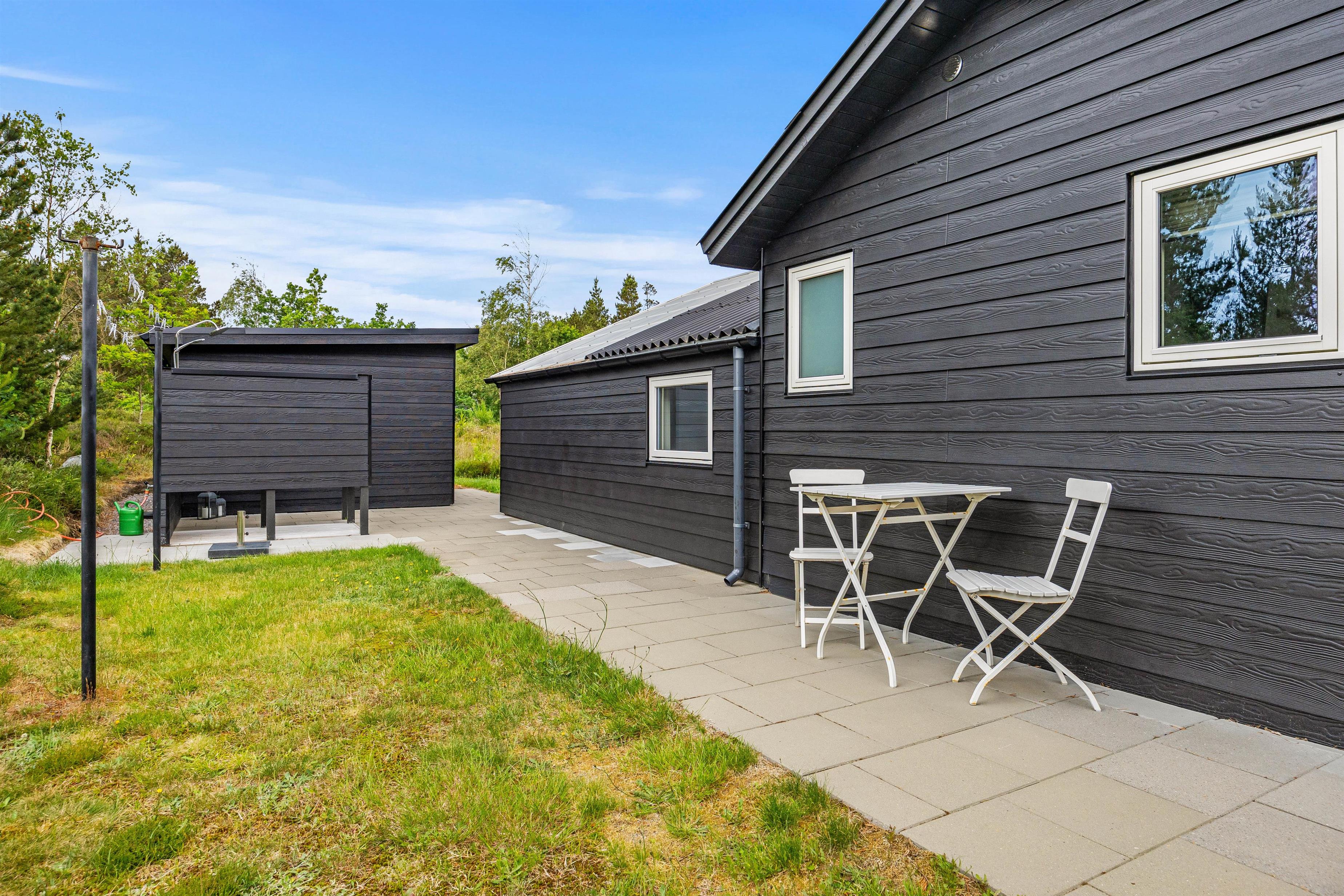 Sommerhuset er indrammet af en dejlig terrasse, hvor I kan slappe af i de komfortable havemøbler, solbade på liggestolene, spise udendørs eller trække jer tilbage med en god bog. I kan altid finde en rolig plet til en af siderne. Hvis solen er for stærk, kan en hurtig douche under udebruseren* friske op. Tænd op i gasgrillen og slut dagen af med et lækkert grillmåltid, imens skyggerne bliver lange.