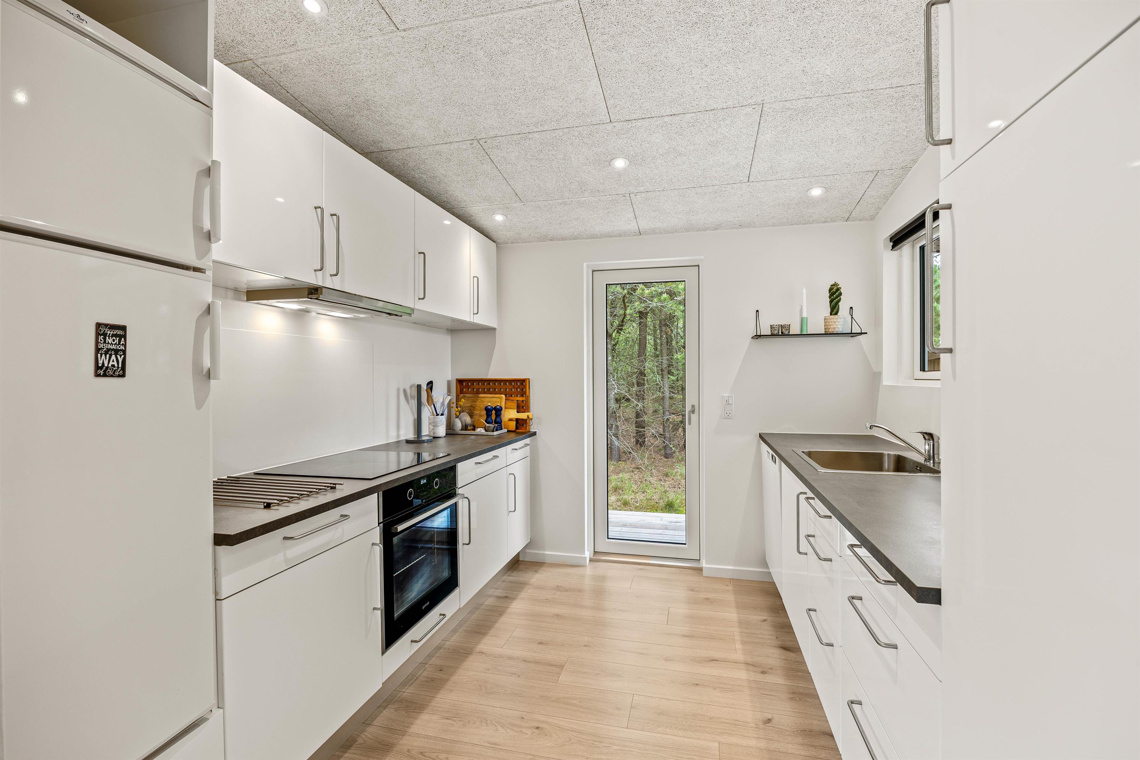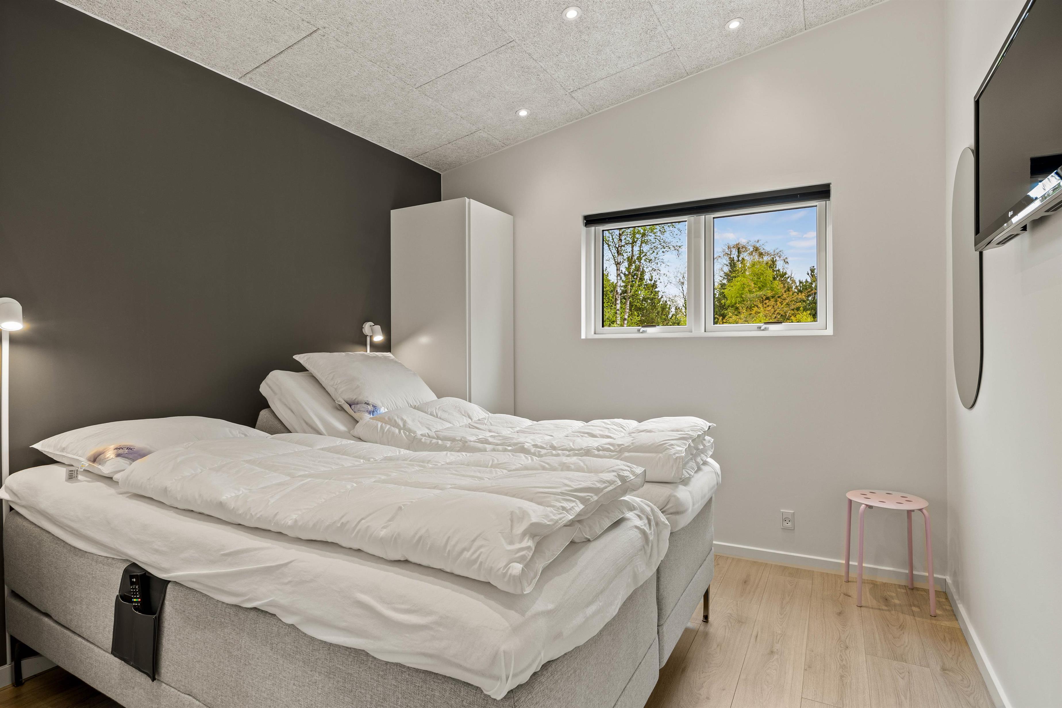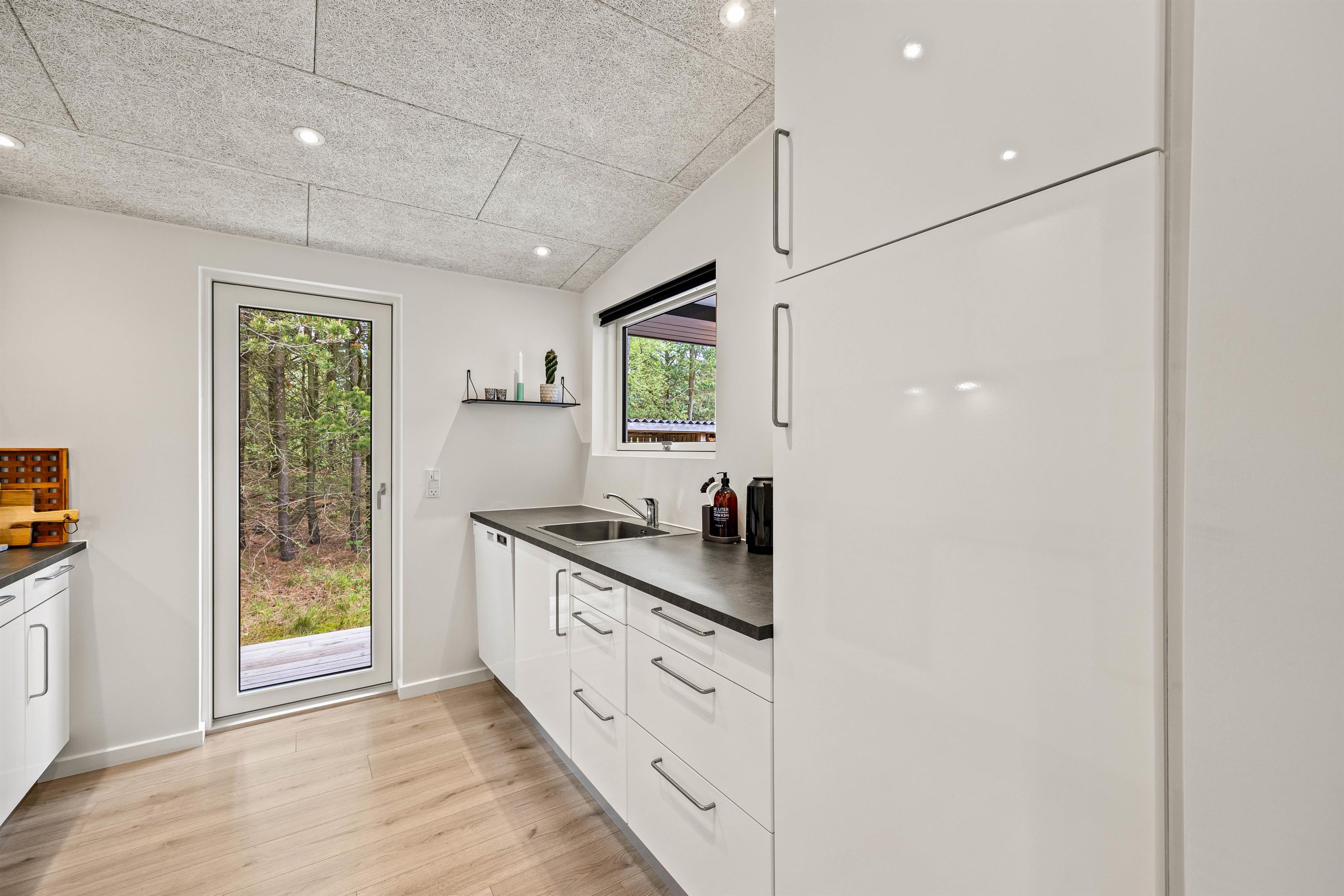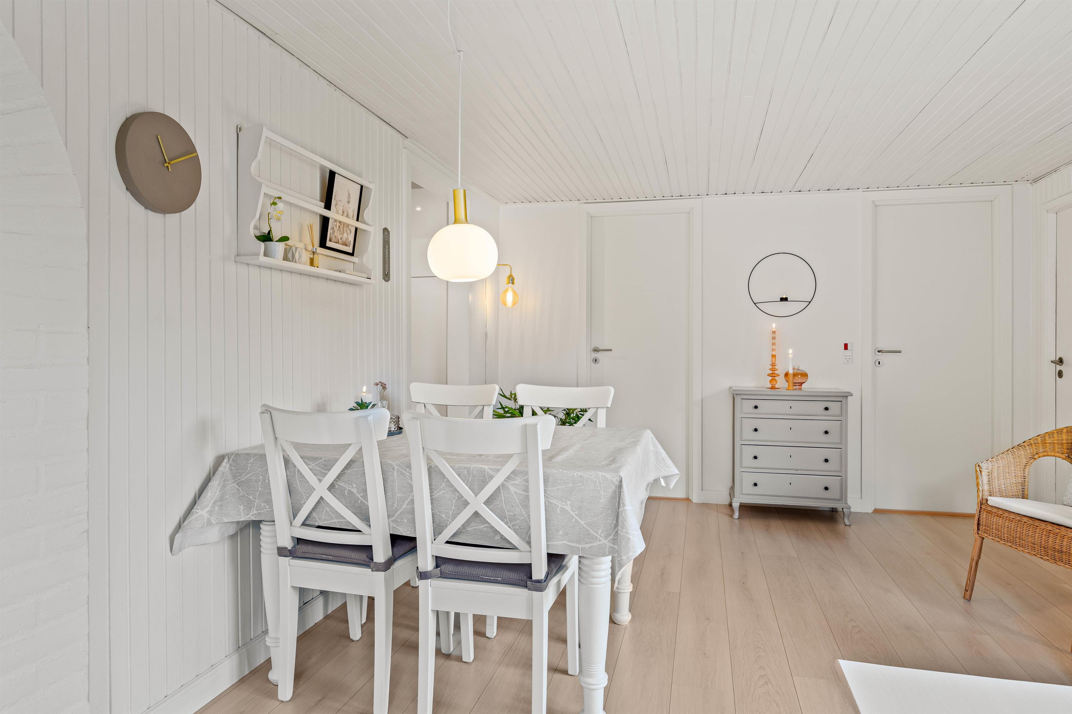 I vil føle jer hjemme, straks I træder ind i det hyggelige sommerhus på 50 m2. I opholdsstuen kan I hygge jer i sofaen med TV eller en god bog. Ved spisebordet vil de fleste af jeres hjemmelavede måltider nok blive indtaget. Køkkenet indeholder alt, hvad I har brug for, for at forkæle hinanden med lækre måltider. Der er 2 soveværelser med dobbeltsenge til rådighed, så I kan blive godt udhvilede i den friske vesterhavsluft. Badeværelse med gulvvarme, så I ikke behøver at få kolde fødder. Moderne faciliteter, som opvaskemaskine, vaskemaskine og energibesparende varmepumpe er også til rådighed for jer i ferien.