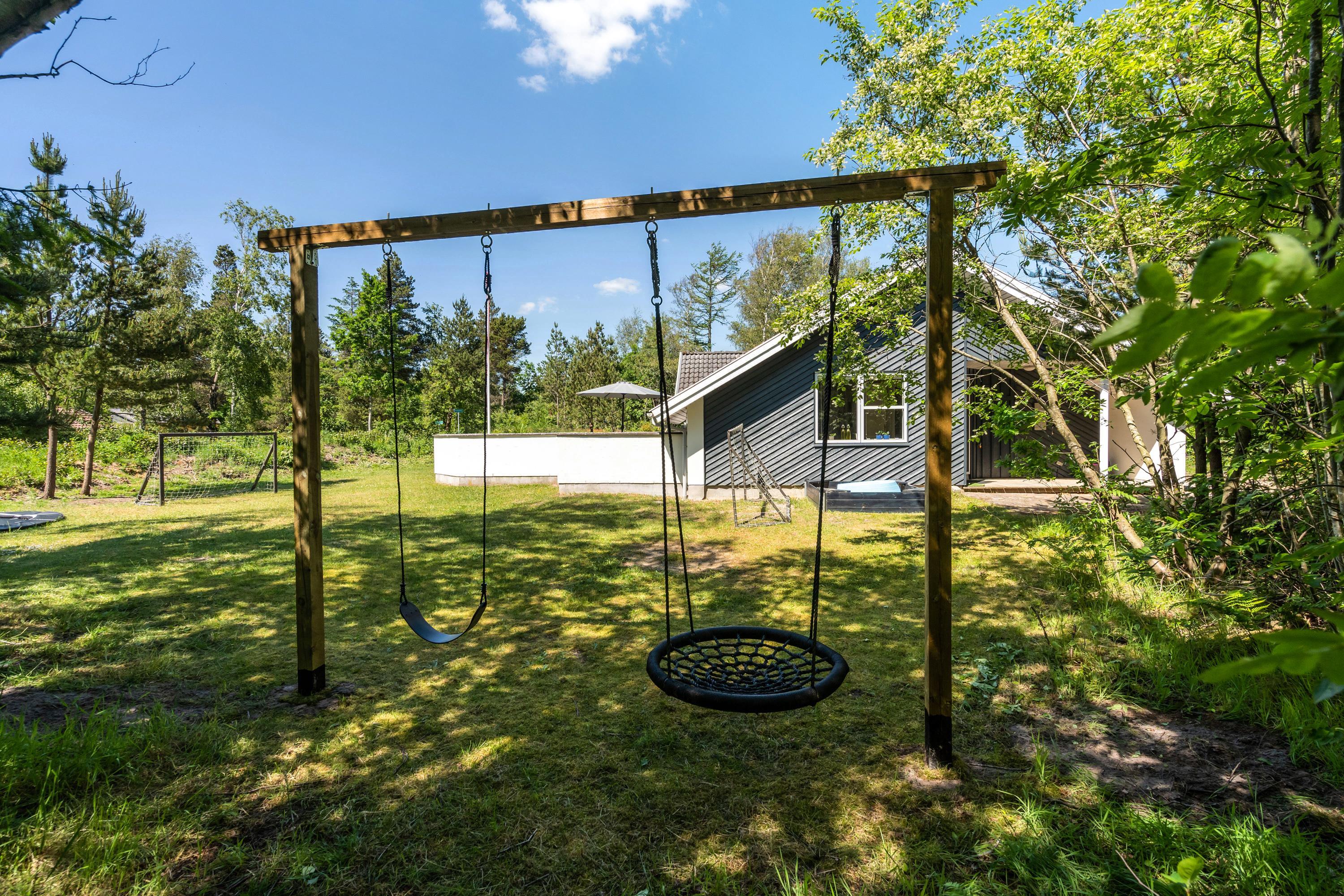 Grund med legeredskaber og masser af sol og læ på den store lukkede terrasse