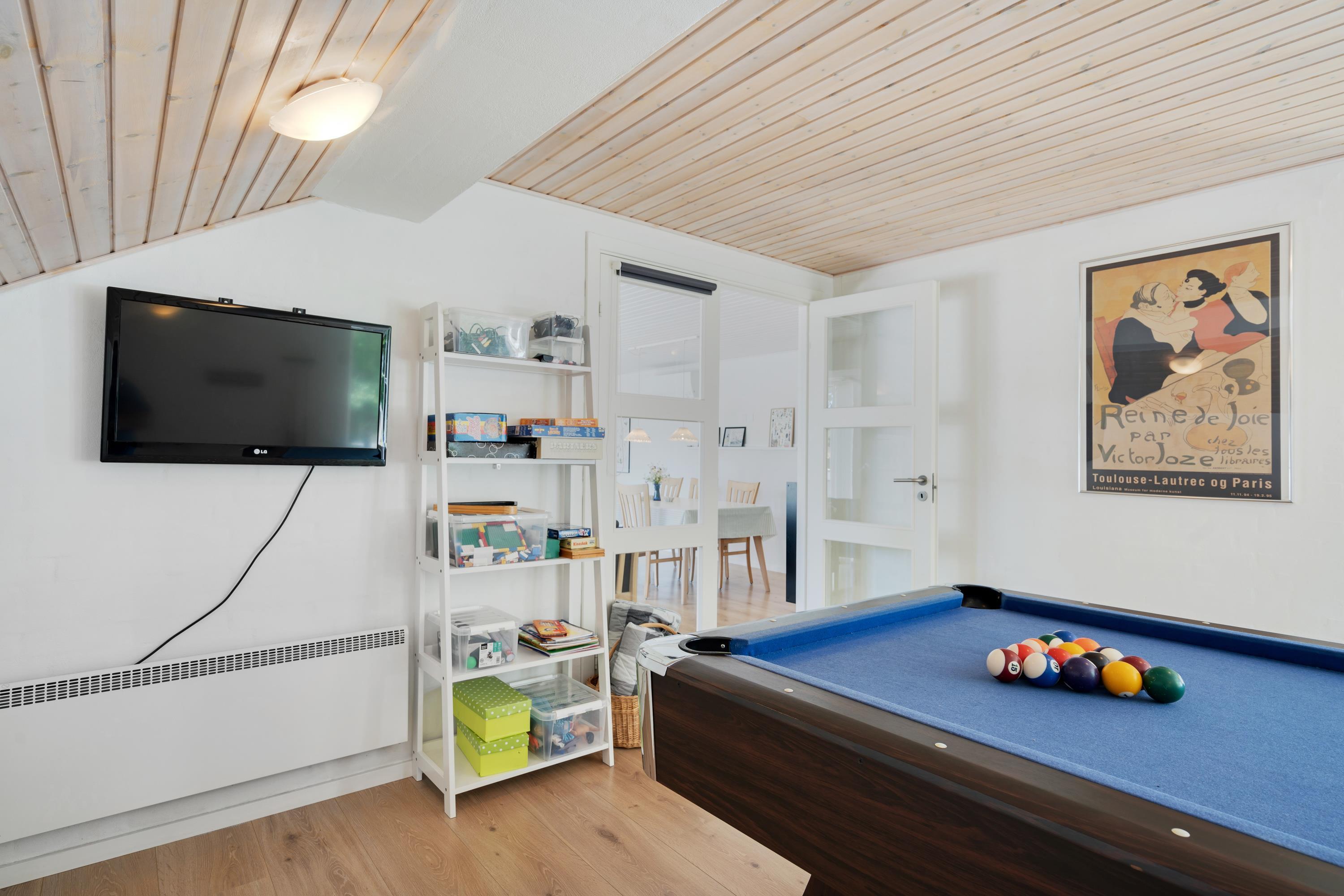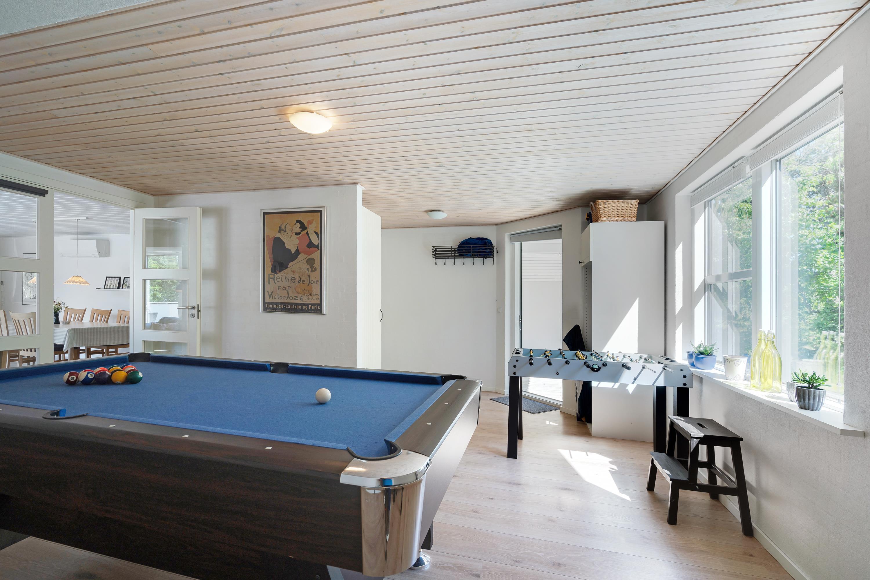 Strandgodsvej 2 er indrettet med alle bekvemmeligheder, 2 badeværelser – det ene med egen ”wellness-afdeling”, vaskemaskine og tørretumbler, et stort velindrettet køkken – naturligvis med opvaskemaskine, stue med brændeovn og det store aktivitetsrum med bordfodbold, billard mm.