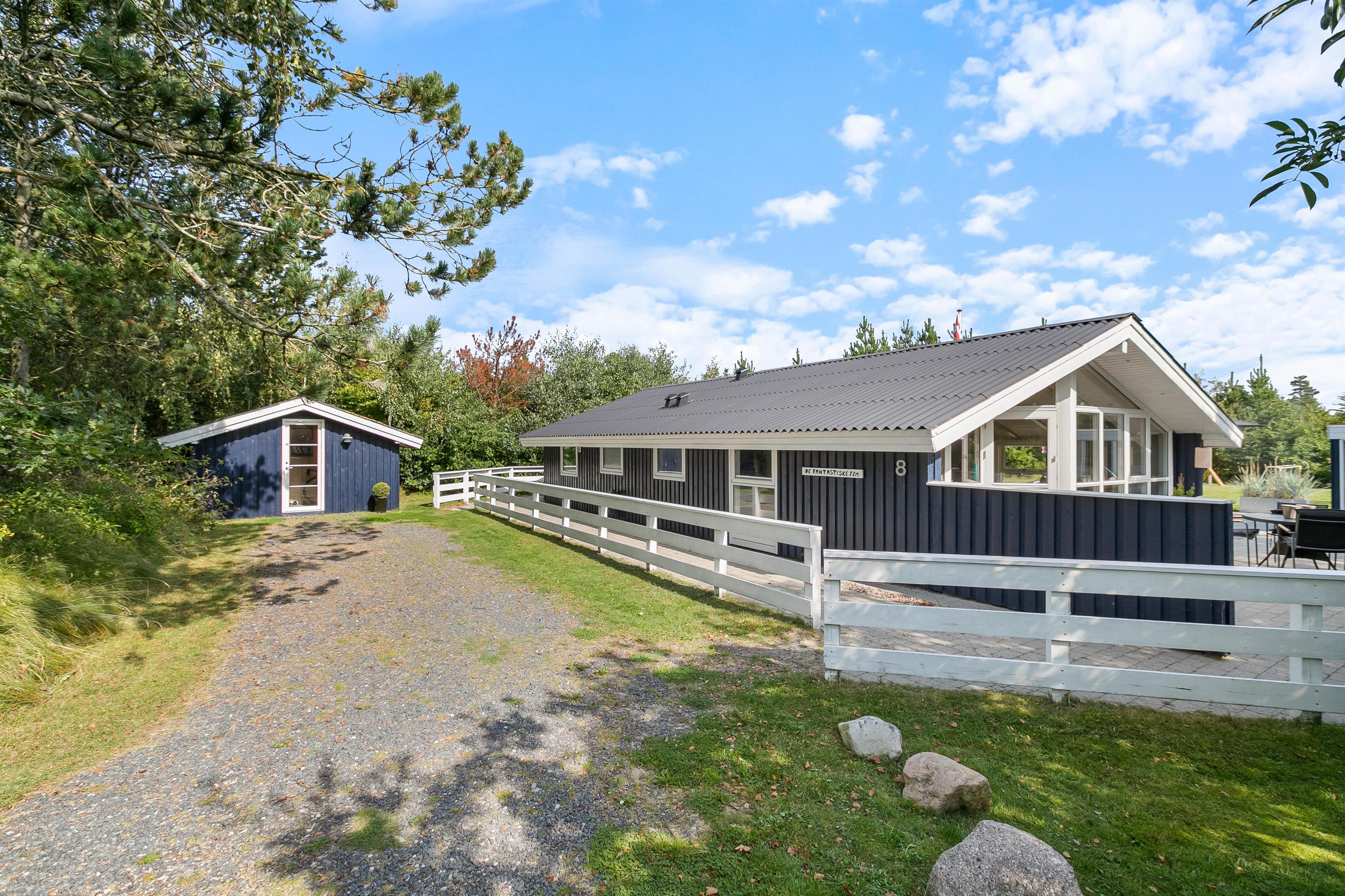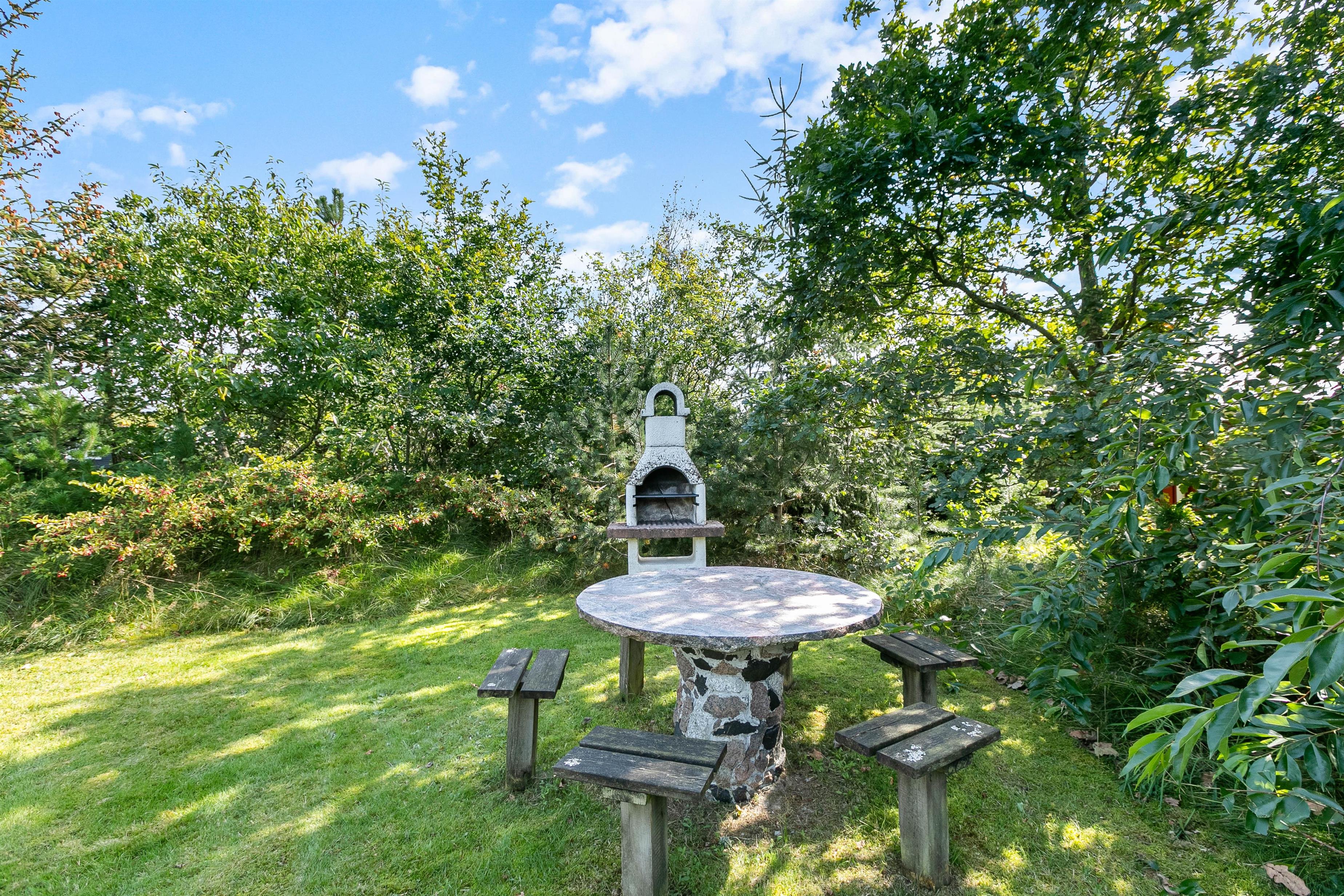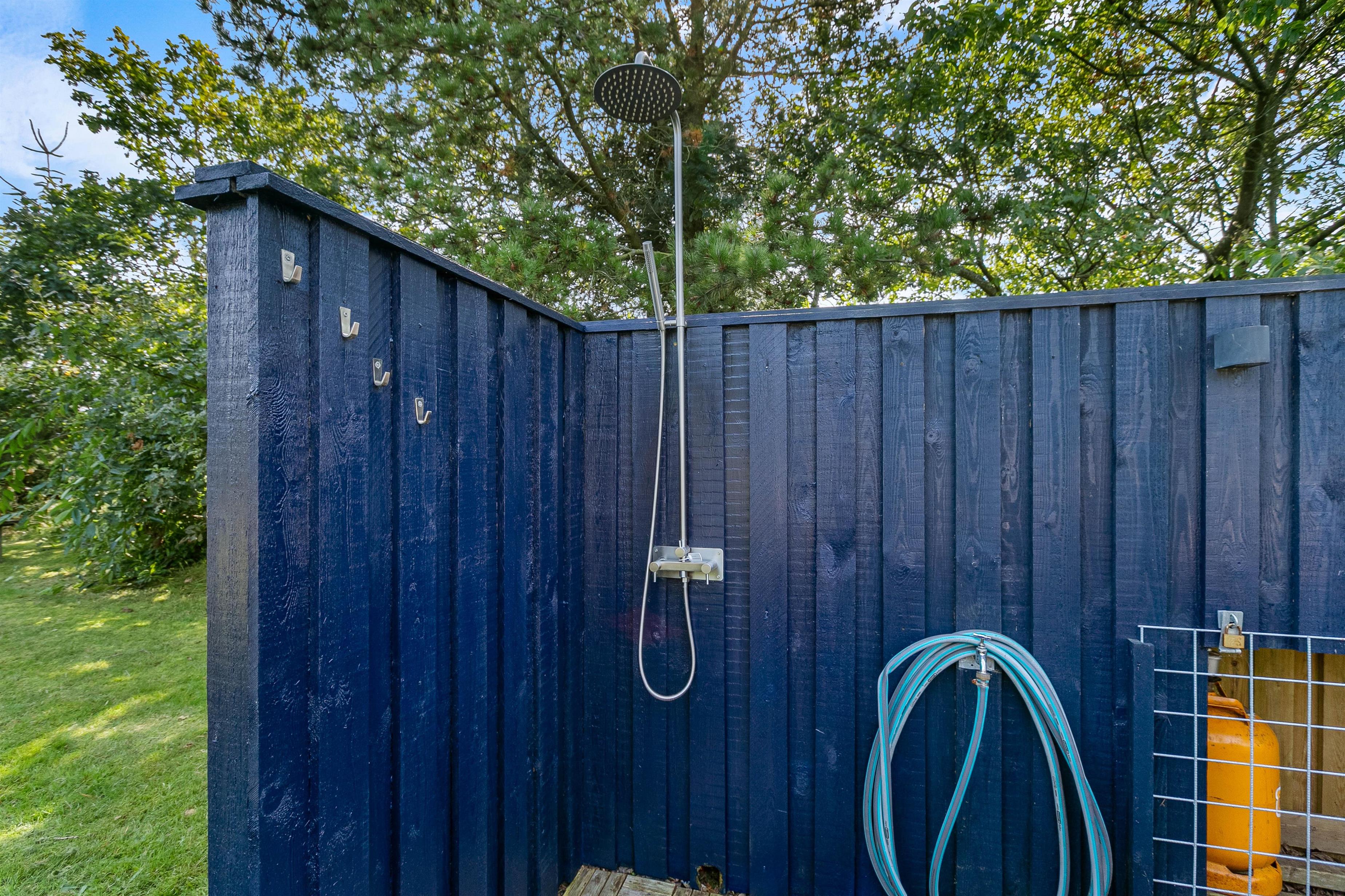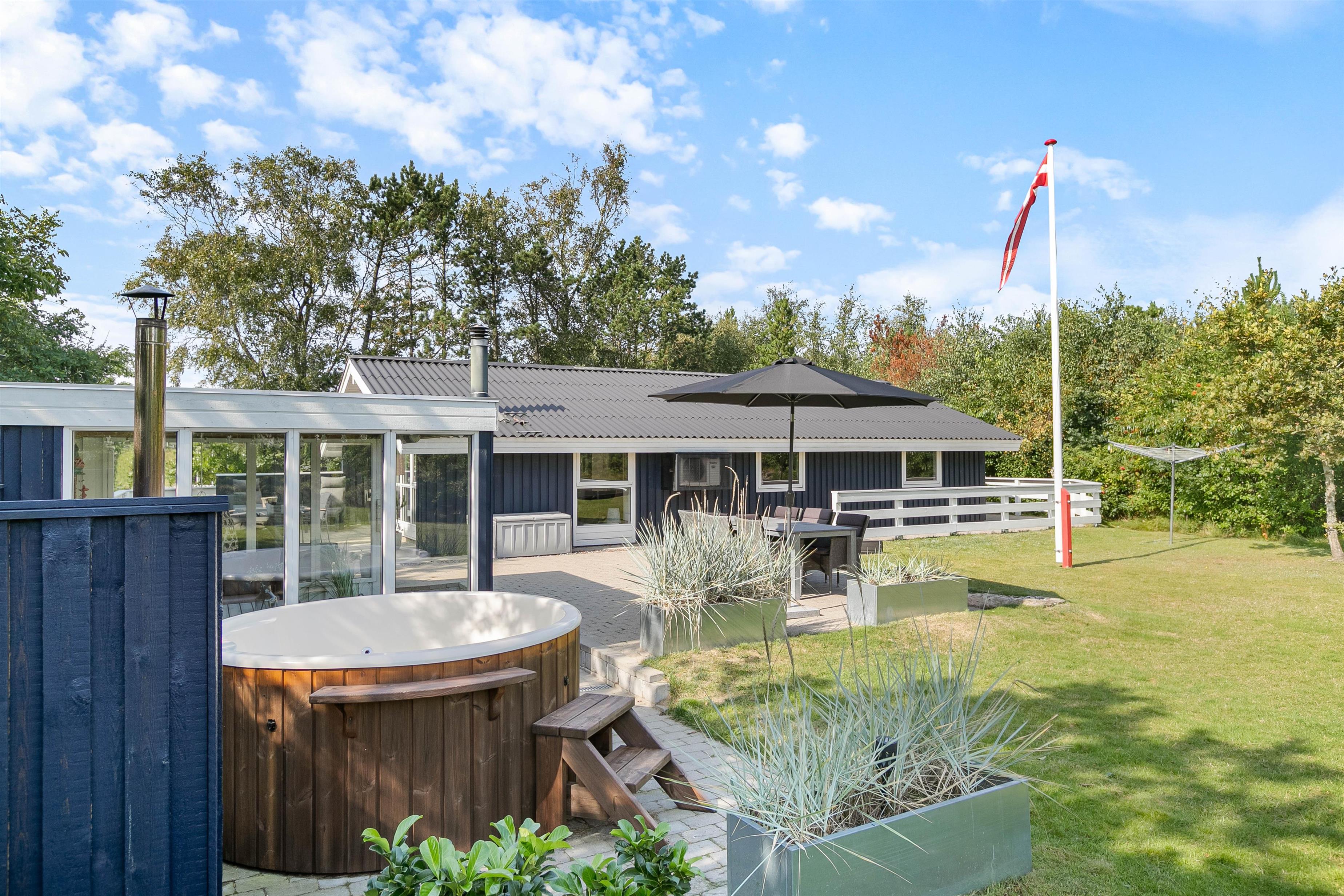 Et højdepunkt på Lunden 8 er klart det dejlige uderum. Her er en stor flisebelagt terrasse, et vildmarksbad og en stor grøn græsplæne! For de yngre gæster er her både sandkasse og gynge, mens en trampolin på den rummelige plænegrund giver mulighed for sjov og leg under åben himmel. Hele familien kan desuden nyde godt af vildmarksbadet, som har plads til 6 personer. På terrassen finder I også en udebruser*, praktisk hvis man hurtigt skal køles ned efter en tur i vildmarksbadet eller skylle tæerne efter en dag på stranden.