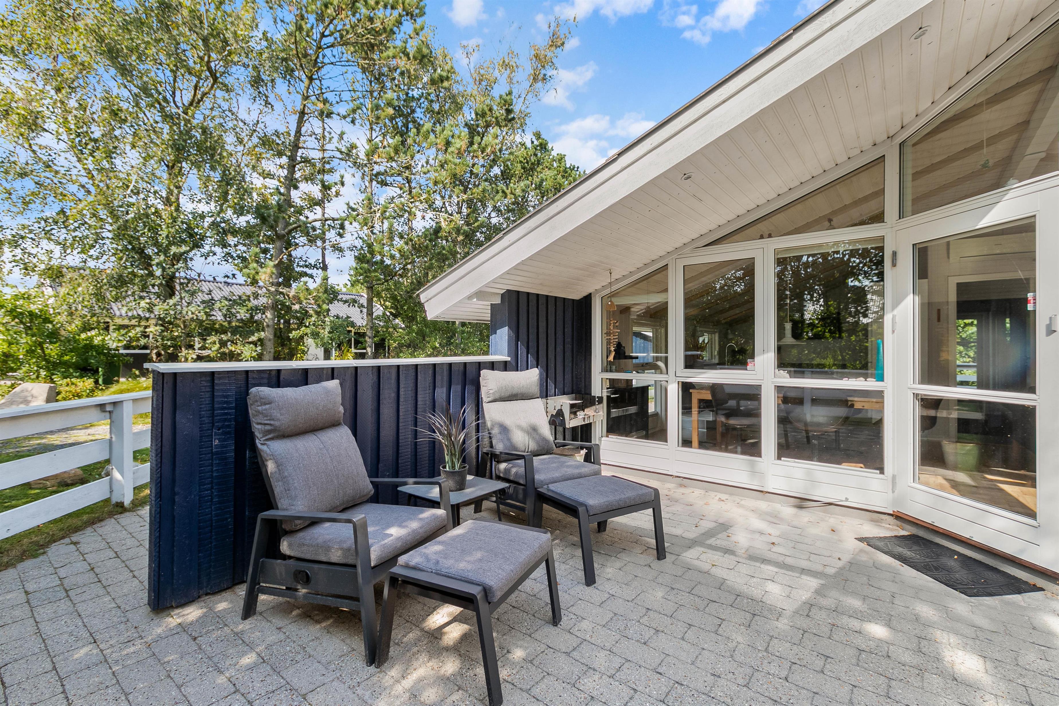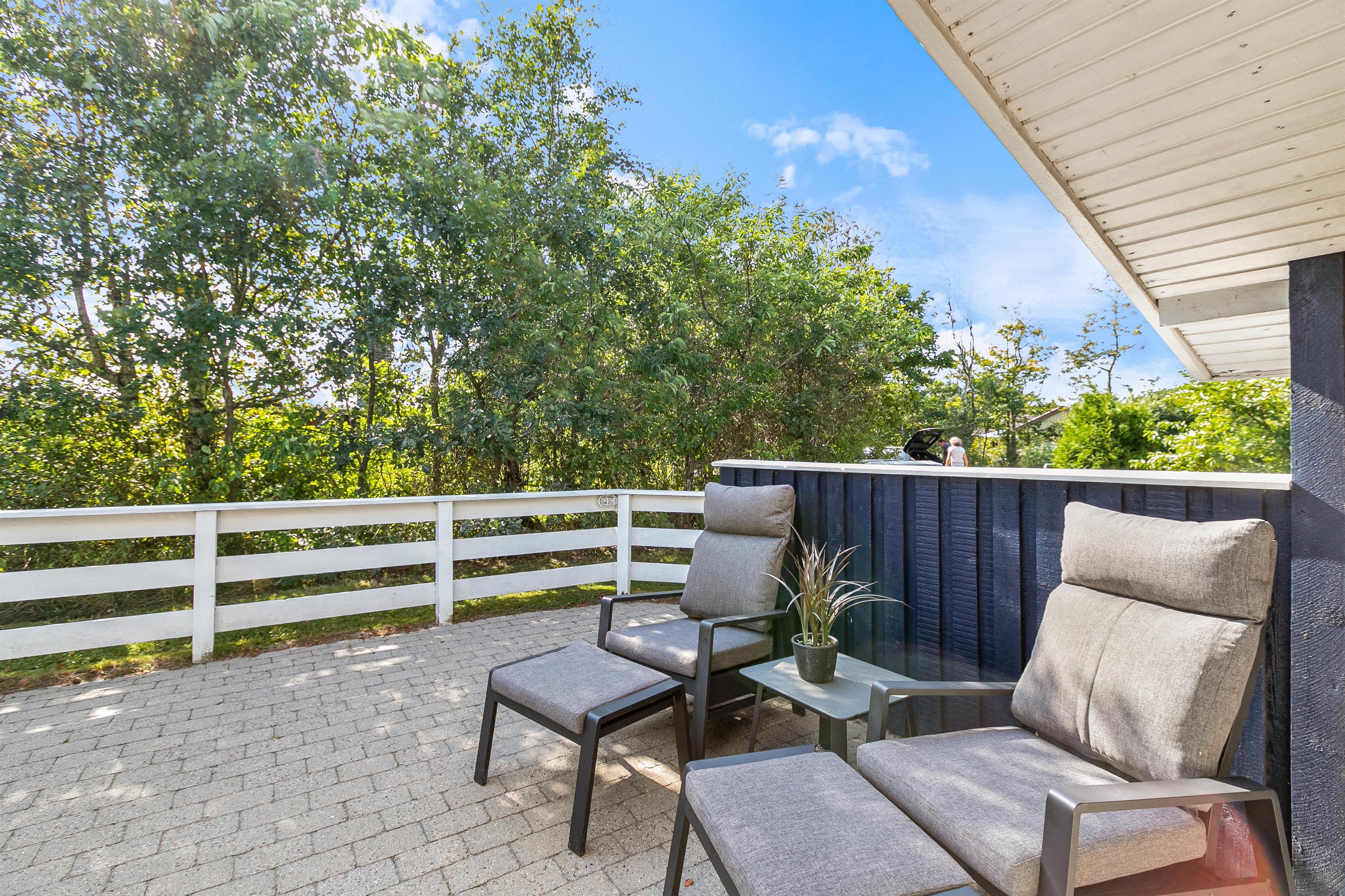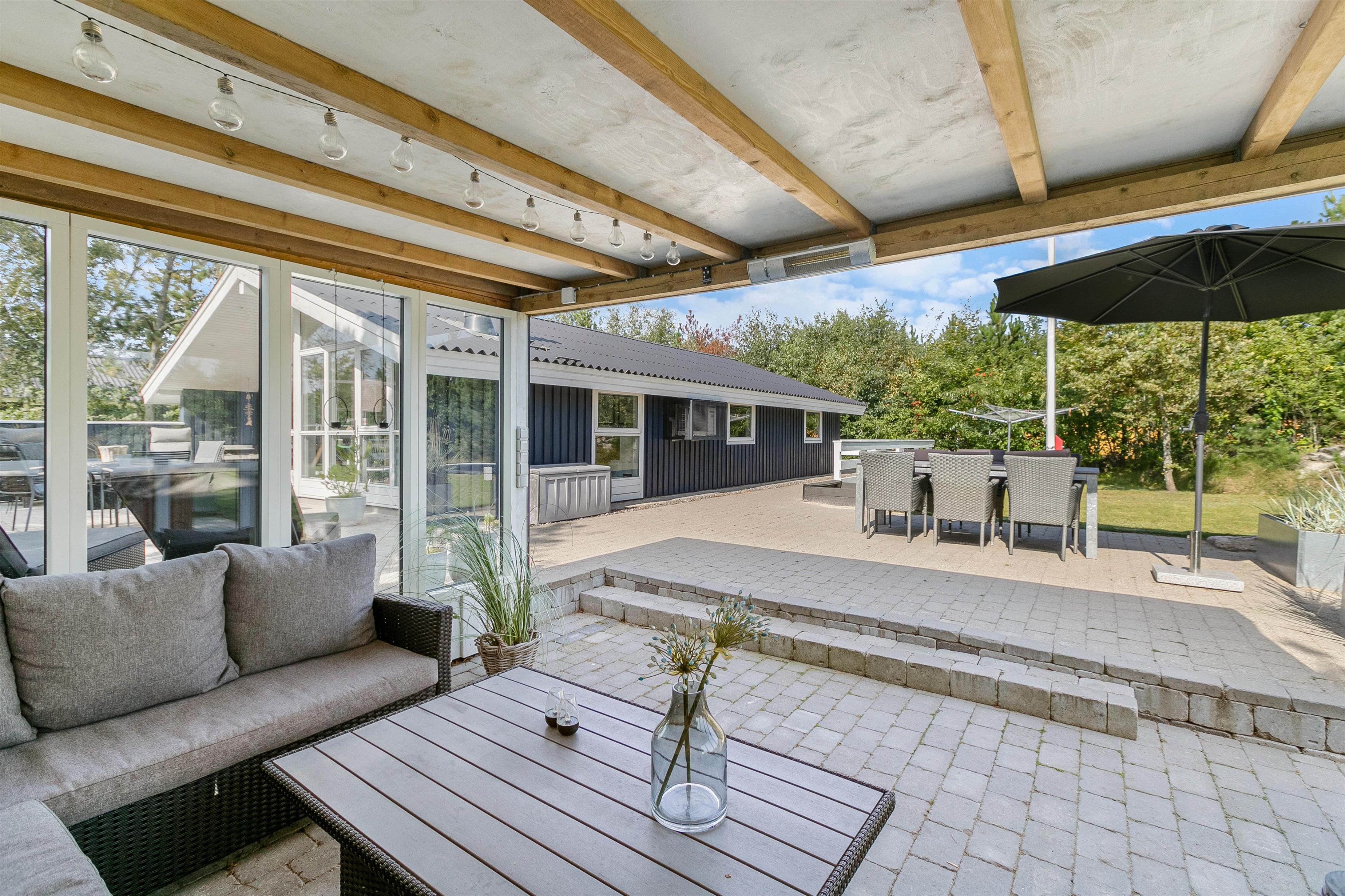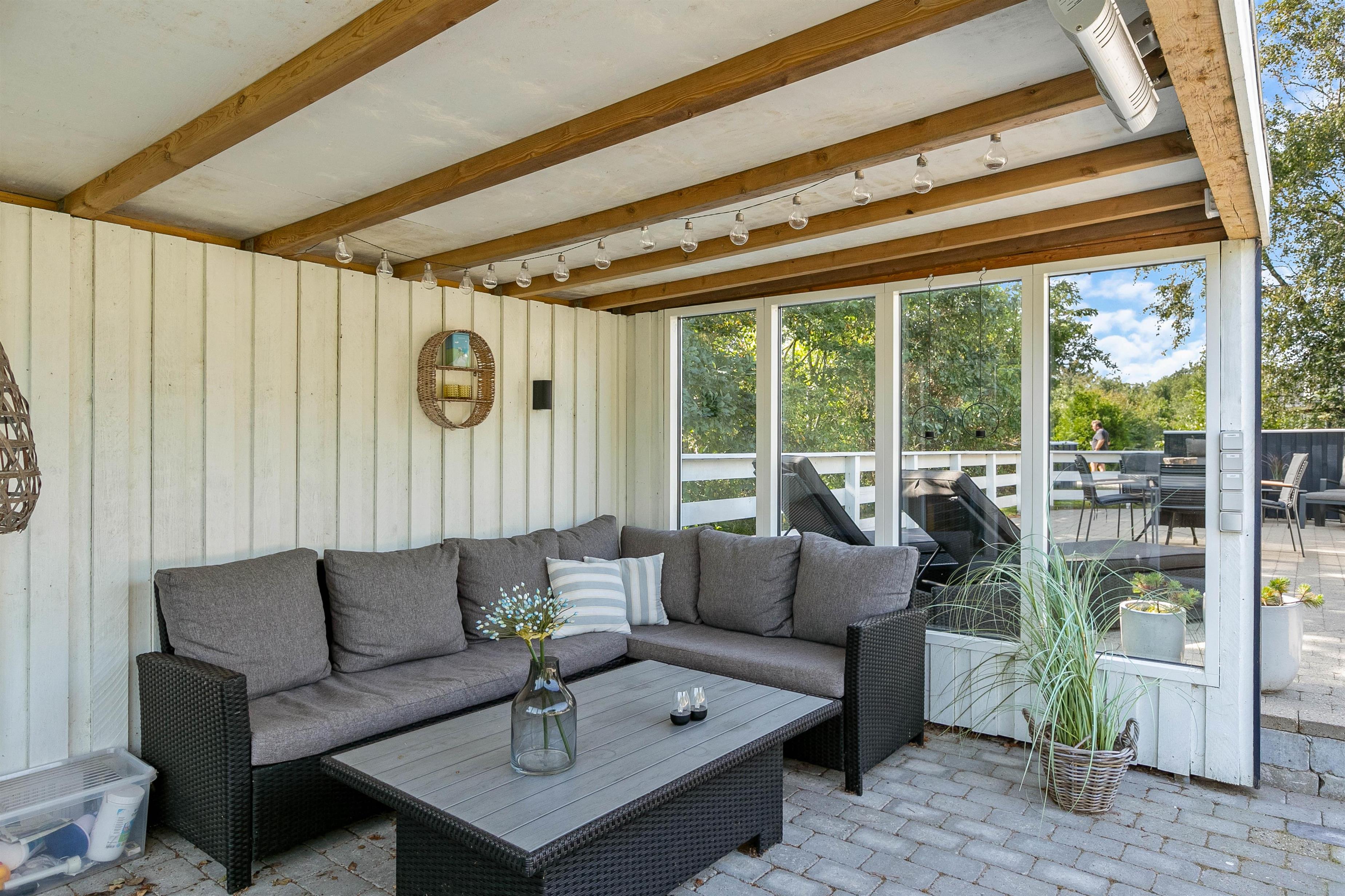 Den overdækkede terrasse tilbyder et ideelt sted for måltider udendørs eller bare en rolig stund med en god bog. Her kan I spise frokost i skyggen, nyde grillmaden eller en kold drink.