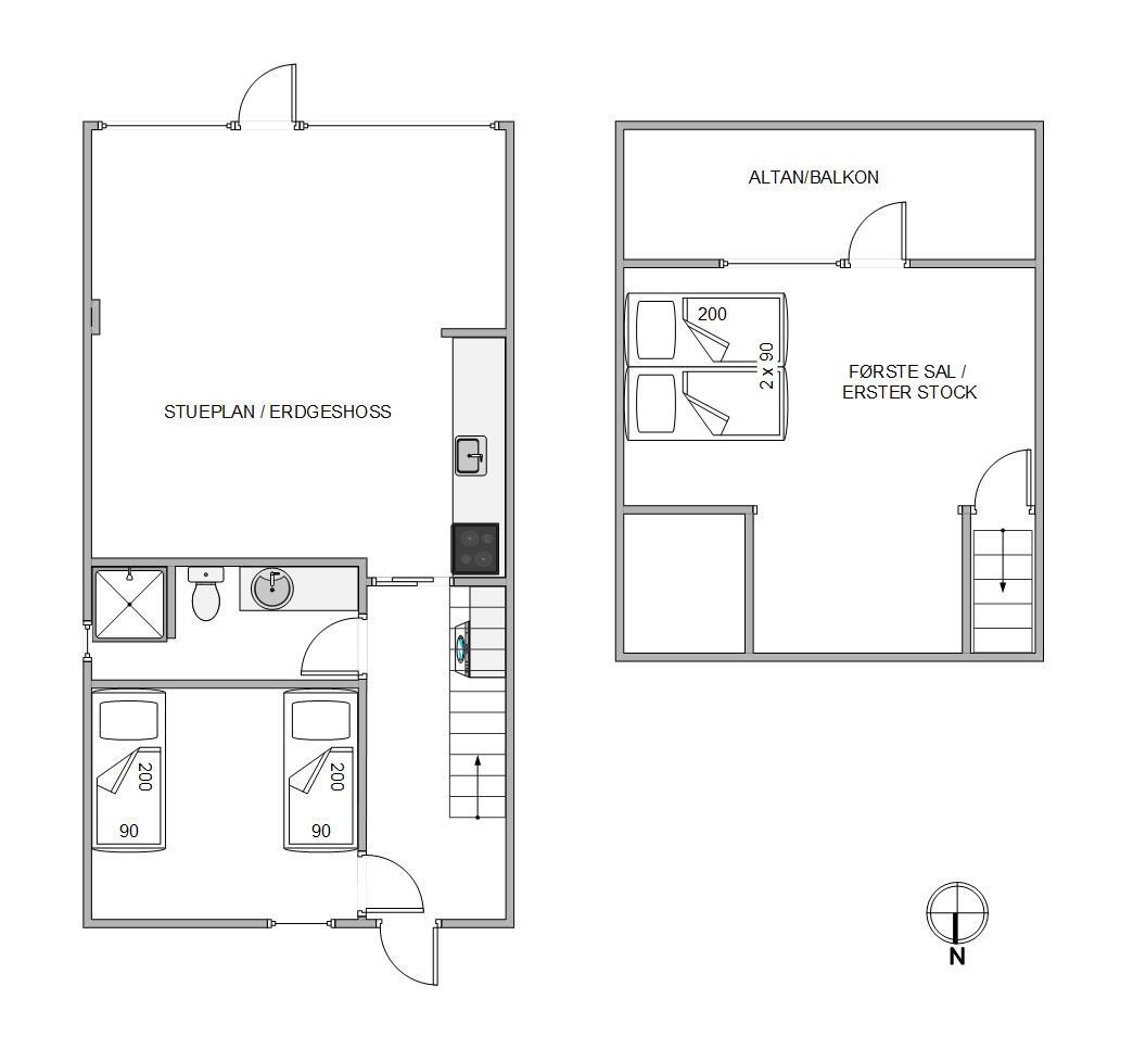 I det åbne køkken er der alt, hvad I skal bruge til en fælles madlavningsaften. Opvasken behøver I ikke at bekymre jer om – den klarer opvaskemaskinen. Der er 2 soveværelser i ferielejligheden – et med 2 enkeltsenge i stueplan, og et med dobbeltseng og udgang til altan på 1. sal. Her kan I sove rigtig godt ud i de komfortable senge. Vesterhavsluften gør noget godt for nattesøvnen. Det praktisk indrettede badeværelse har gulvvarme, så I ikke får kolde fødder. Der er vaskemaskine og en energibesparende varmepumpe i ferielejligheden.