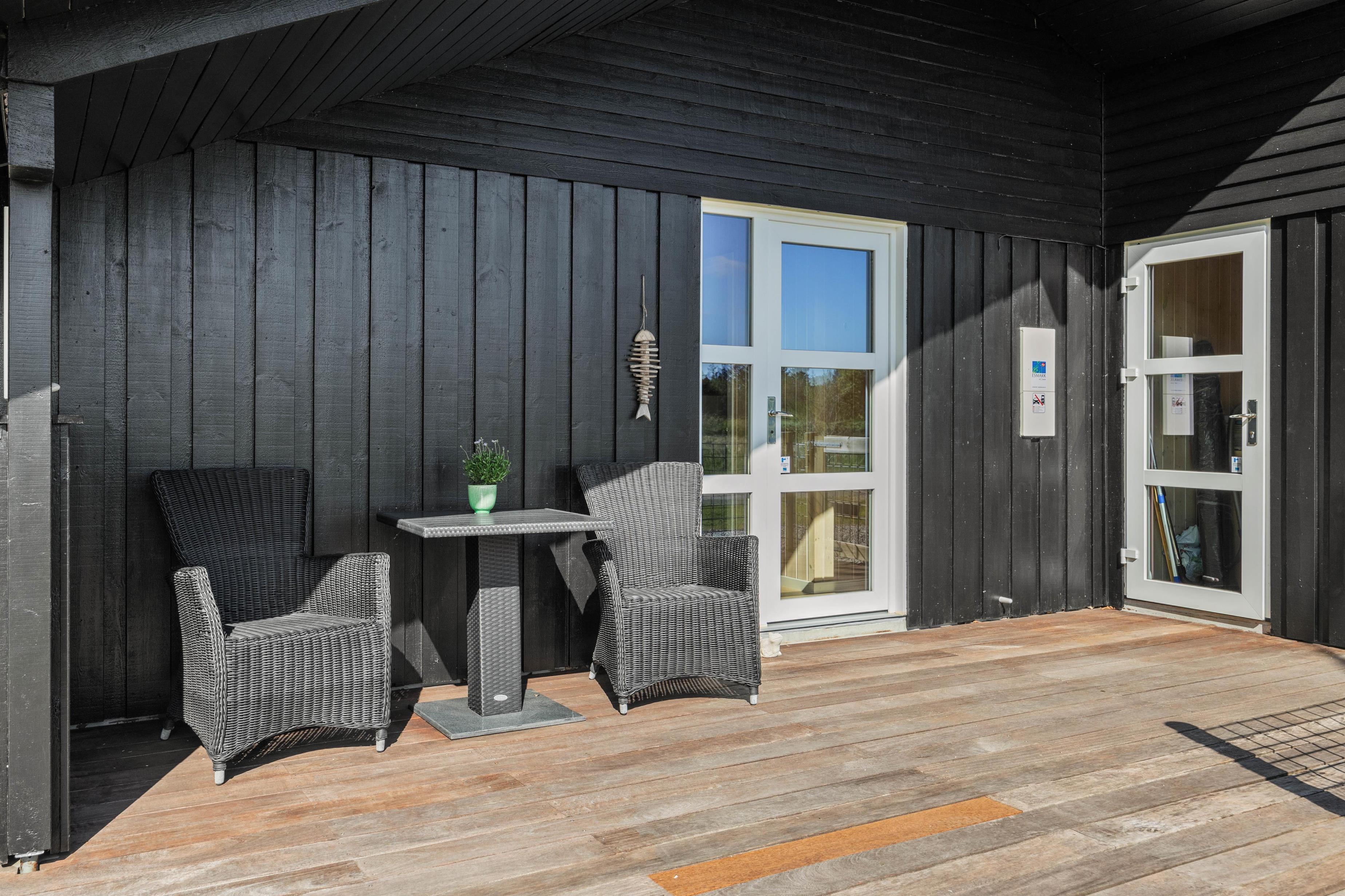 Solvogne og havemøbler står klar til at I kan nyde de mange dejlige hjørner og hyggelige terrasser, der findes omkring dette feriehus. Fra østterrassen er der den flotteste udsigt over Hennebys populære og velbesøgte golfbane.