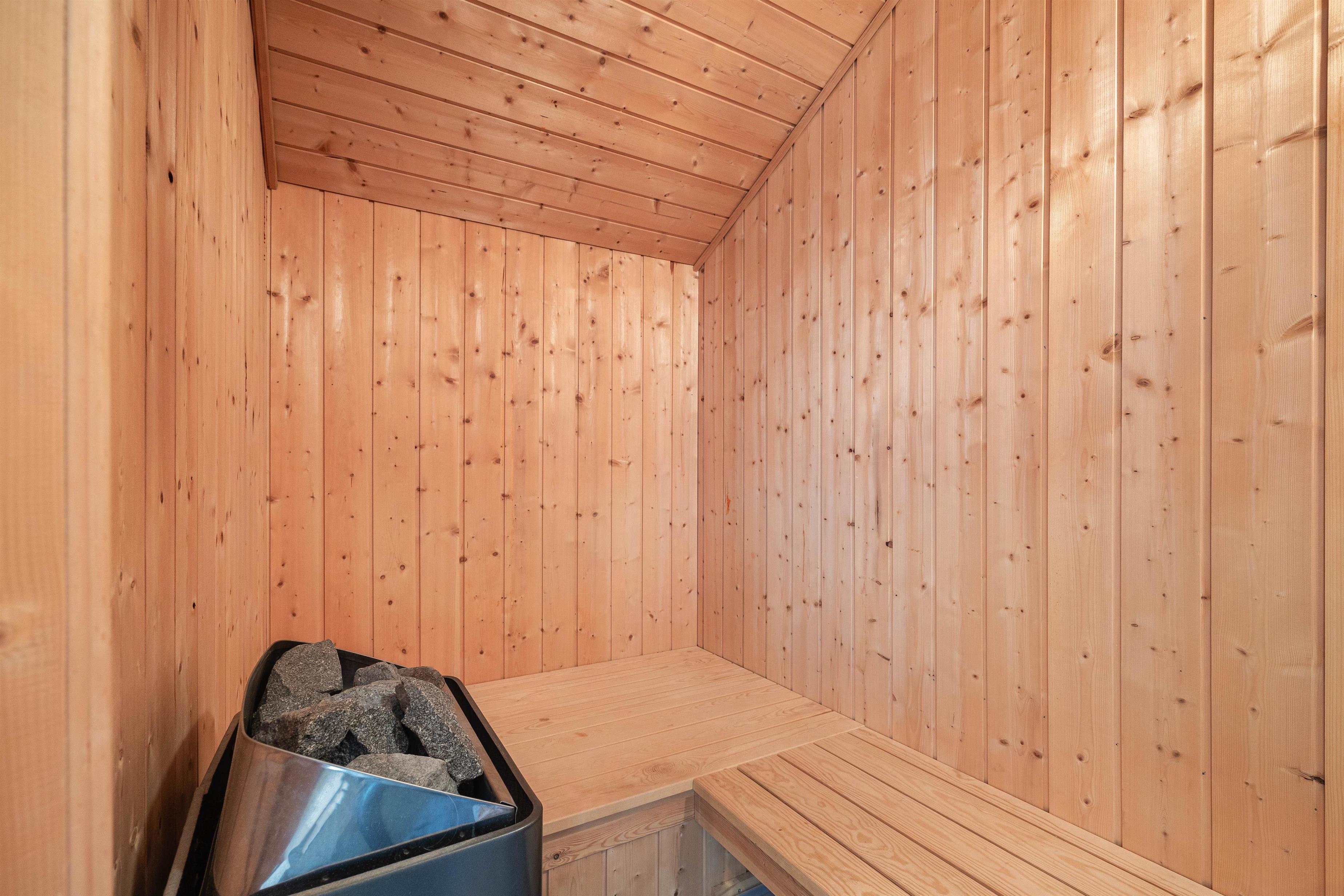 Dette 84 m² store feriehus har 1 badeværelse samt 2 gode soveværelser. Et af soveværelserne er indrettet med 1 dobbeltseng og indbyggede skabe, det andet soveværelse har 2 enkeltsenge og faste skabe. Det flotte og rummelige badeværelse med gulvvarme rummer vaskesøjle, bruseniche, en dejlig spa til 2 personer samt sauna.