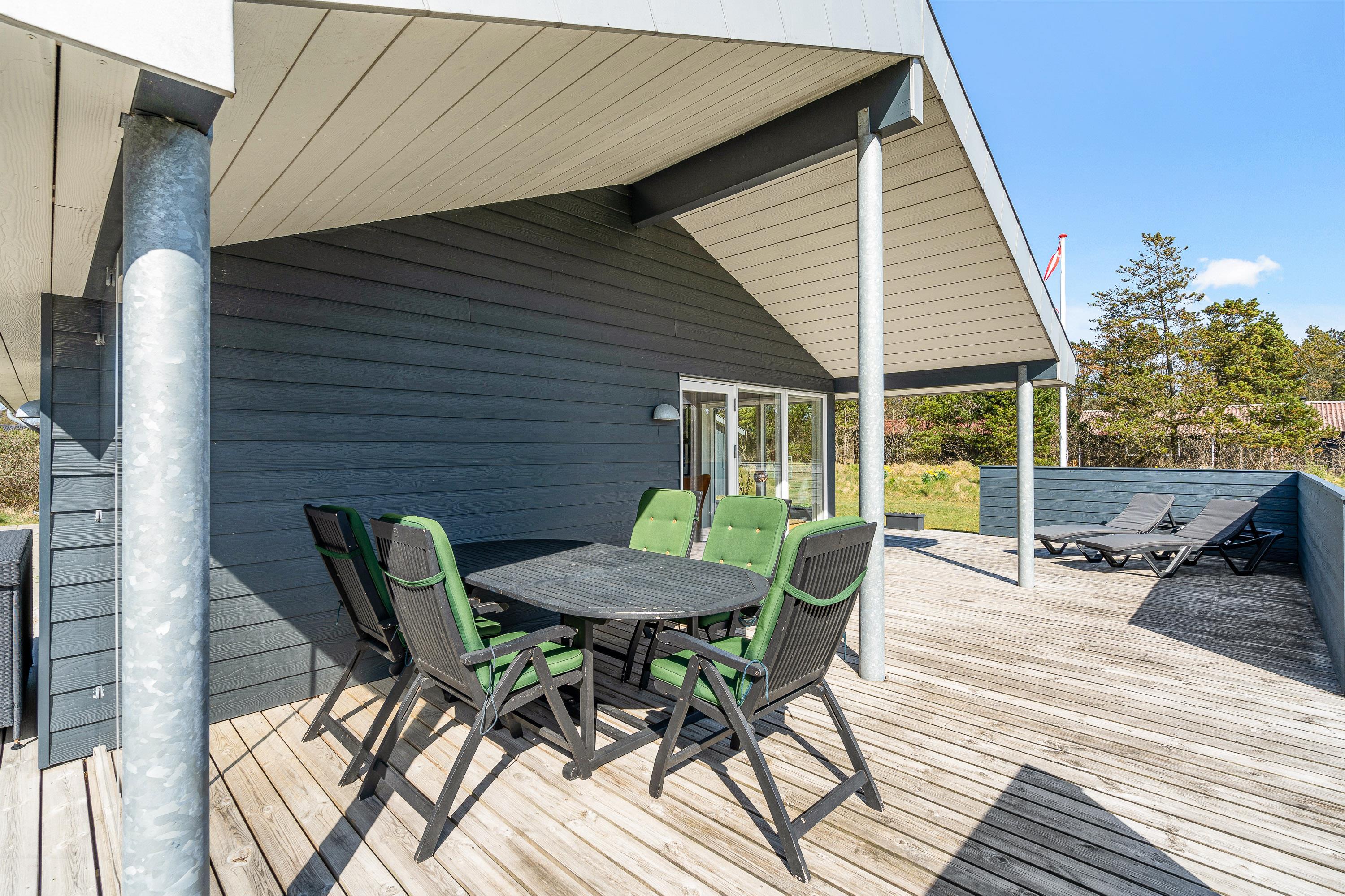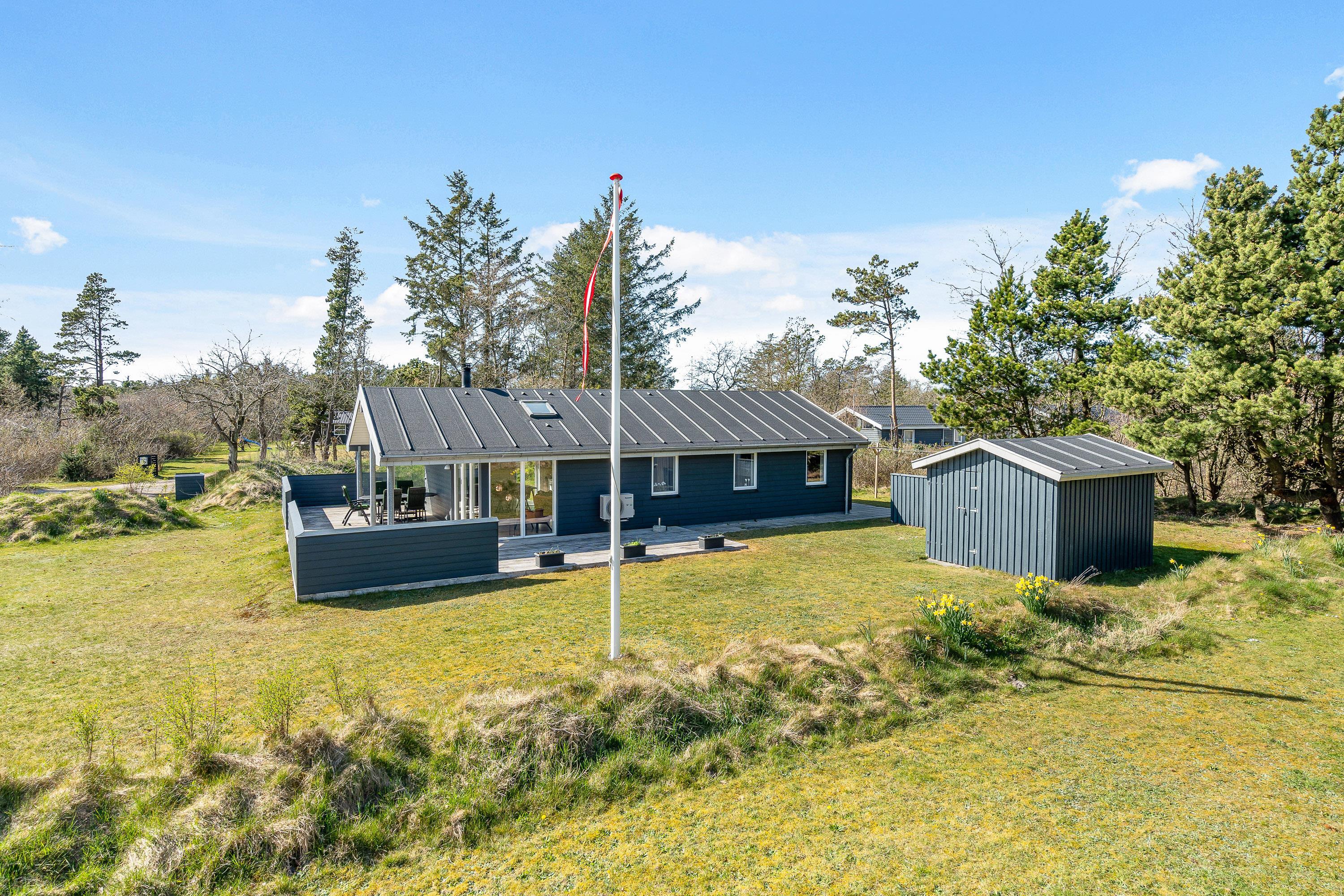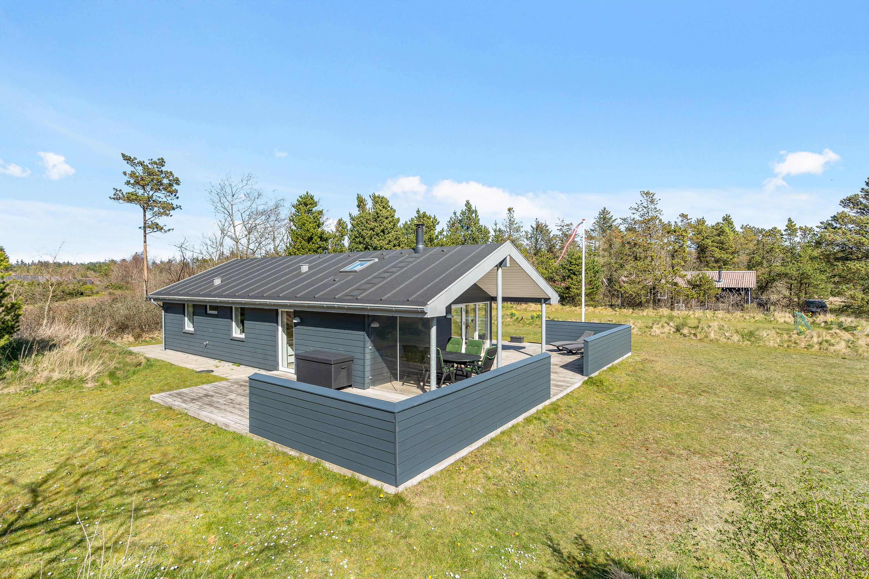 På sommerhusets udeområde venter jer blandt andet en delvist overdækket og afskærmet terrasse, som I kan finde jer til rette på i havemøblerne og liggestolene. Find jer en god plads i solen og læn jer tilbage, mens I nyder ferien til fulde.