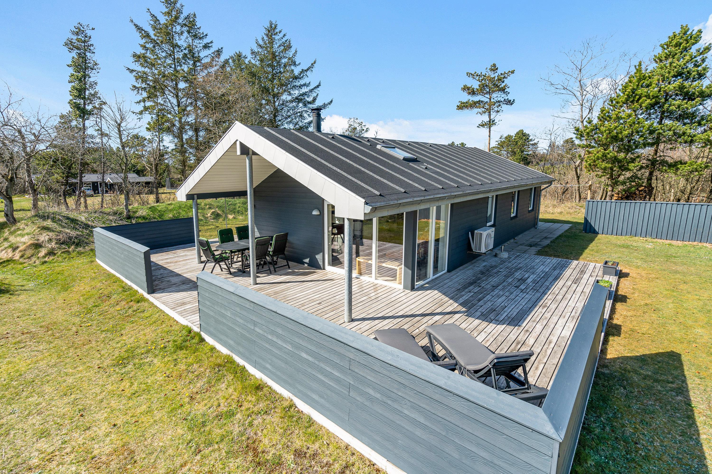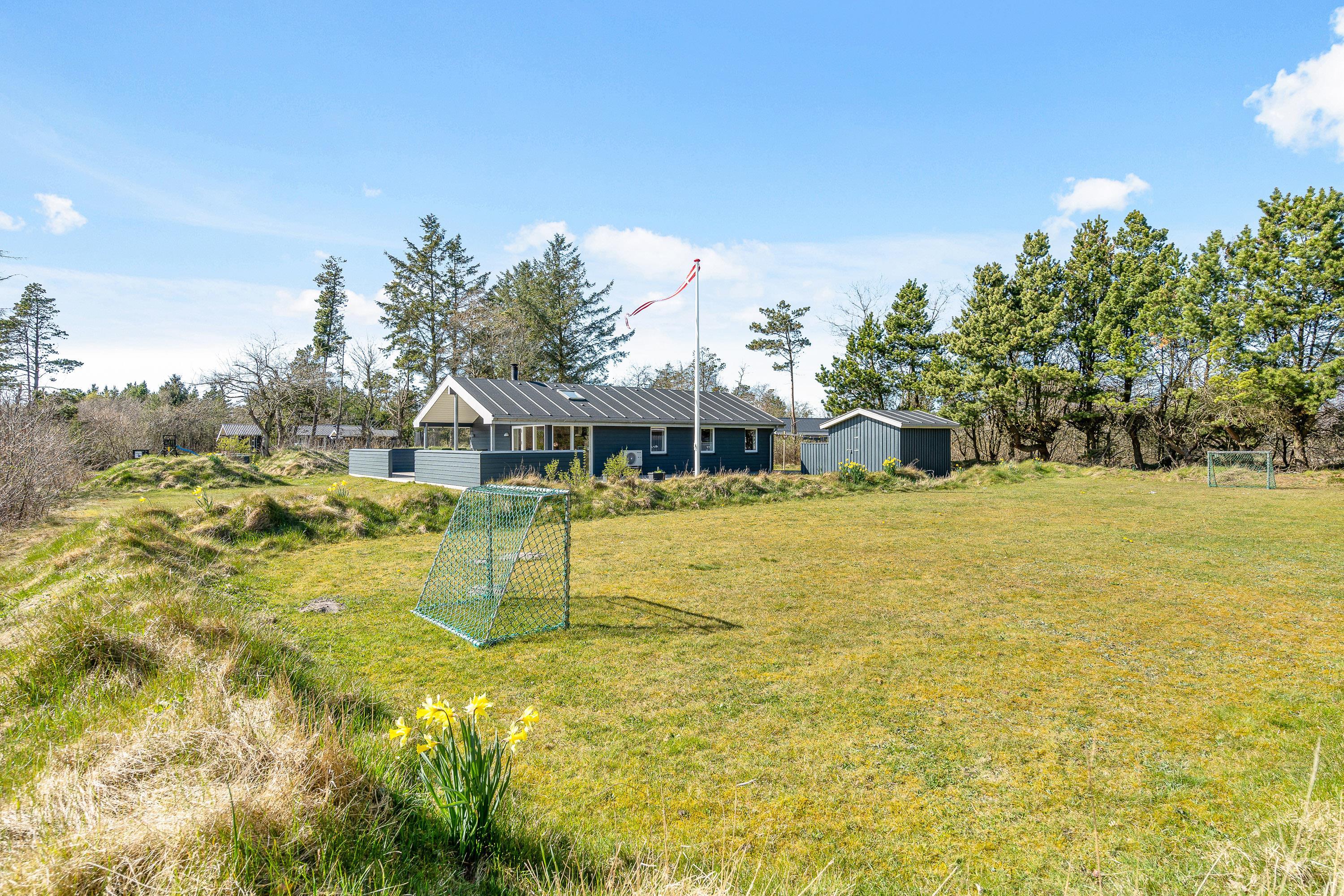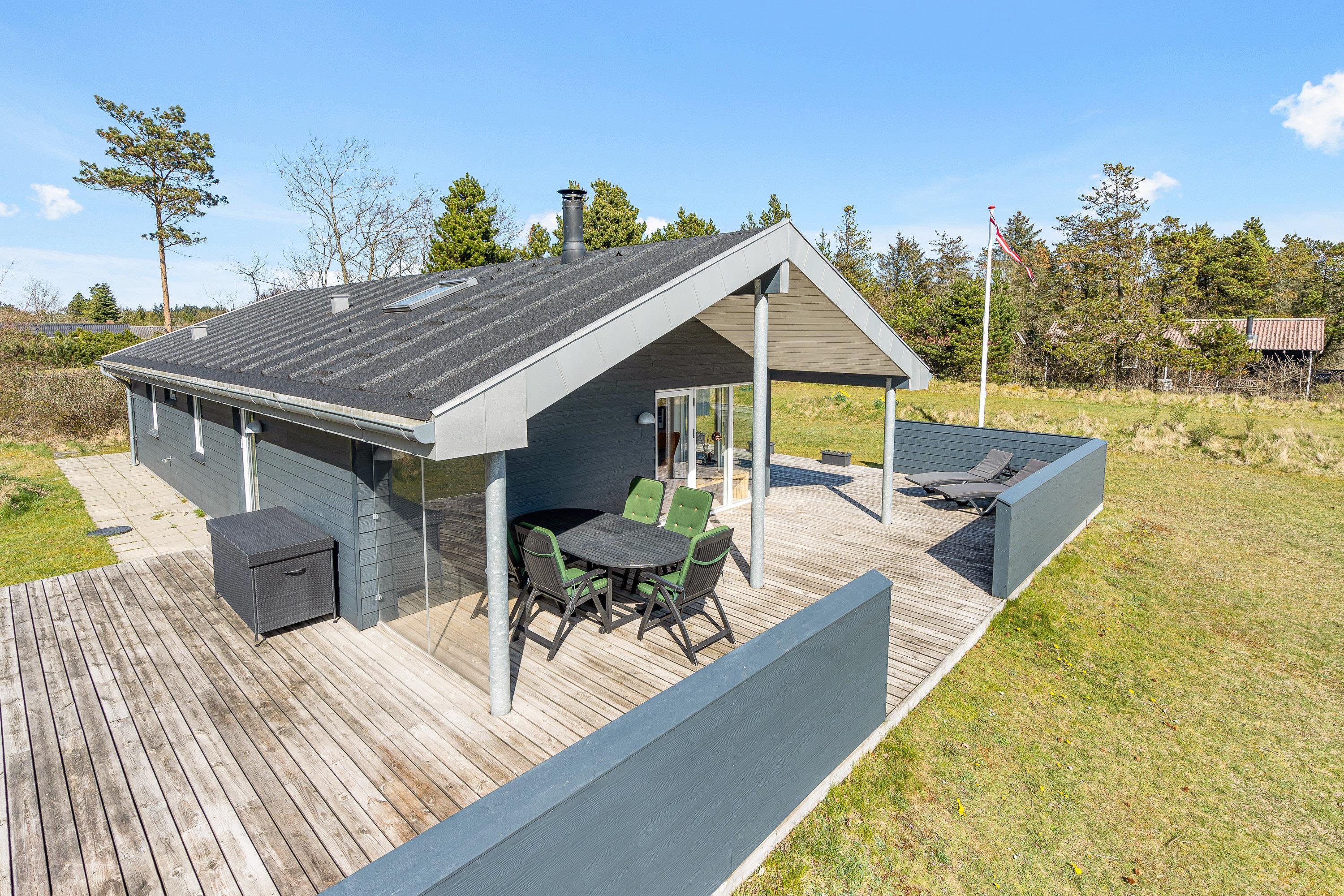 På sommerhusets udeområde venter jer blandt andet en delvist overdækket og afskærmet terrasse, som I kan finde jer til rette på i havemøblerne og liggestolene. Find jer en god plads i solen og læn jer tilbage, mens I nyder ferien til fulde.