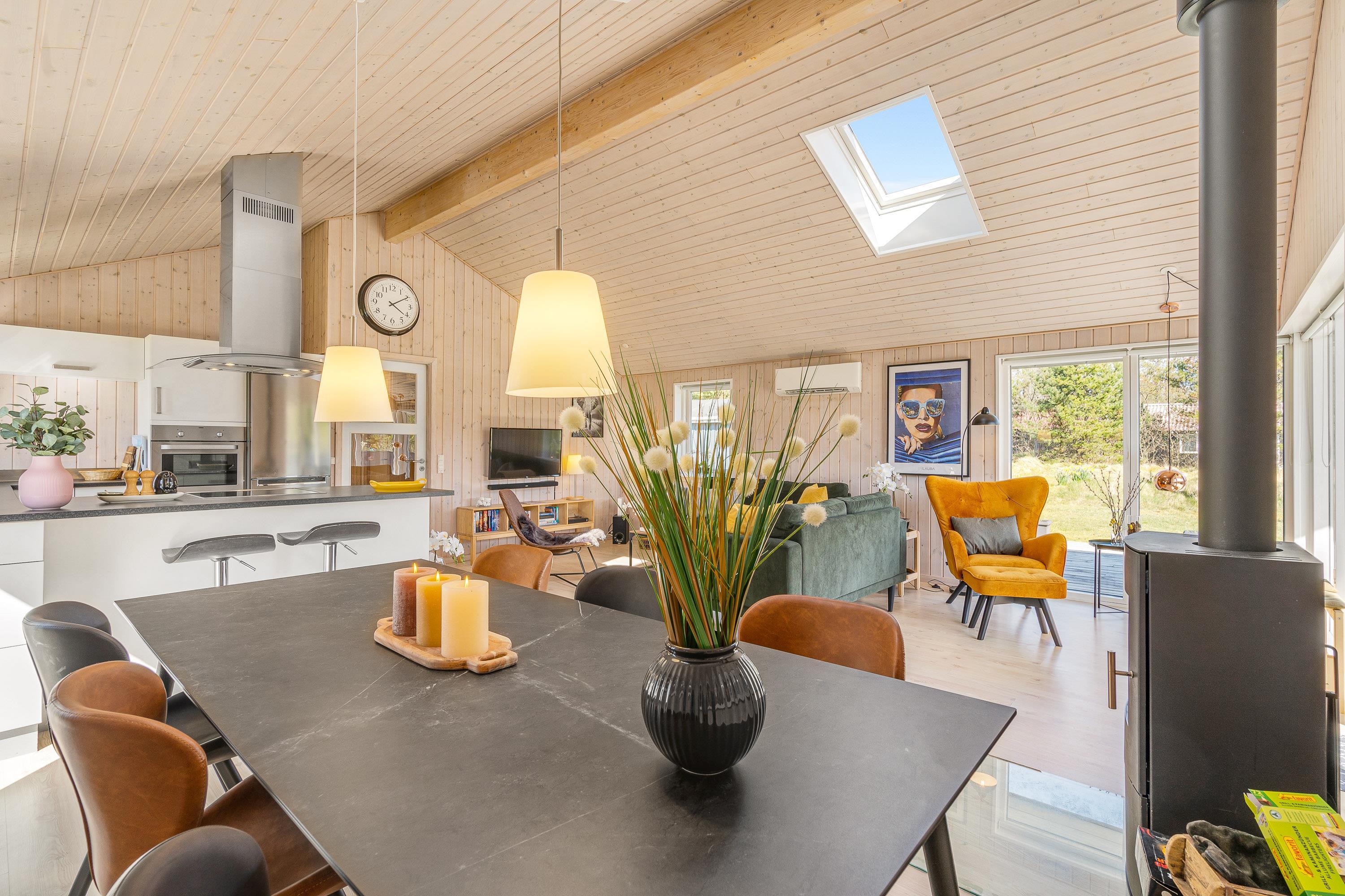Hjertet i sommerhuset er alrummet, der samler køkken, stue og spiseplads i ét, hvor rammerne er sat for hyggelige stunder med hele ferieflokken. Her kan I lave god mad i køkkenet, spille et sjovt spil ved bordet eller streame jeres yndlingsfilm i tv’et via Chromecasten. Alt sammen akkompagneres af brændeovnens knitrende flammer i baggrunden, der fuldender feriestemningen.