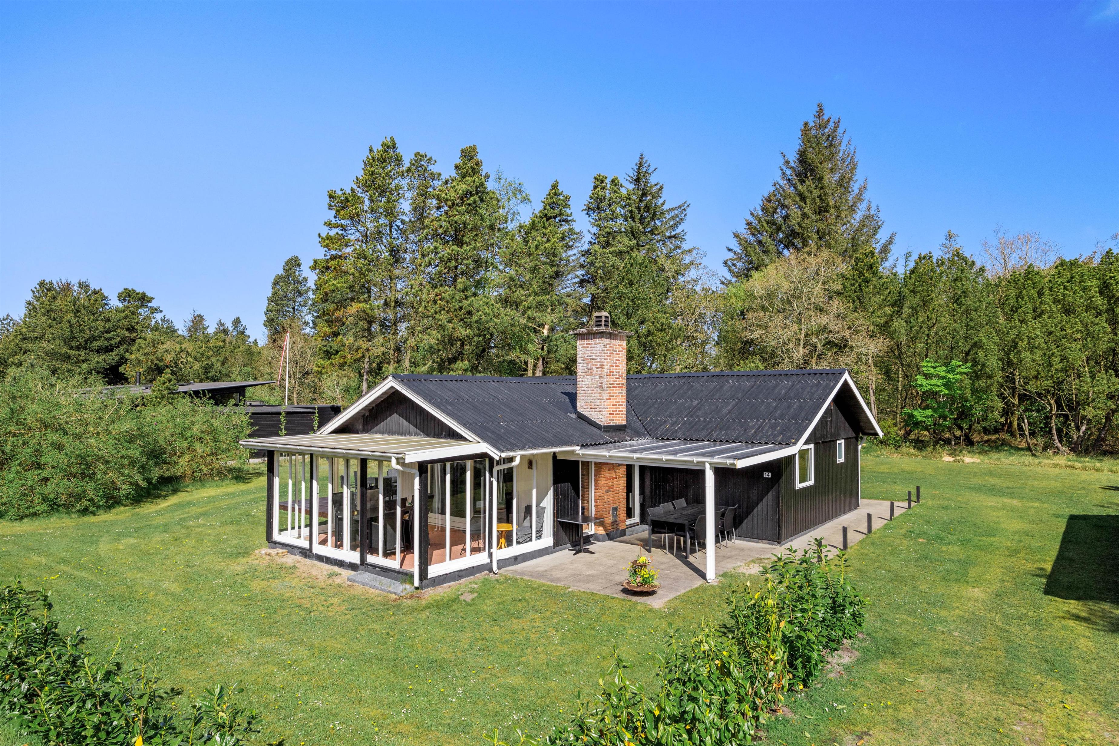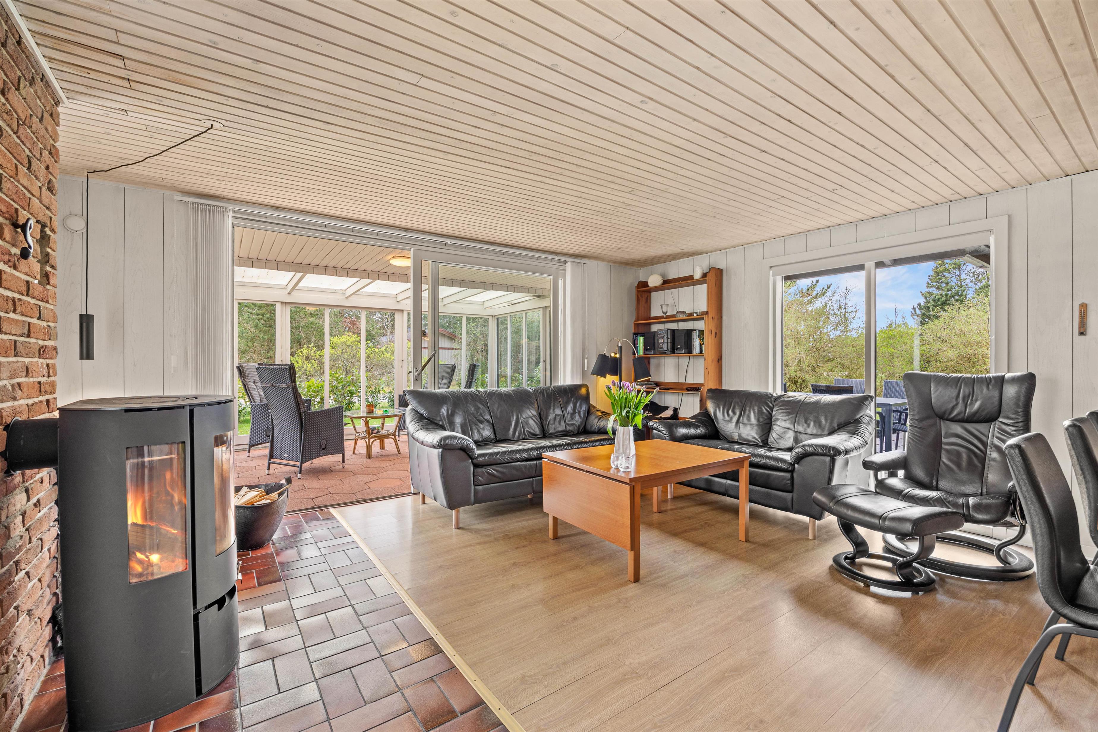 Med både brændeovn og en moderne og energibesparende luft-til-luft varmepumpe er sommerhuset perfekt tempereret året rundt. Når dagene er kølige, kan I hygge sammen foran den knitrende brændeovn og nyde varmen. For en stund med en god bog eller et glas vin i afslappende omgivelser byder dette sommerhus også på en skøn udestue, hvorfra I kan nyde udsigten til den omkringliggende natur - både de solrige dage og lune aftener.