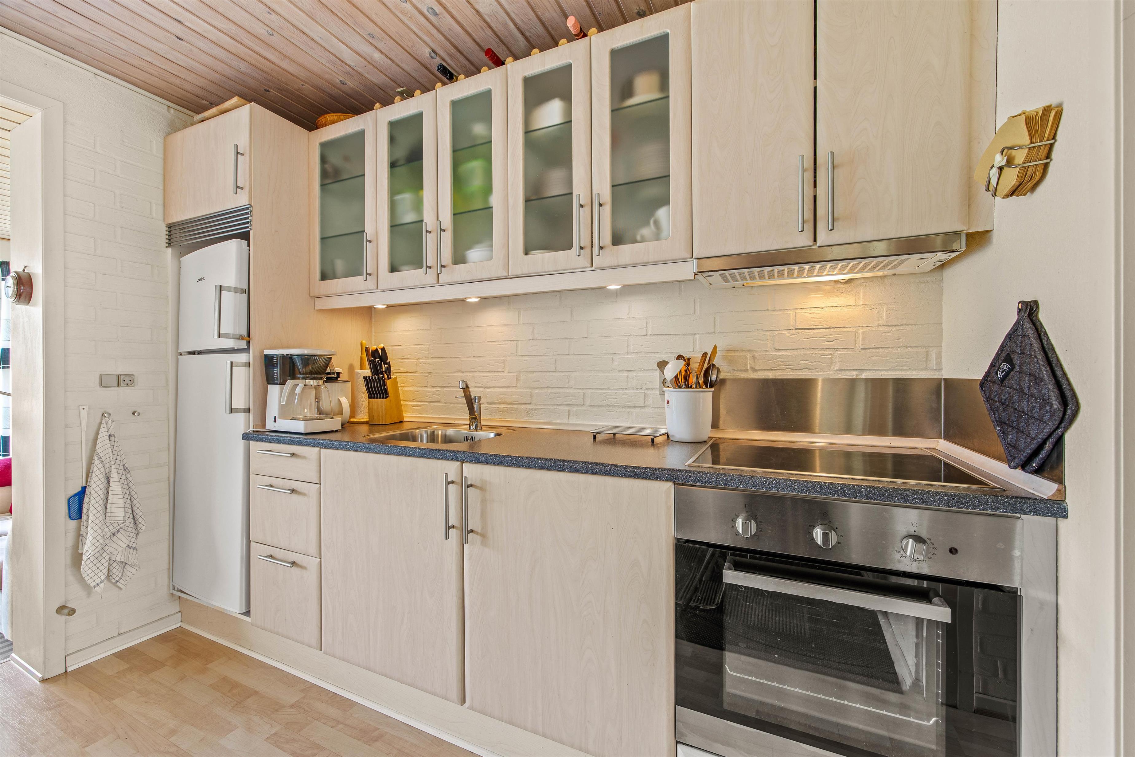 Ferielejlighedens 60m2 er fordelt over 2 etager. I stueplan finder I det veludstyrede køkken i forlængelse af den flotte stue, hvor den elektriske pejs er med til at sprede den helt rigtige feriestemning.