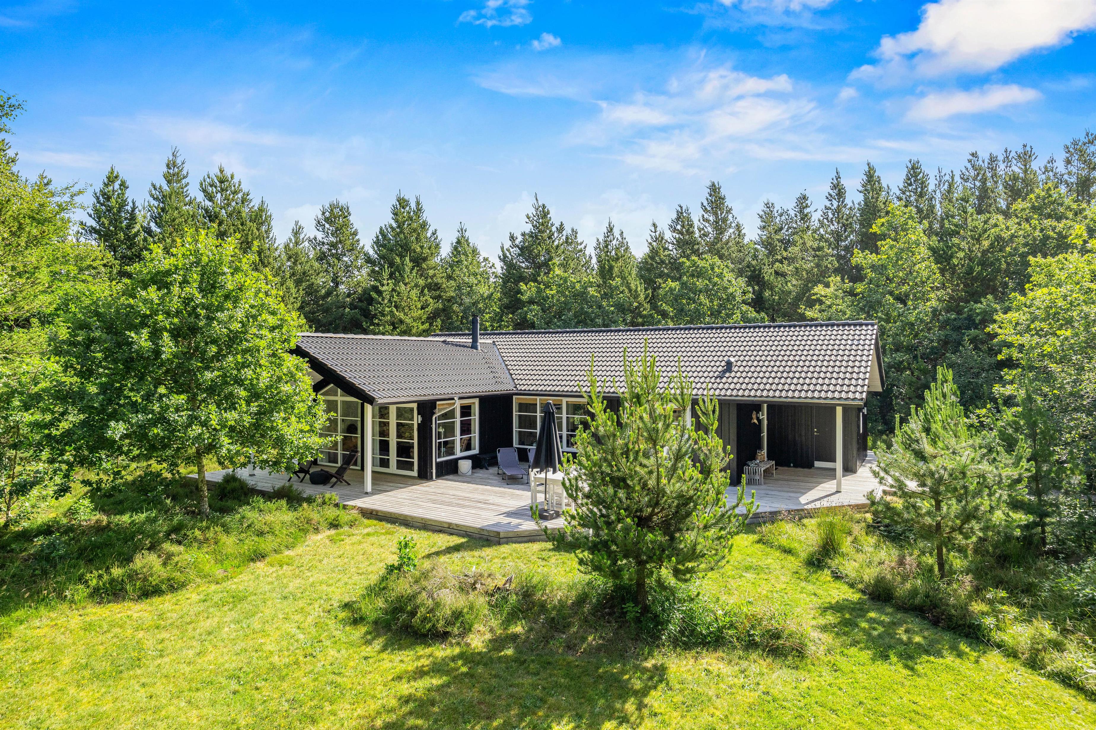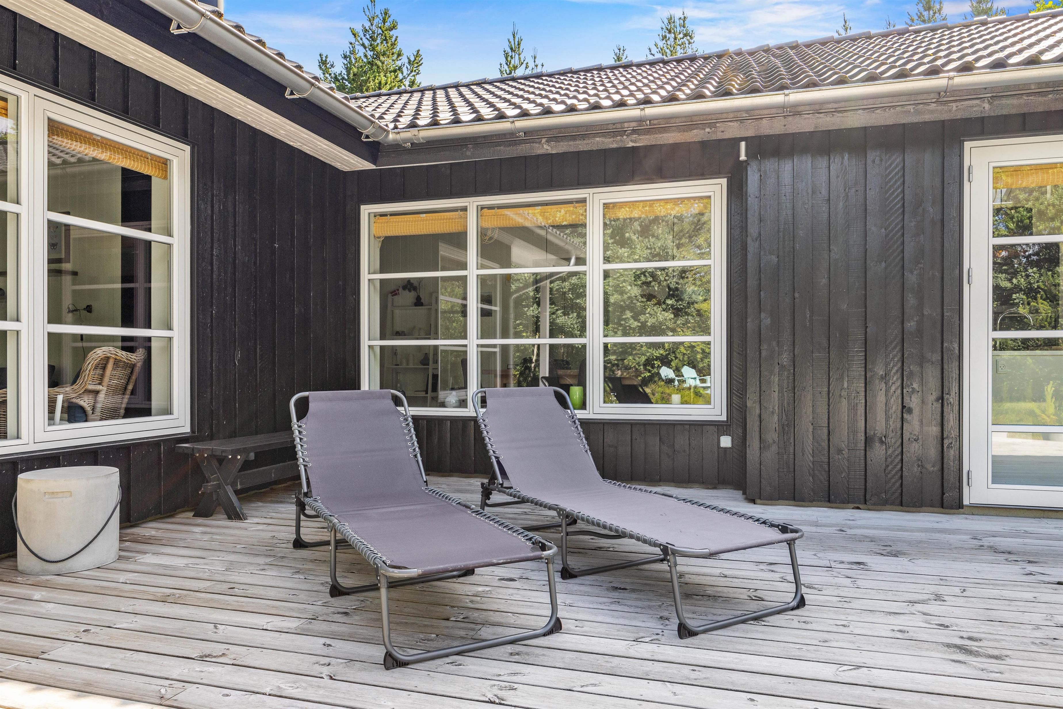 Terrassen strækker sig hele vejen rundt om sommerhuset, og her har I mulighed for at kunne nyde solen dagen lang: komfortable havemøbler og solvogne står klar til, at I blot kan læne jer tilbage, imens I nyder den friske luft, der kommer direkte fra Vestkysten. Skulle I dog få brug skygge eller vil nyde en aftenstund på terrassen, kan I trække jer tilbage på den overdækkede terrasse, hvor I også kan tilberede jeres aftensmad på sommerhusets grill.