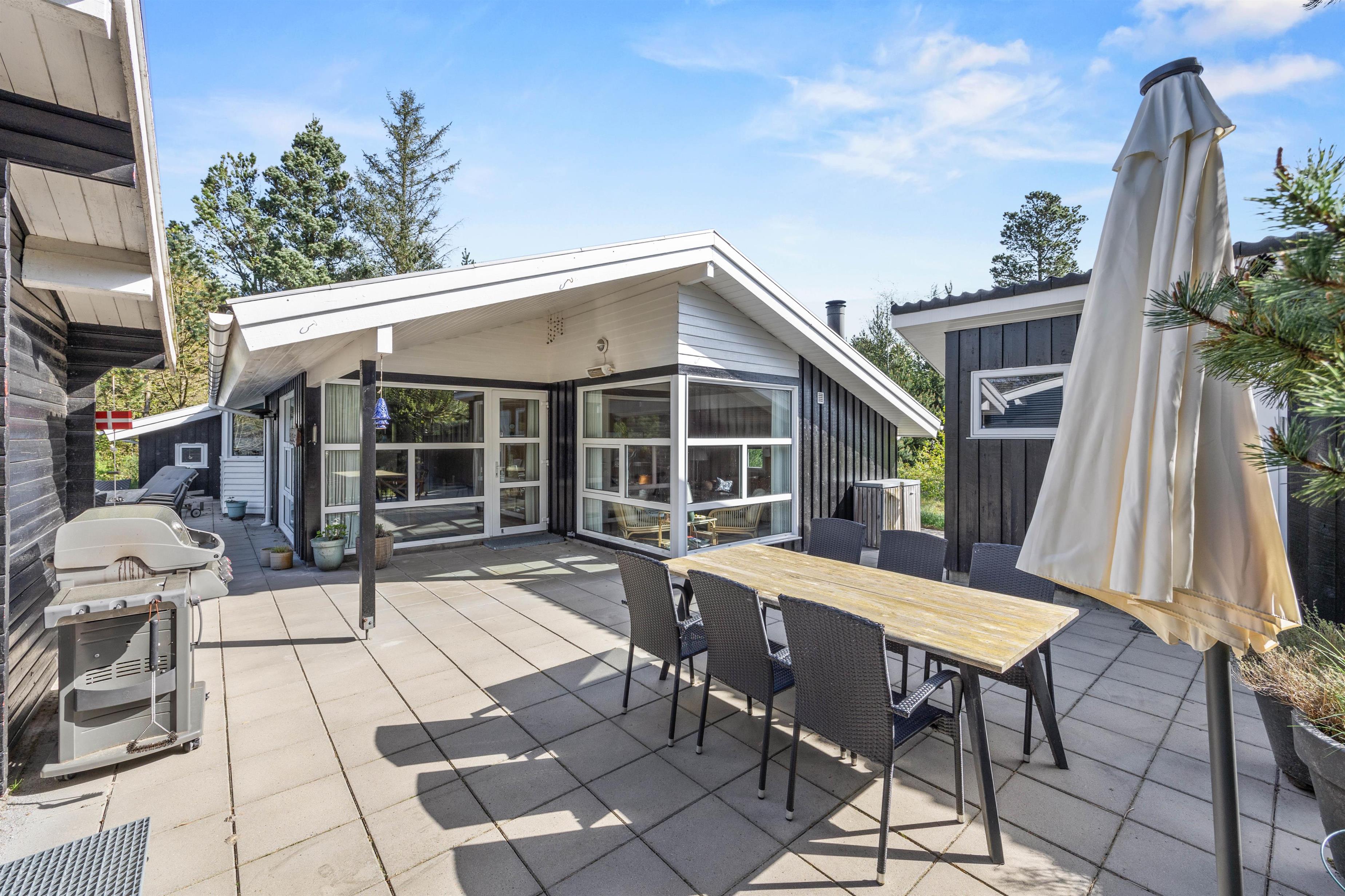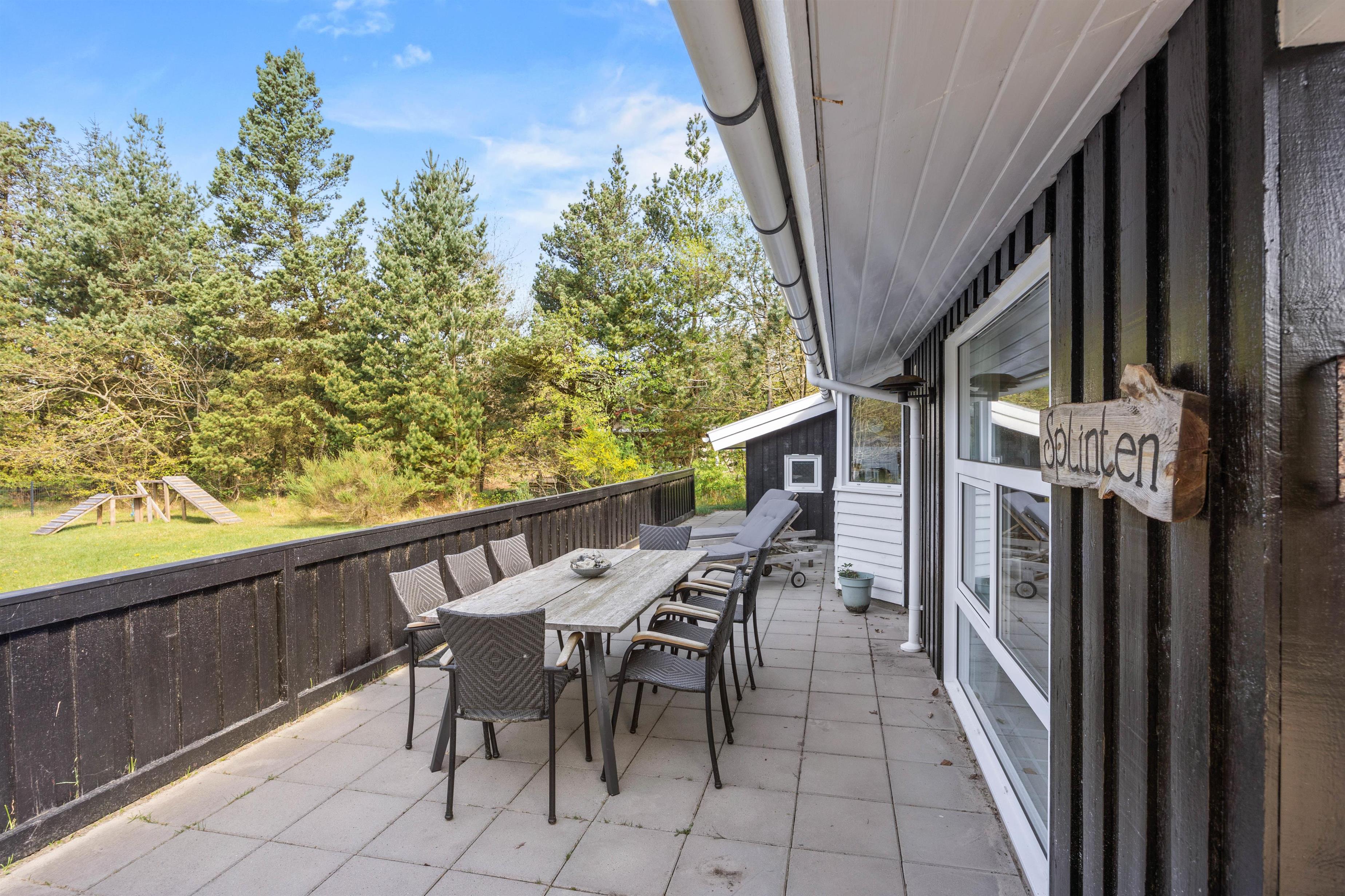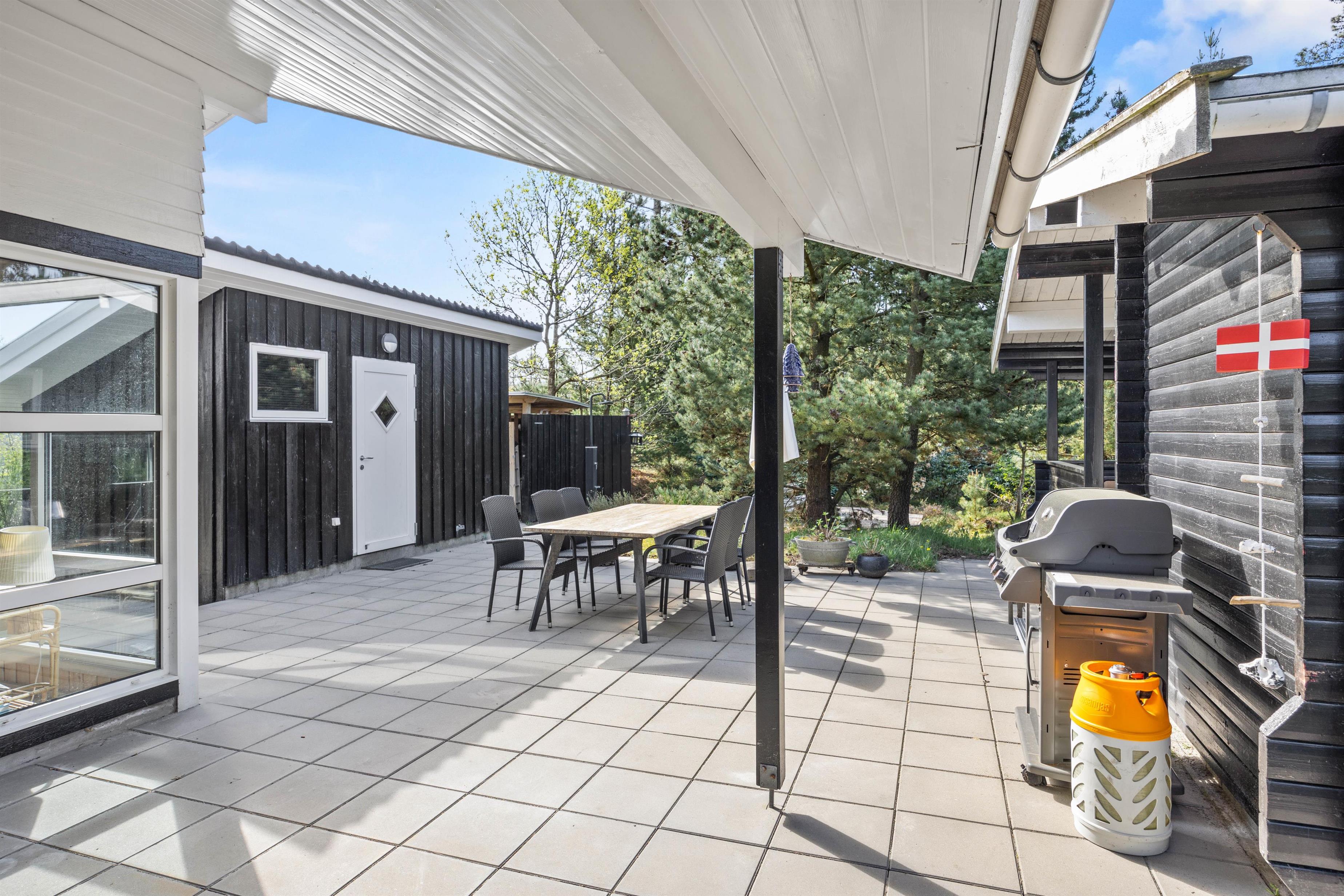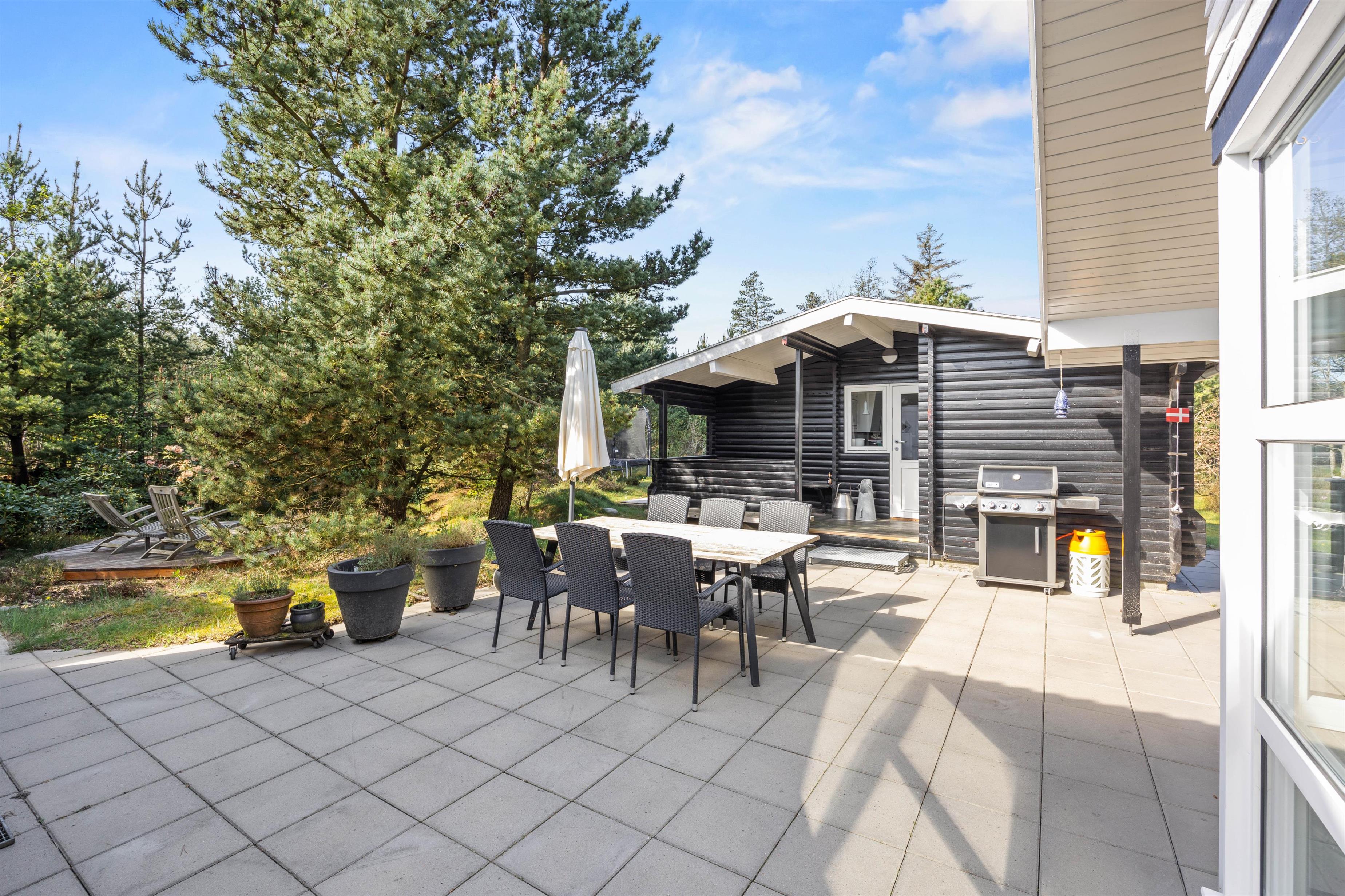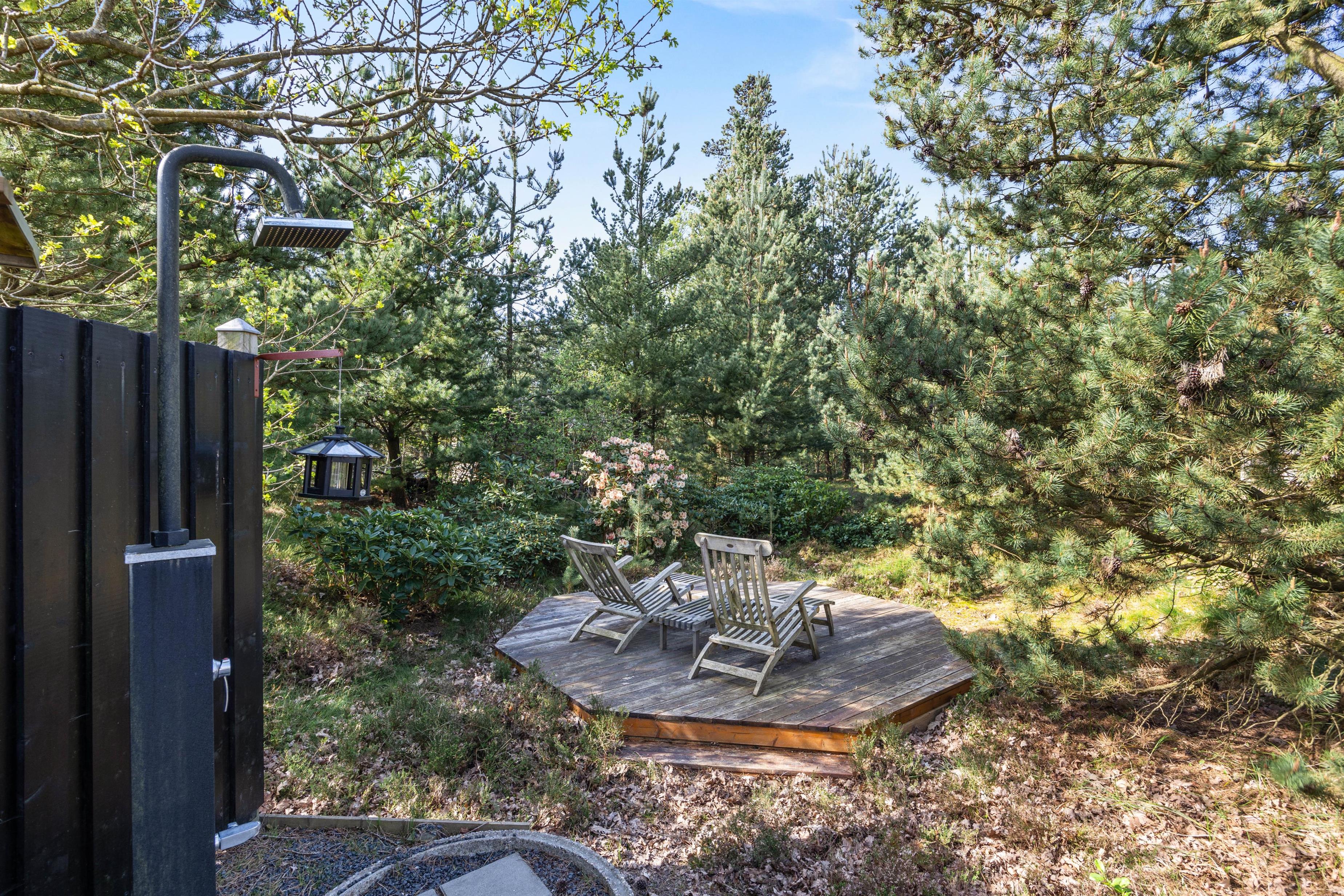 Mod vest er terrassen, hvor I hvor man rigtig kan nyde udelivet. Her, bag fyrretræerne, er I godt afskærmet for vind og de omkringliggende naboer. Udenfor finder I en udebruser, hvor I kan skylle tæerne efter en tur ved vandet. Udover den store græsplæne gemmer her sig også en overraskelse til børnene; nemlig en sandkasse og en trampolin, hvor der kan hoppes løs.