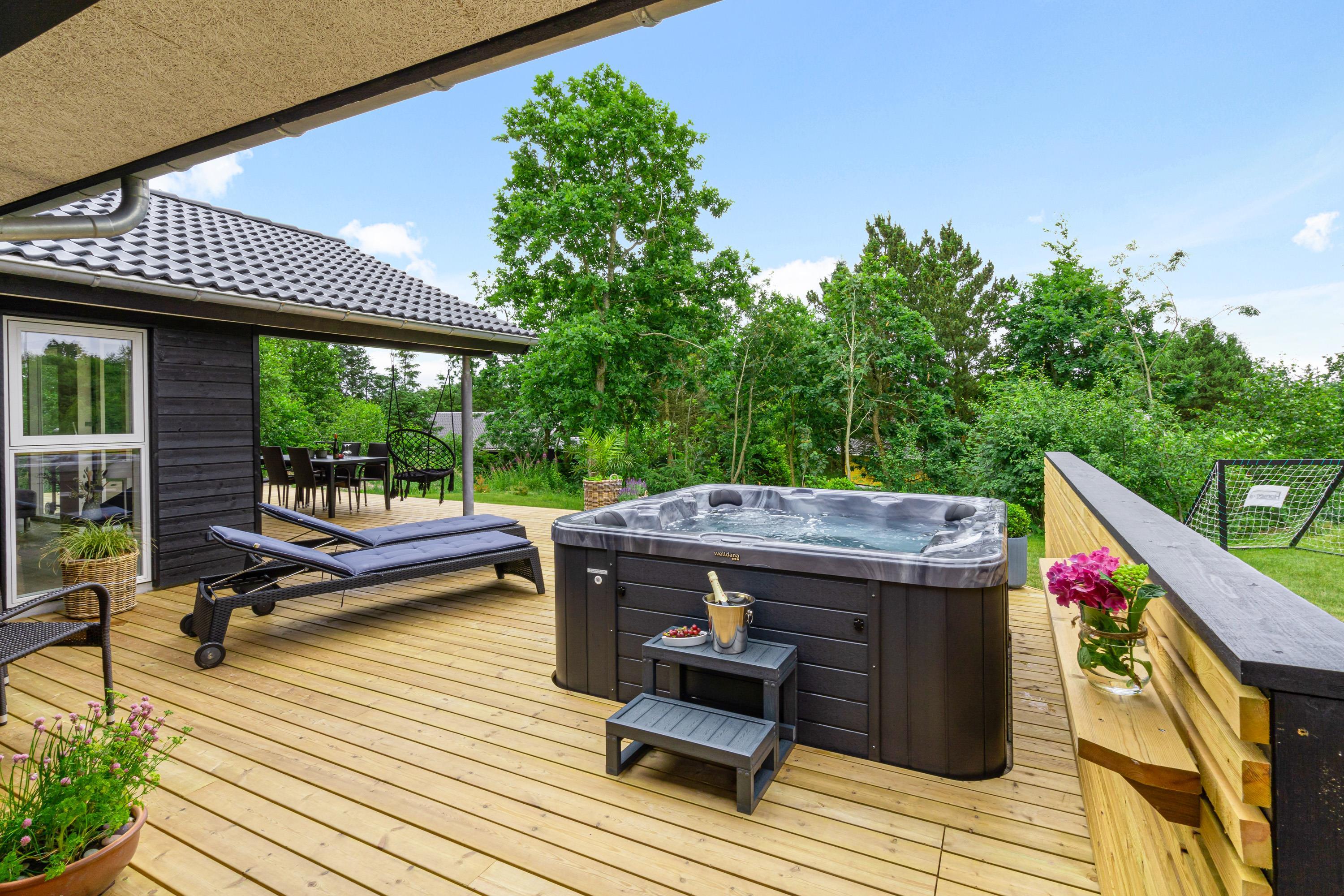 Stor træterrasse med udendørs spabad og udendørs bruser – ladestik til elbil
