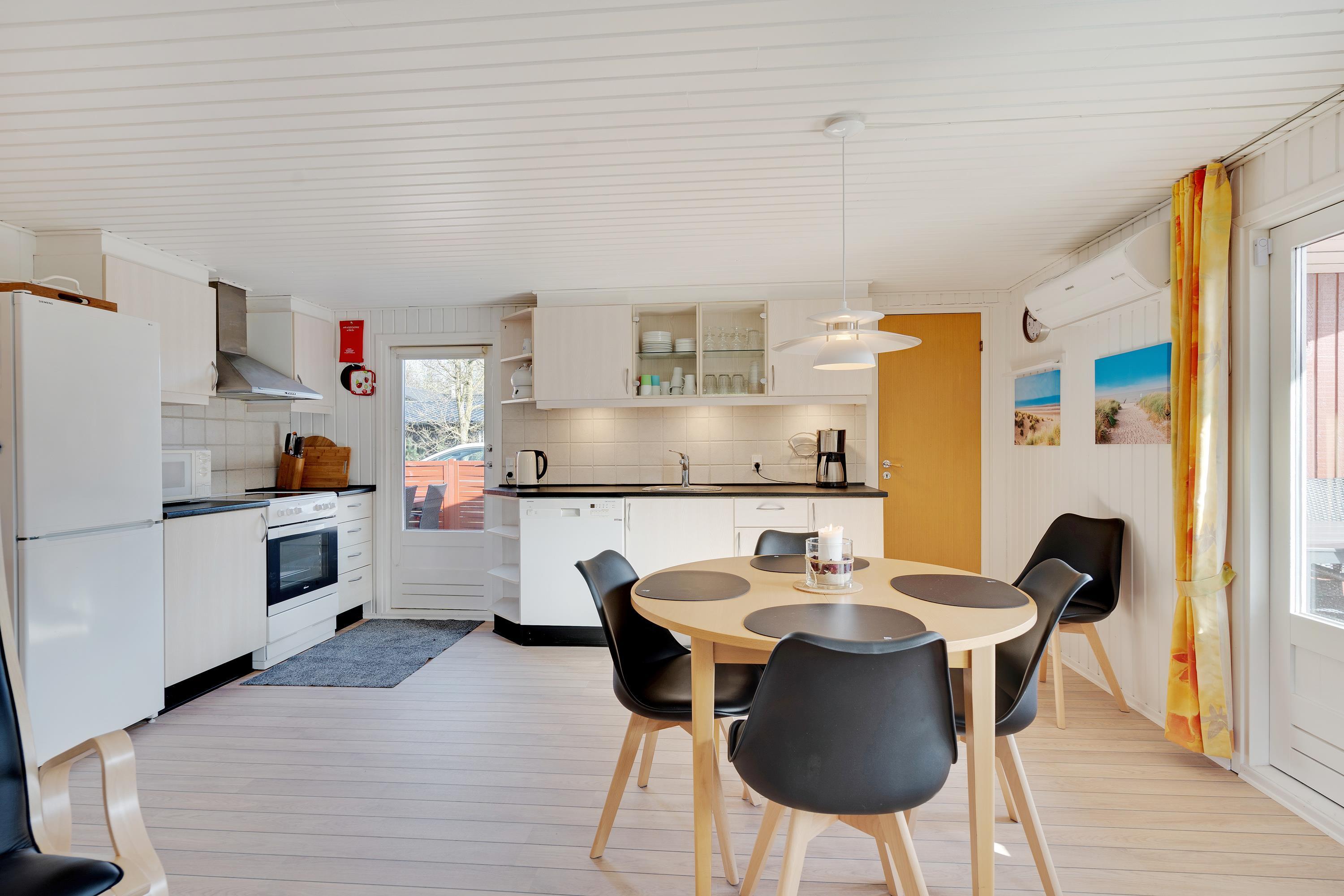 Feriehusets hjerte er opholdsrummet med både stue og integreret køkkenalrum. Her kan I rigtig sætte samværet i fokus med gode middage, hyggelige spilaftener og afslapning på sofaen. Når mørket falder på, eller regnen trommer på ruden på en grå efterårsdag, sørger brændeovnen for både varme og hyggelig feriestemning.