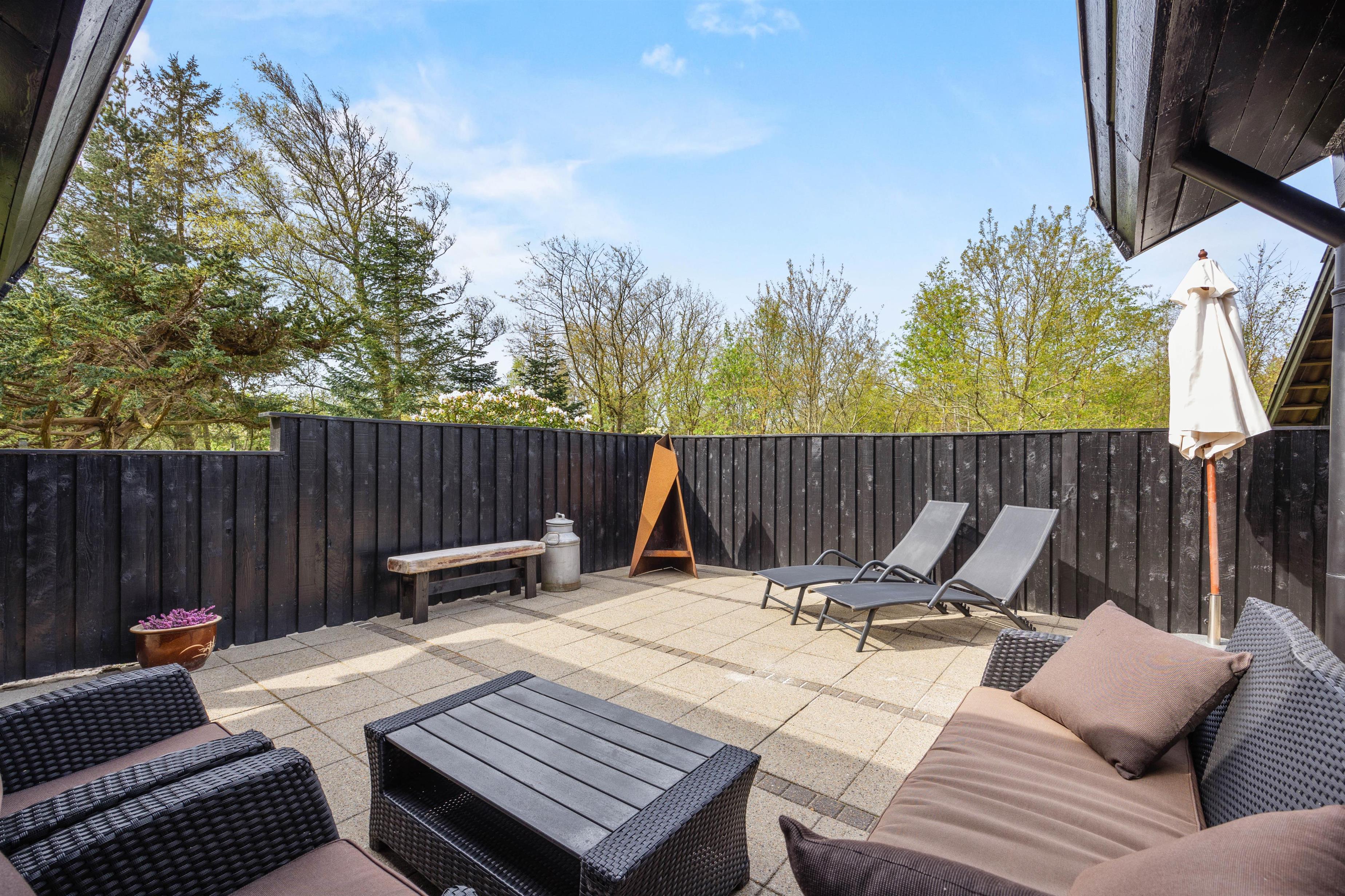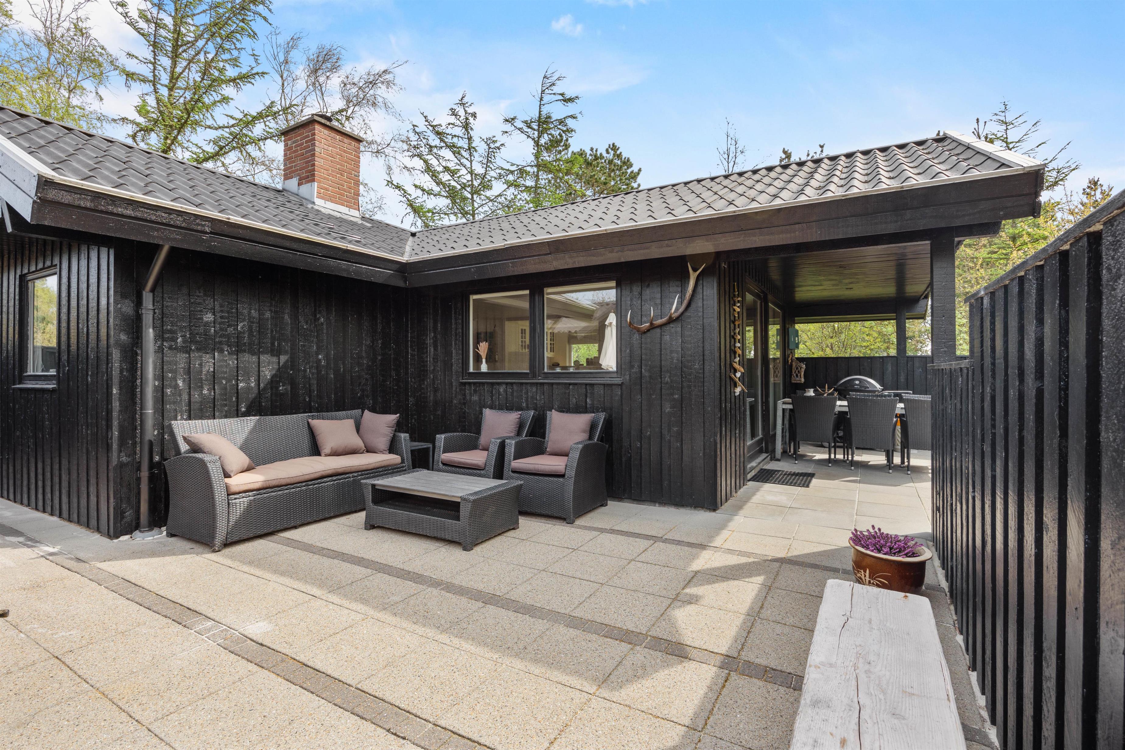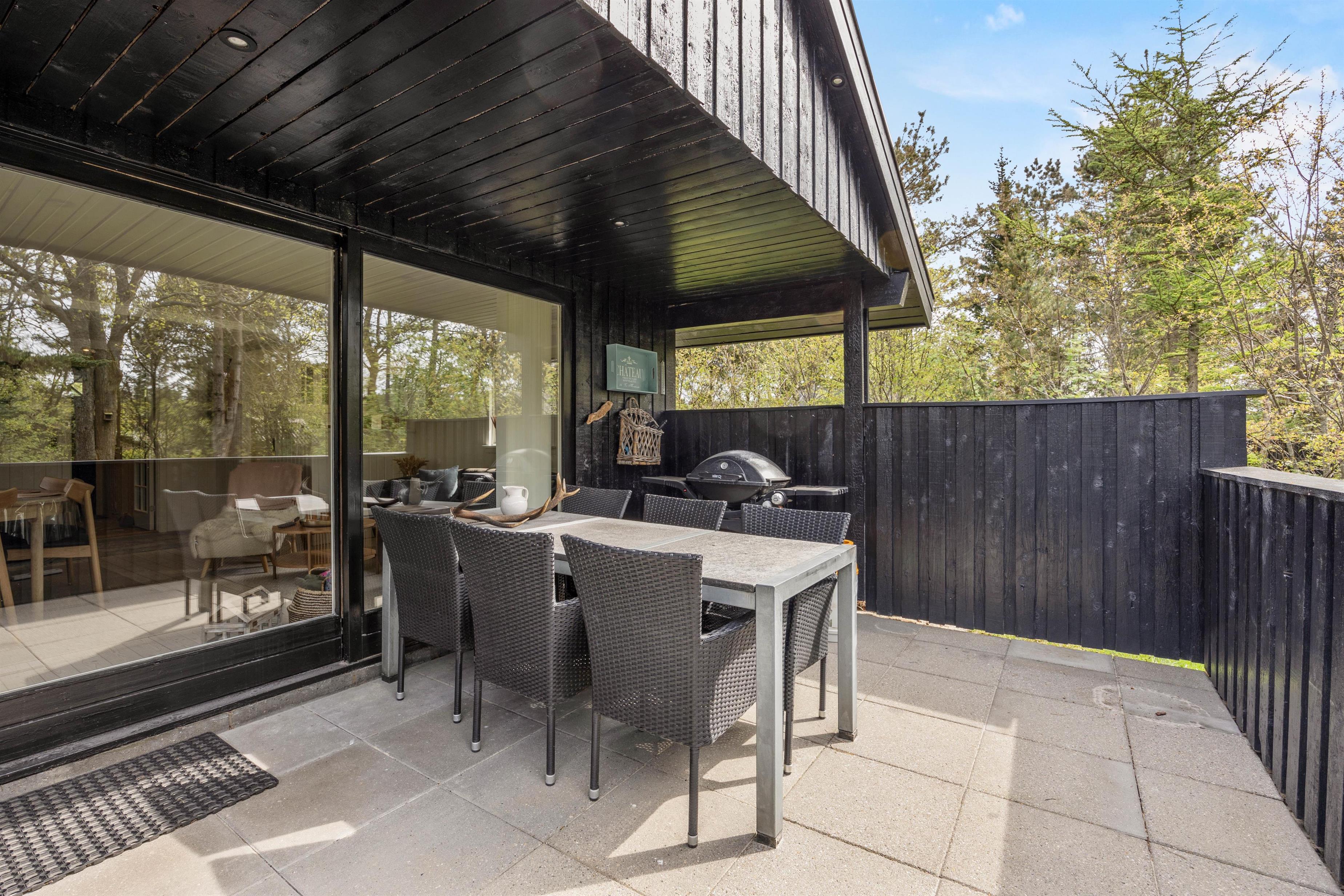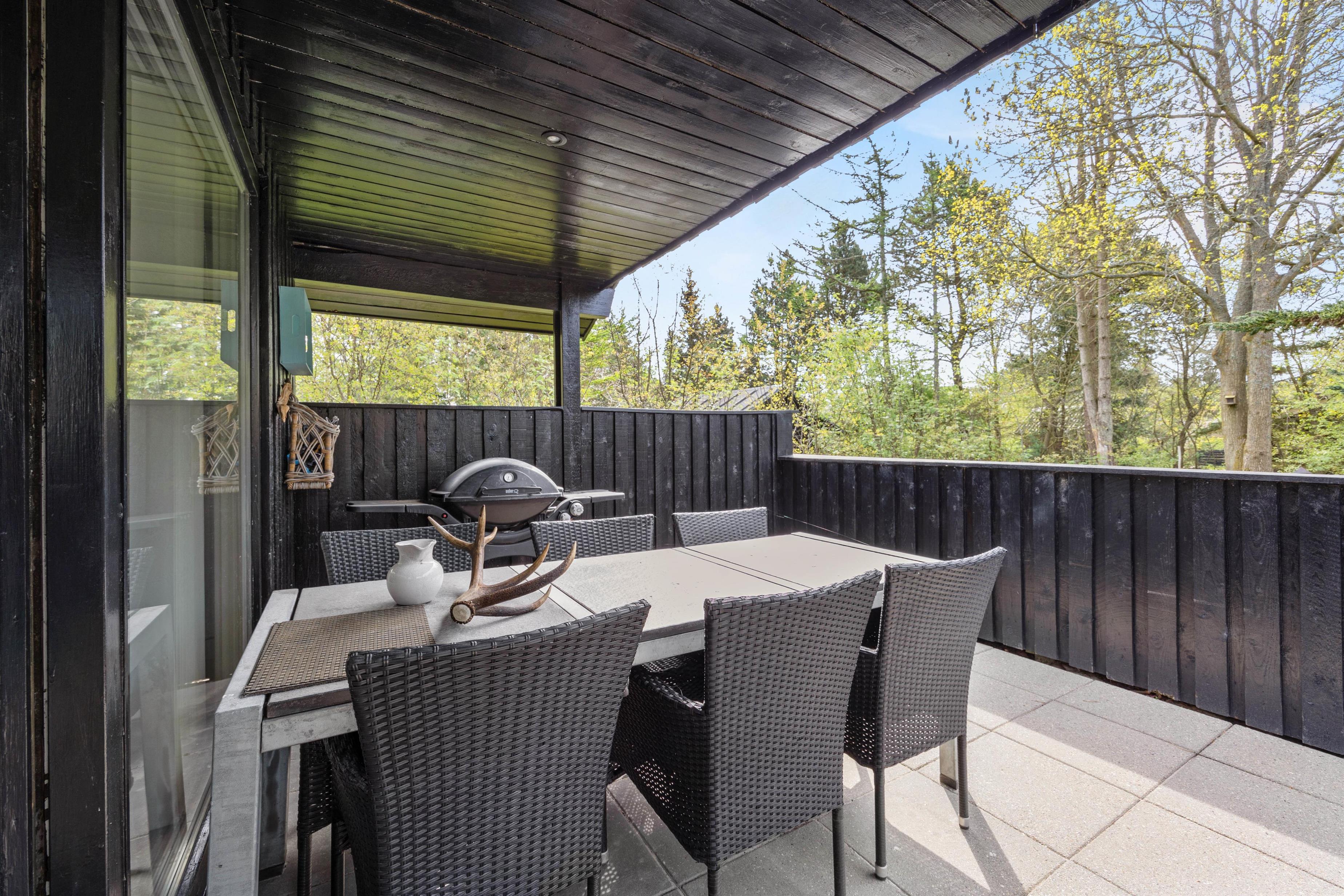 Rundt om huset har I en dejlig til dels overdækkede terrasse. Terrassen er afskærmet så I altid kan finde et hyggeligt læ-hjørne. Det er det perfekte sted til solslikkeri om dagen og lange grillaftener med rødvin og snak, - og på de rigtigt varme sommerdage, er der på denne terrasse helt sikkert også en dejlig skyggeplads, hvor man kan nyde en kold drik. Træer og buske på grunden sørger til enhver tid for privatliv og læ.