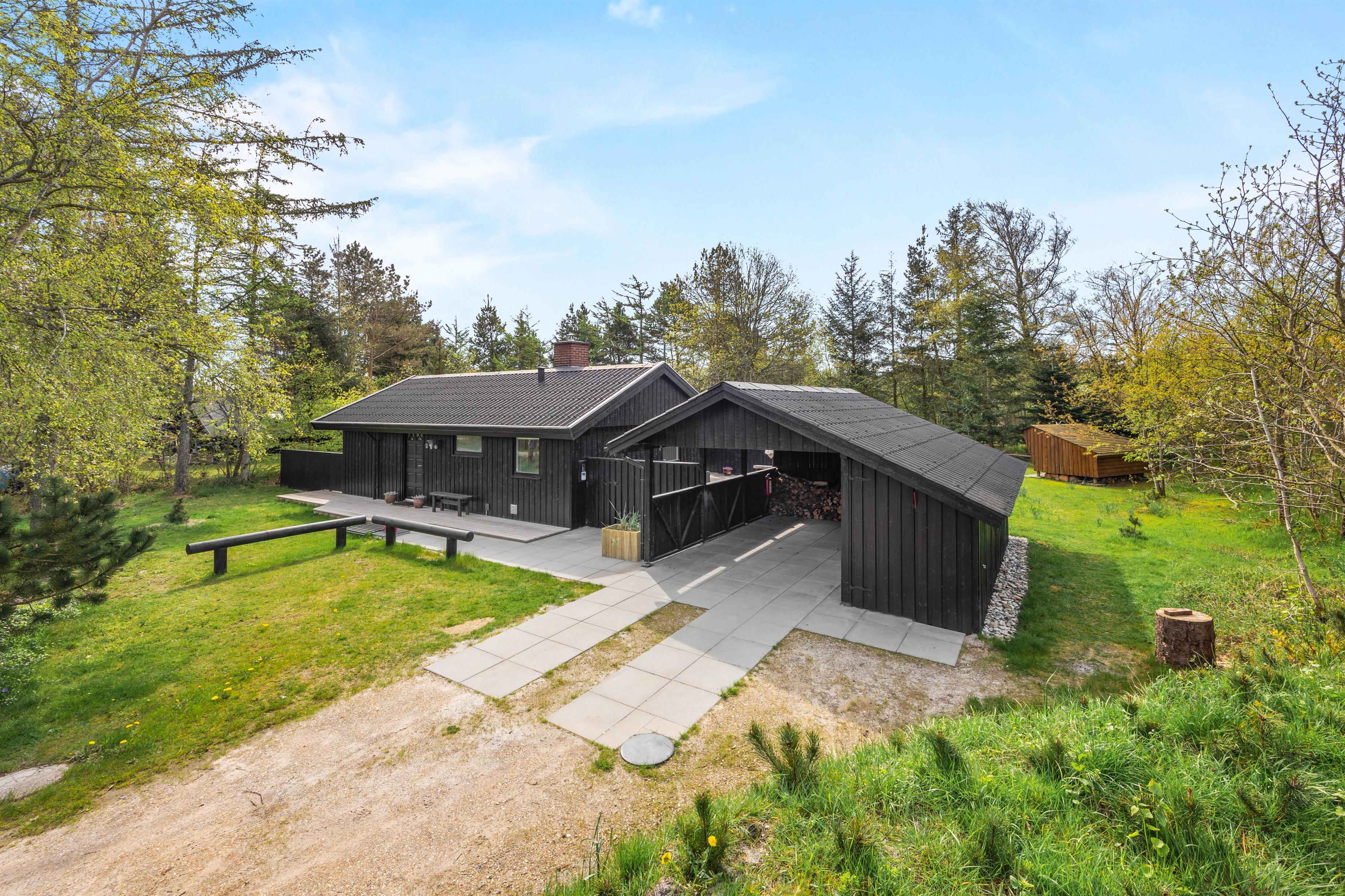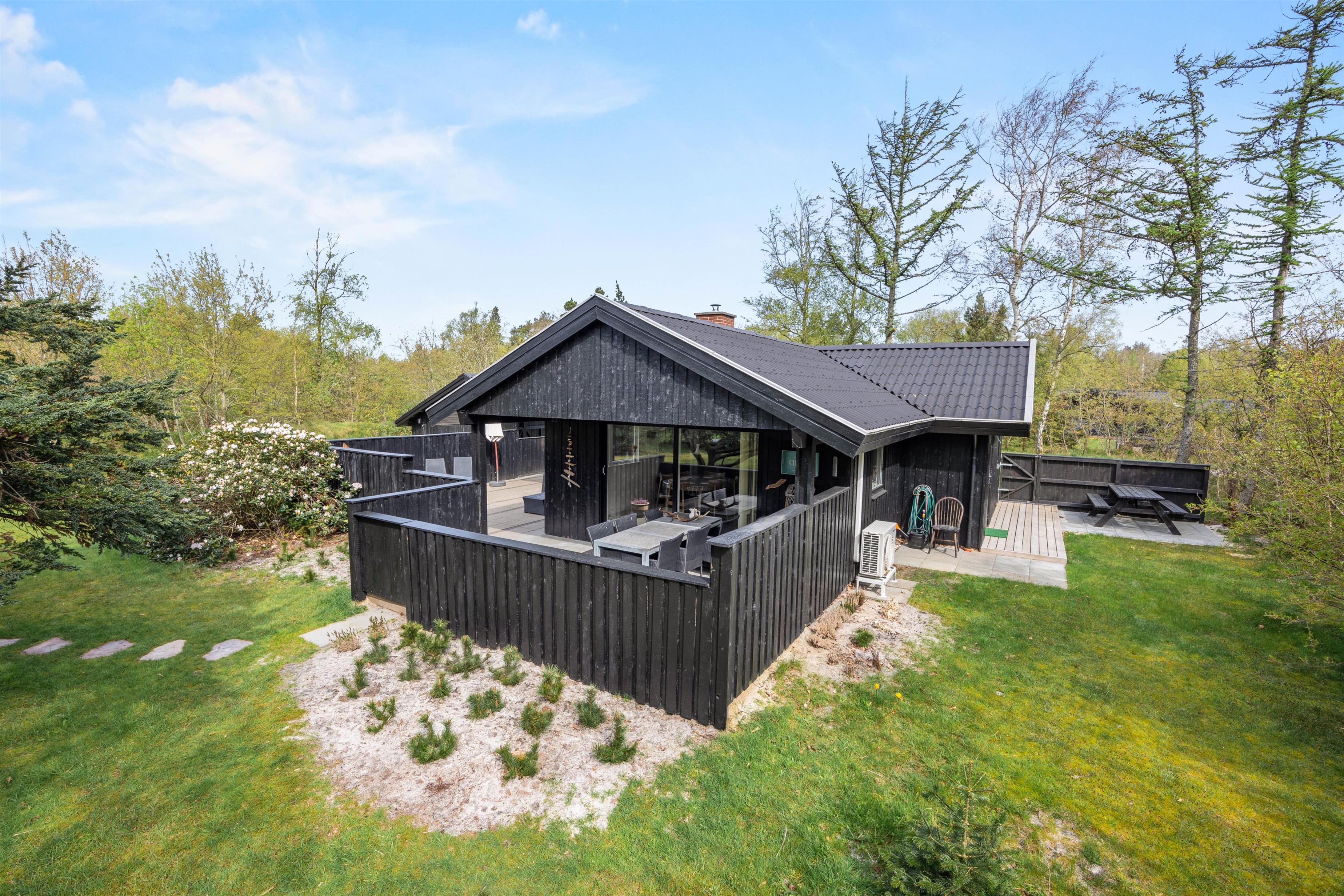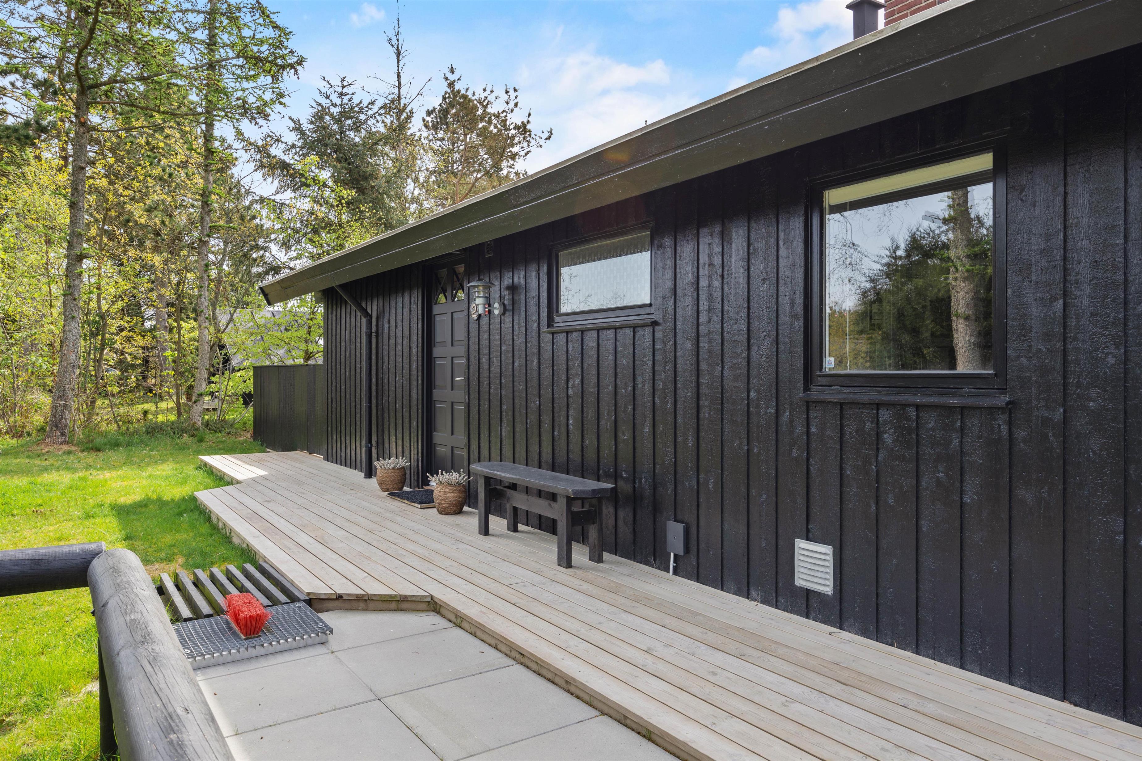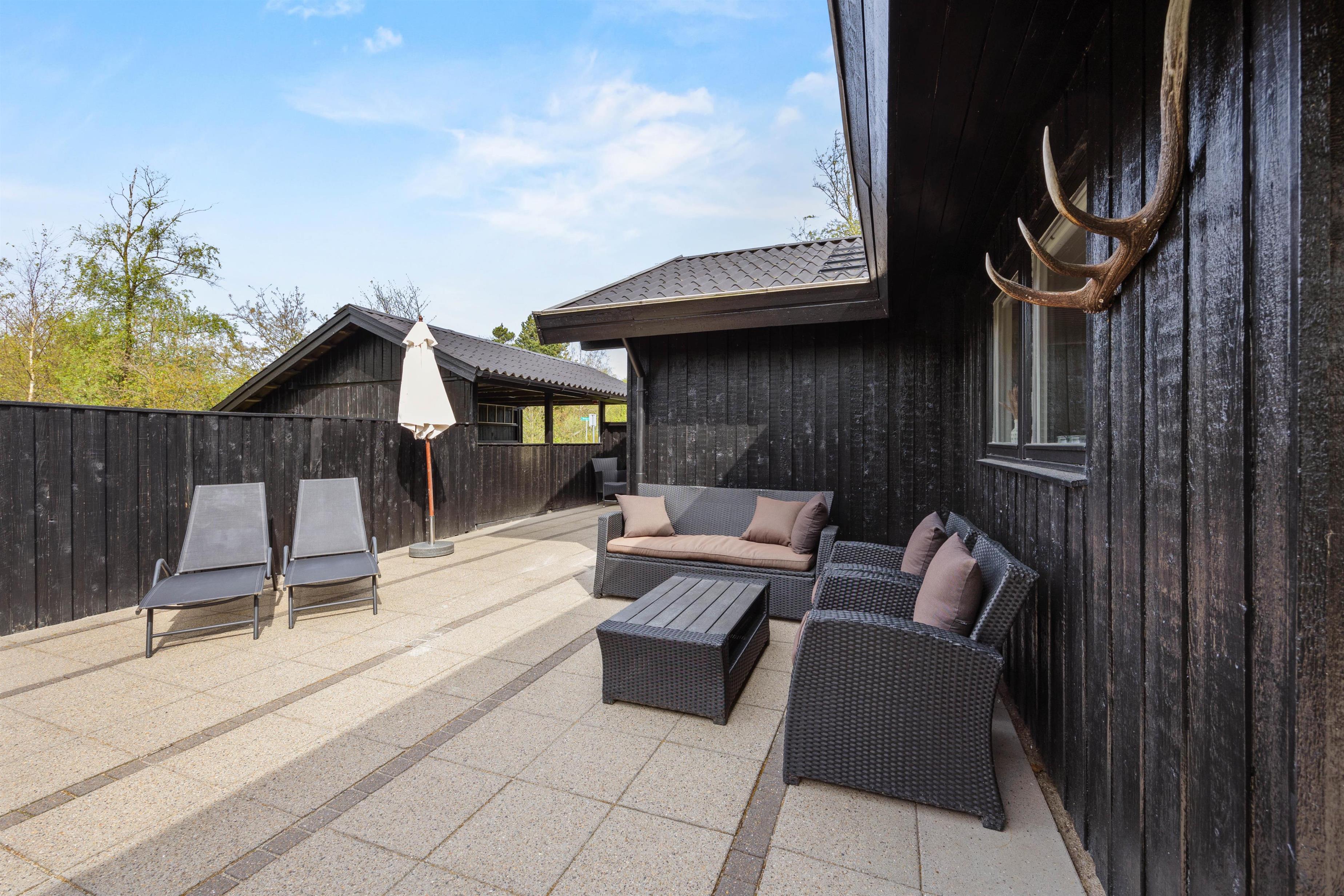 Rundt om huset har I en dejlig til dels overdækkede terrasse. Terrassen er afskærmet så I altid kan finde et hyggeligt læ-hjørne. Det er det perfekte sted til solslikkeri om dagen og lange grillaftener med rødvin og snak, - og på de rigtigt varme sommerdage, er der på denne terrasse helt sikkert også en dejlig skyggeplads, hvor man kan nyde en kold drik. Træer og buske på grunden sørger til enhver tid for privatliv og læ.