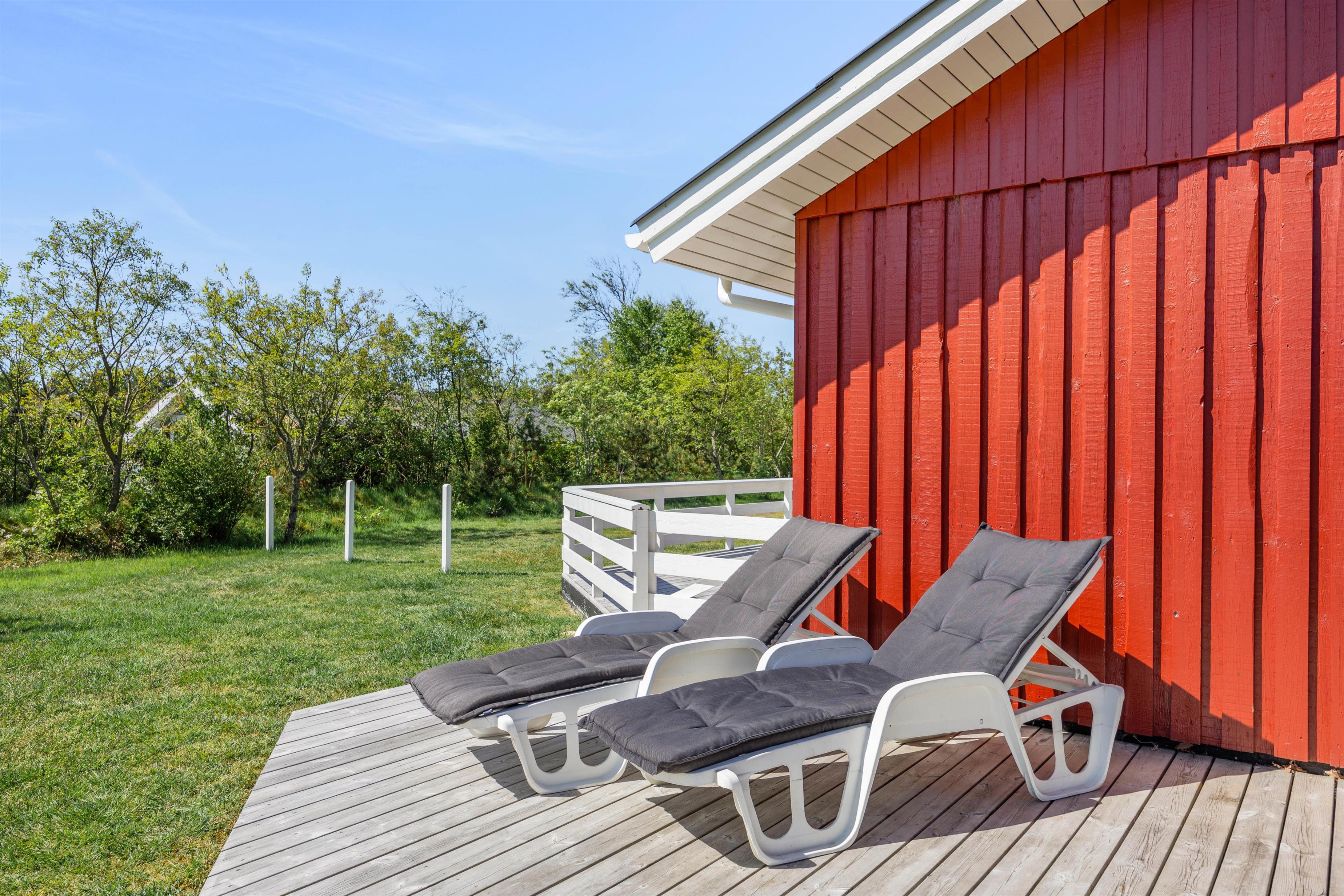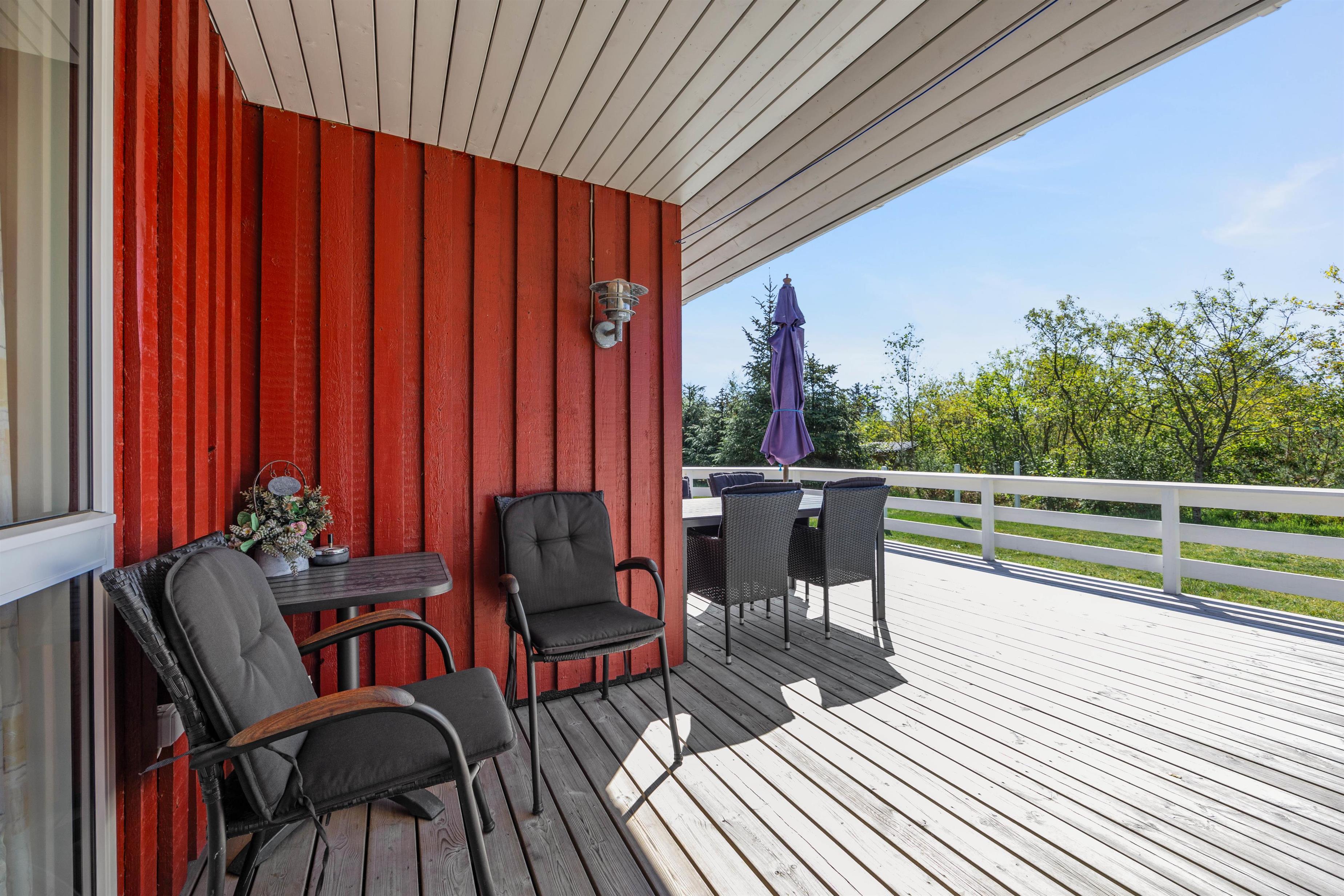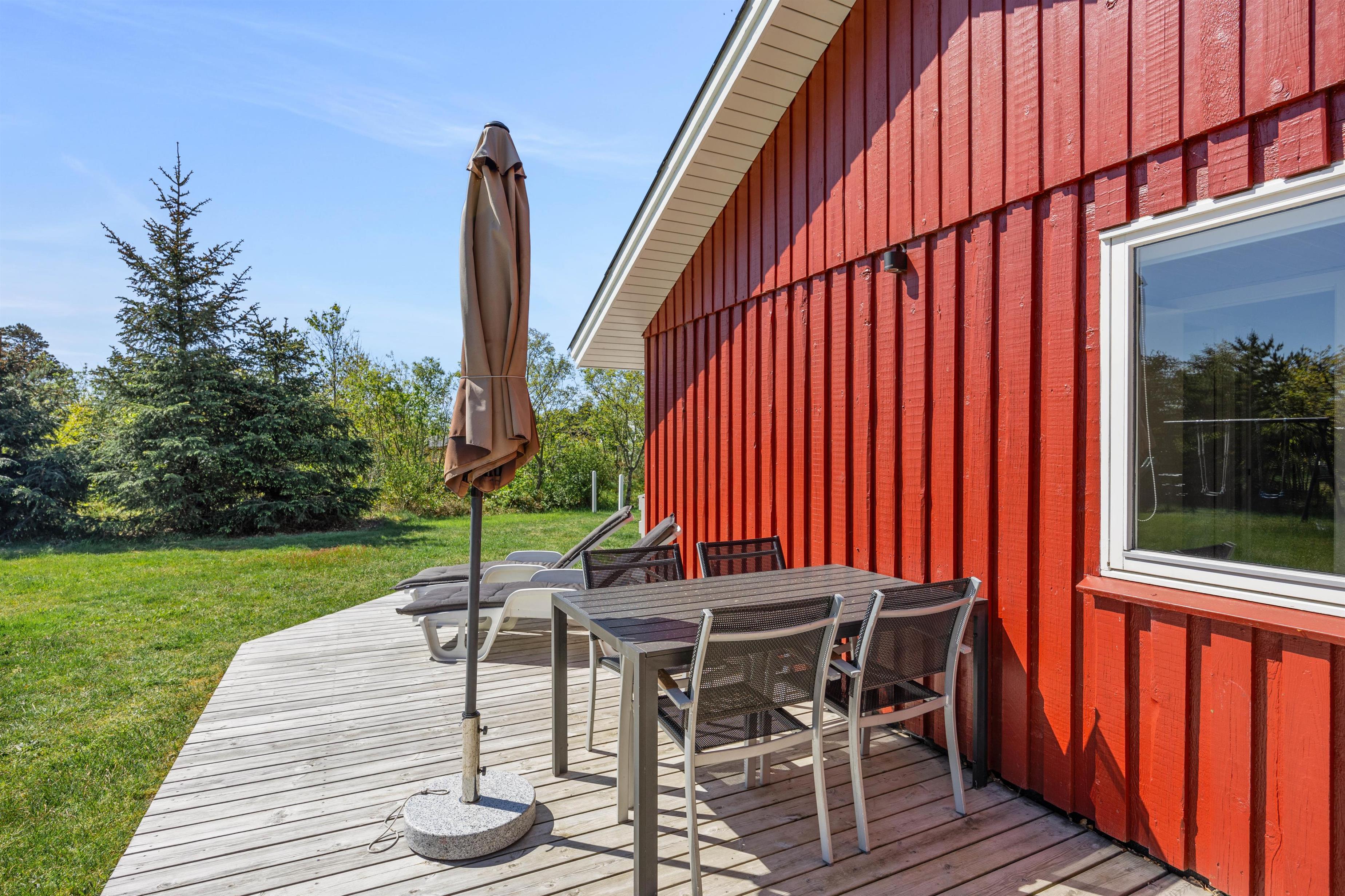 Et højdepunkt ved feriehuset er den terrassen, der selvfølgelig skal nydes på de lune sommerdage. Havemøblerne står klar! En del af træterrassen er lukket, hvilket er helt perfekt for både hundeejeren såvel som småbørnsfamilien. Til familiens mindste er her også sandkasse, gynger og ikke mindst den grønne græsplæne, der indbyder til timevis af leg og bold.
