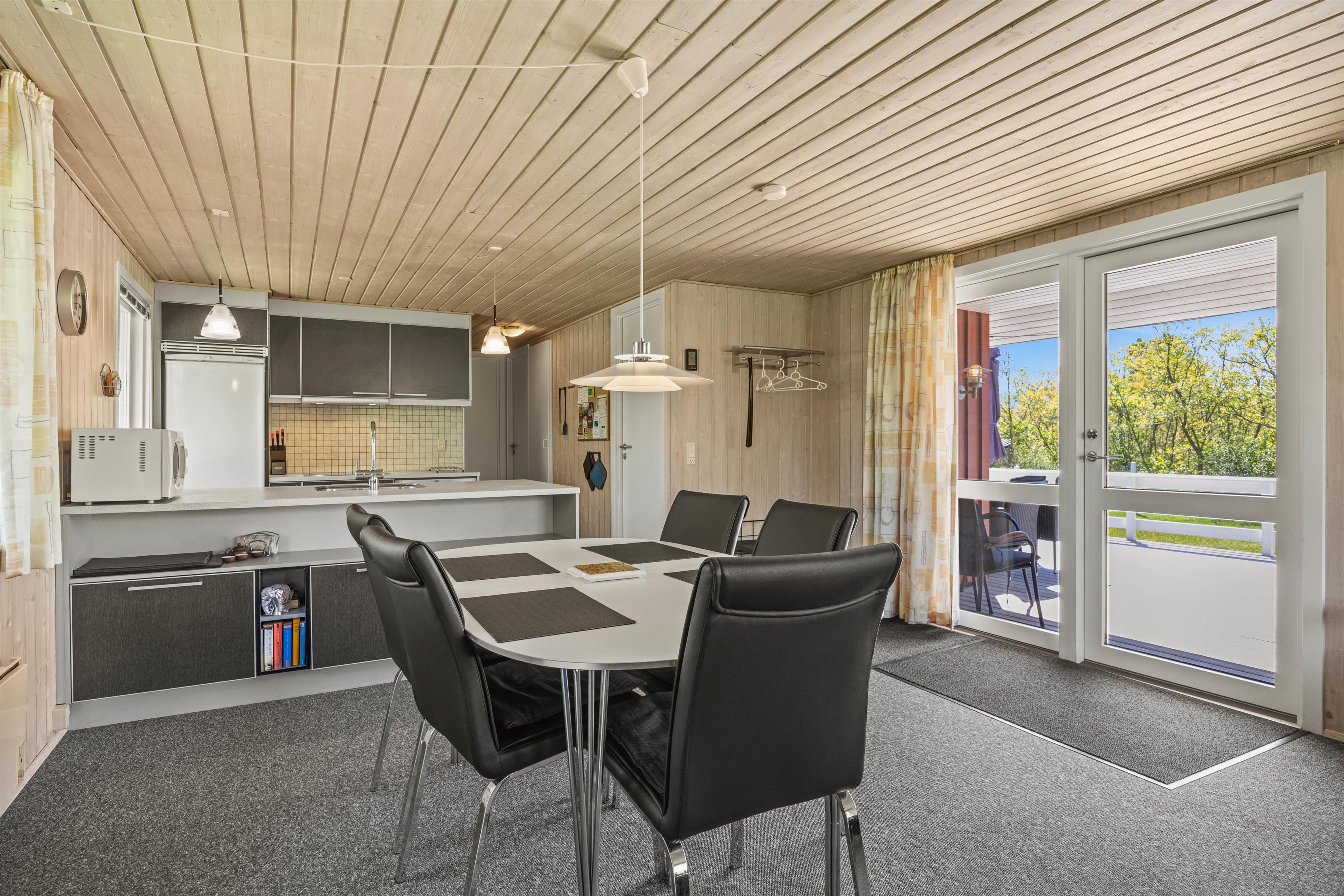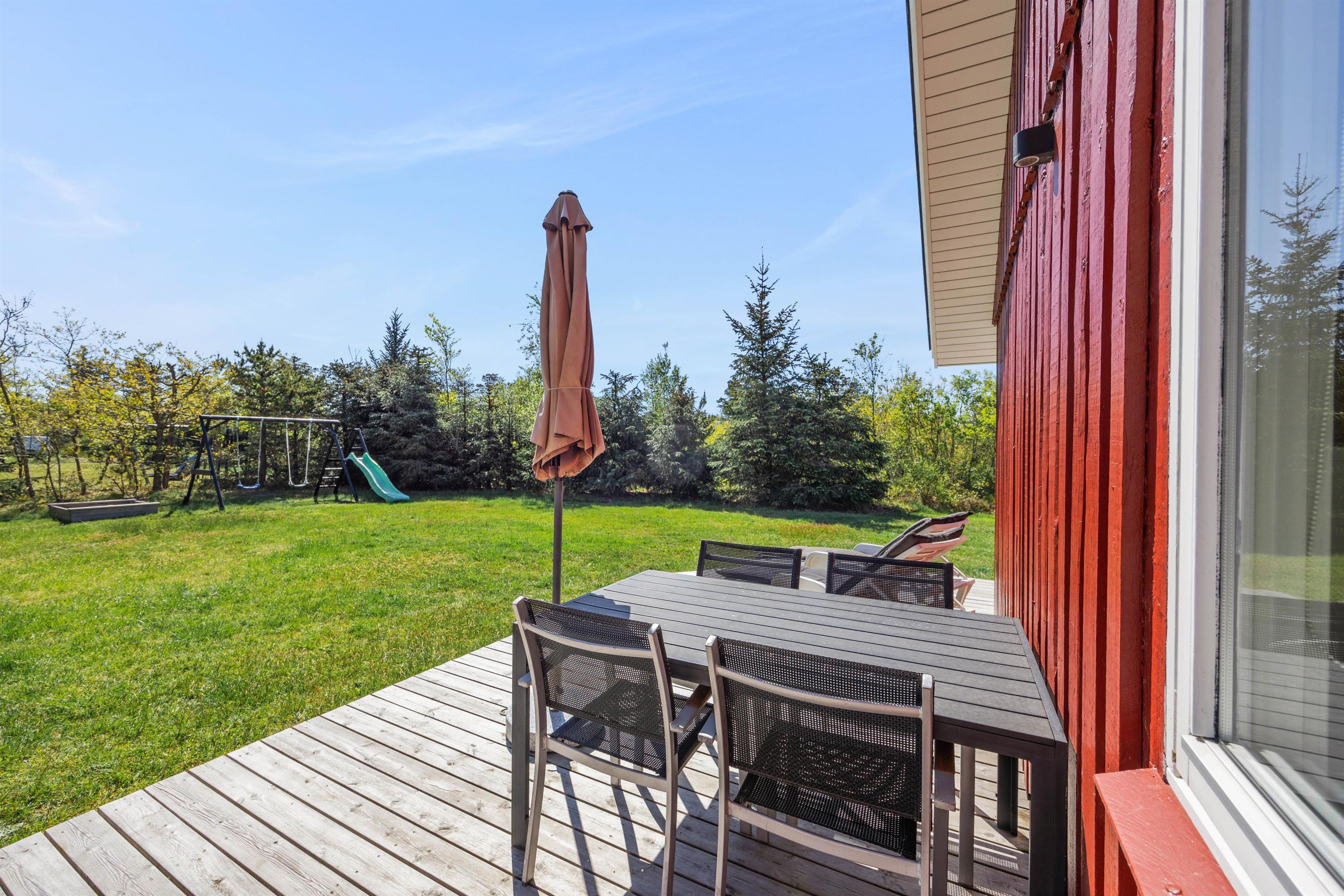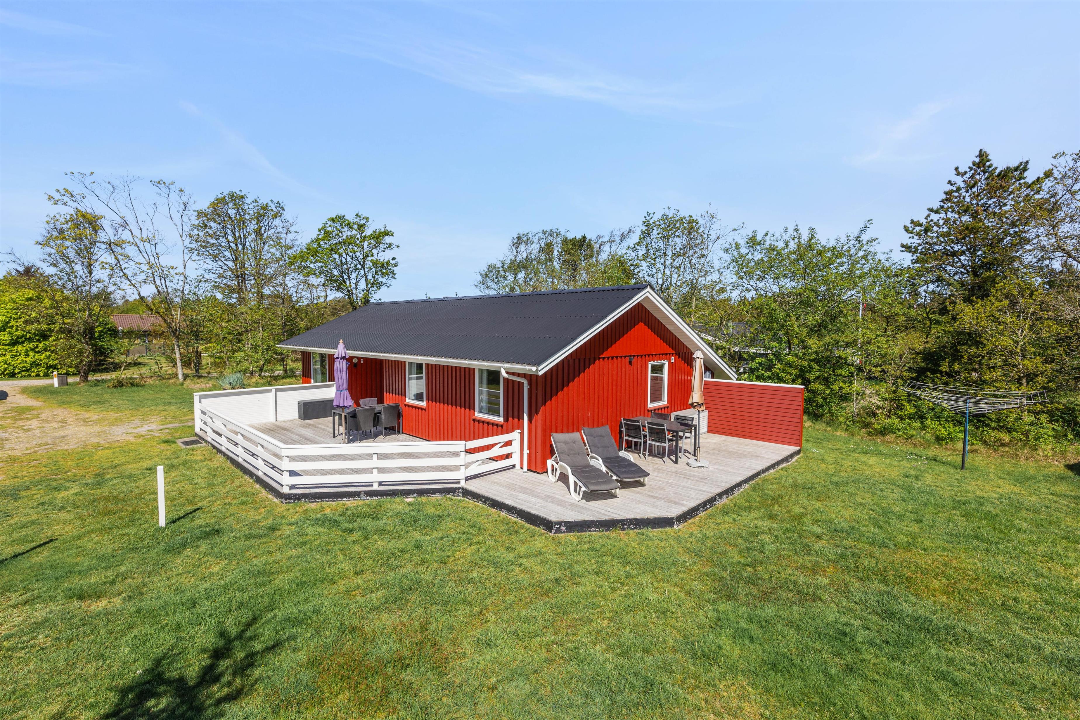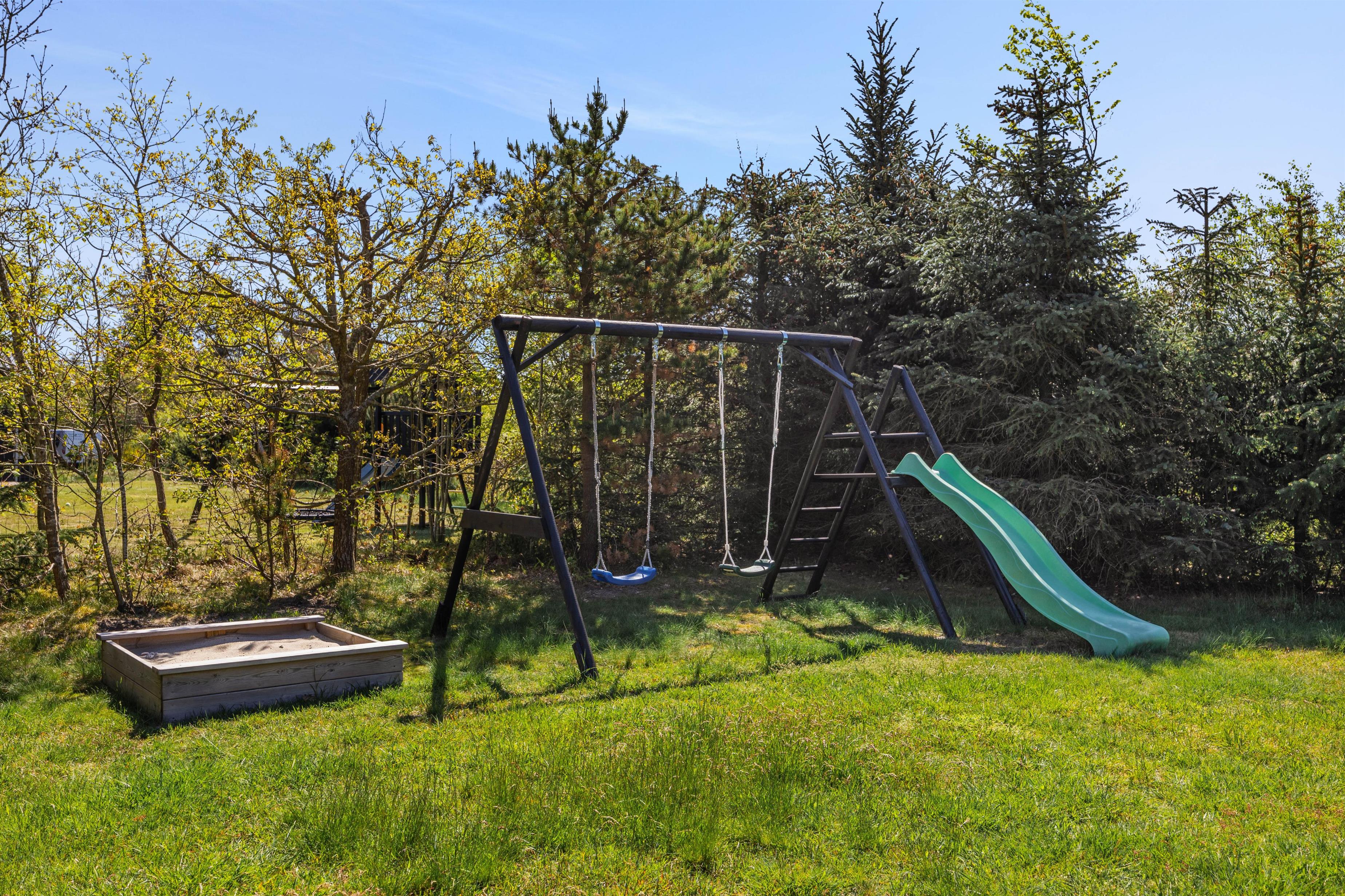 Et højdepunkt ved feriehuset er den terrassen, der selvfølgelig skal nydes på de lune sommerdage. Havemøblerne står klar! En del af træterrassen er lukket, hvilket er helt perfekt for både hundeejeren såvel som småbørnsfamilien. Til familiens mindste er her også sandkasse, gynger og ikke mindst den grønne græsplæne, der indbyder til timevis af leg og bold.