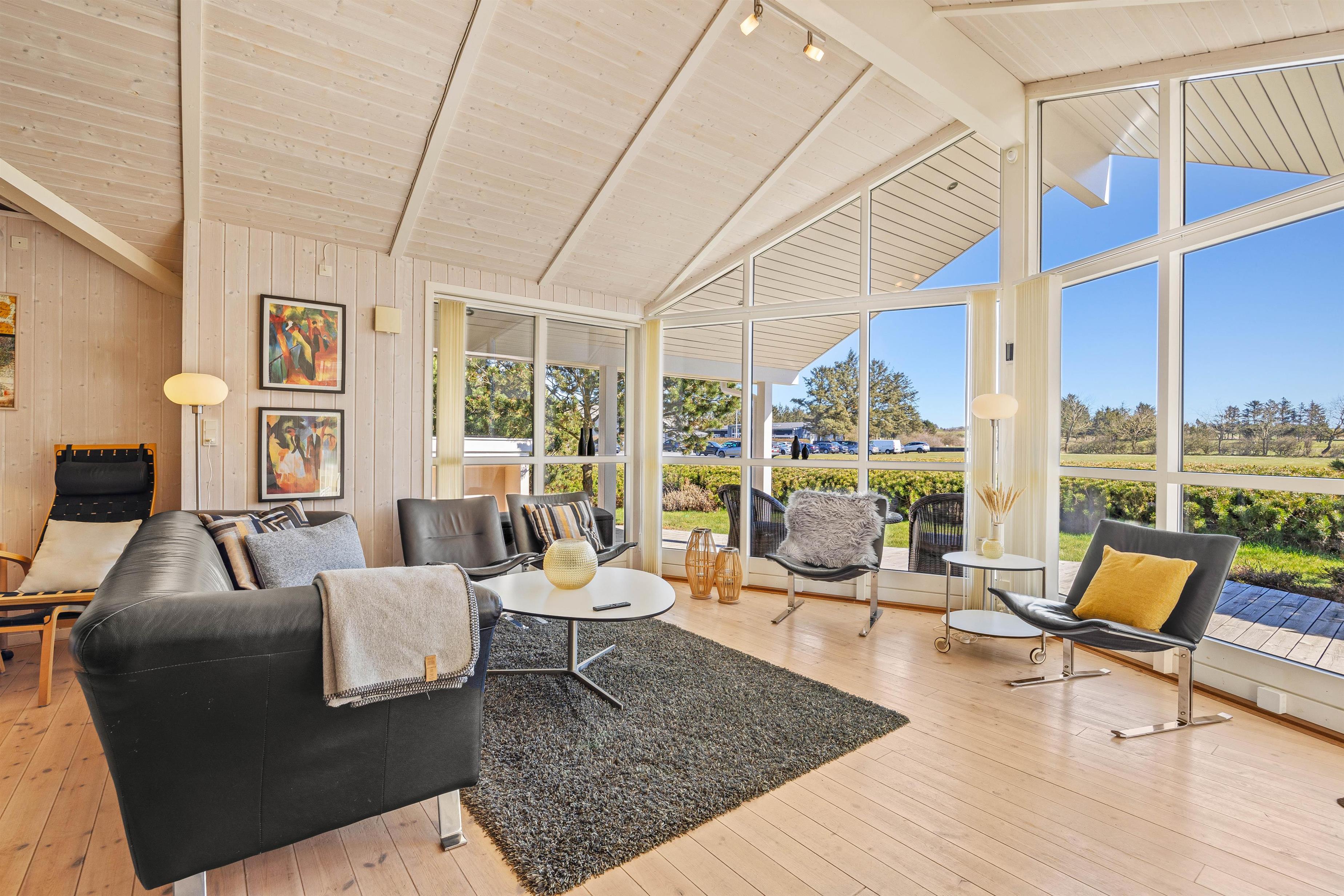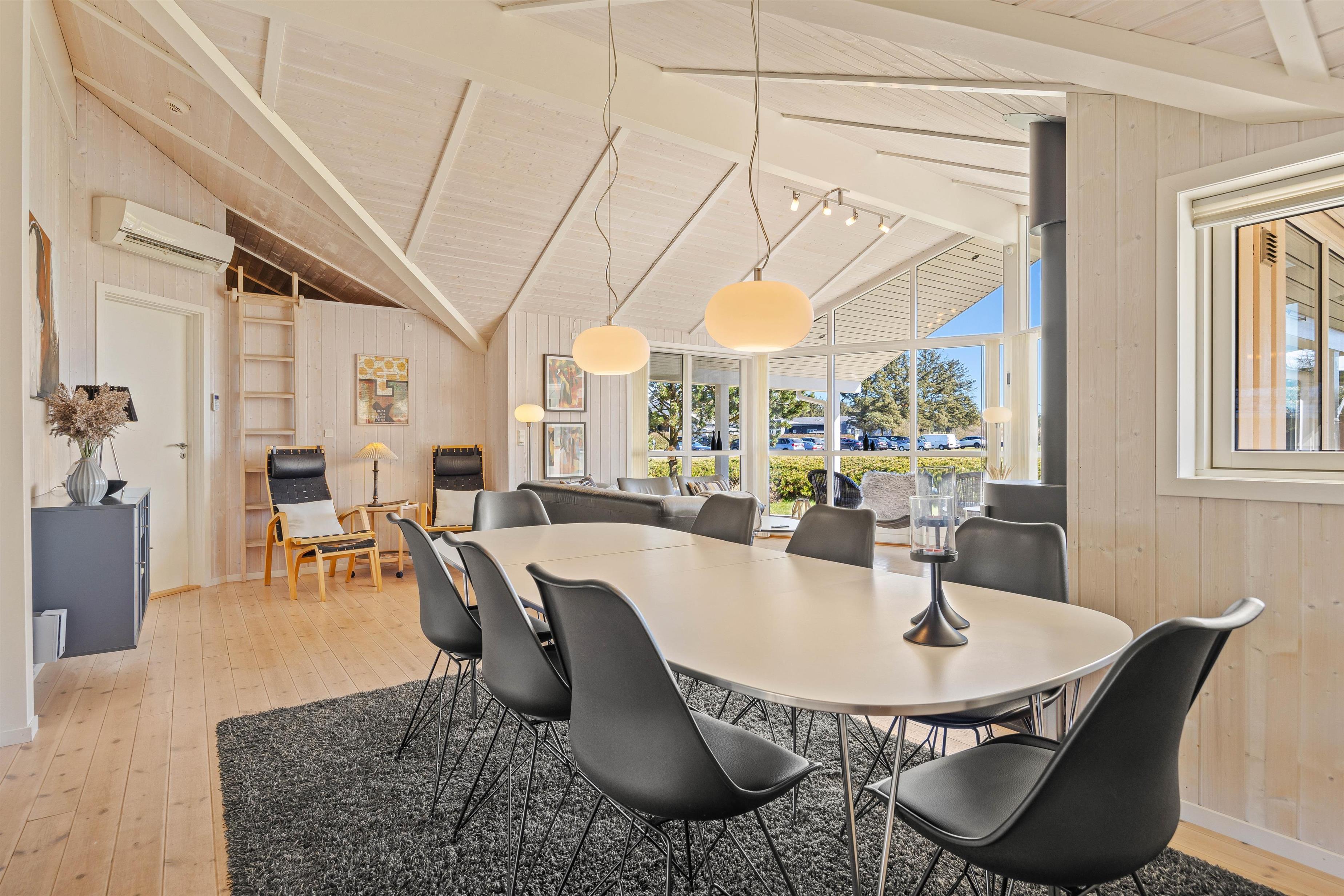 Sommerhusets smagsfulde og hjemlige indretning, de lyse farver på vægge og højde til loftet gør at sommerhuset føles ekstra rummeligt. Opholdsrummet er sommerhusets hjerte og danner rammen for hygge og samvær. Brændeovnen skaber en hyggelig atmosfære på kølige aftener, mens den energibesparende varmepumpe sikrer, at indeklimaet er behageligt året rundt. De store vinduespartie giver et skønt lysindfald til rummet.