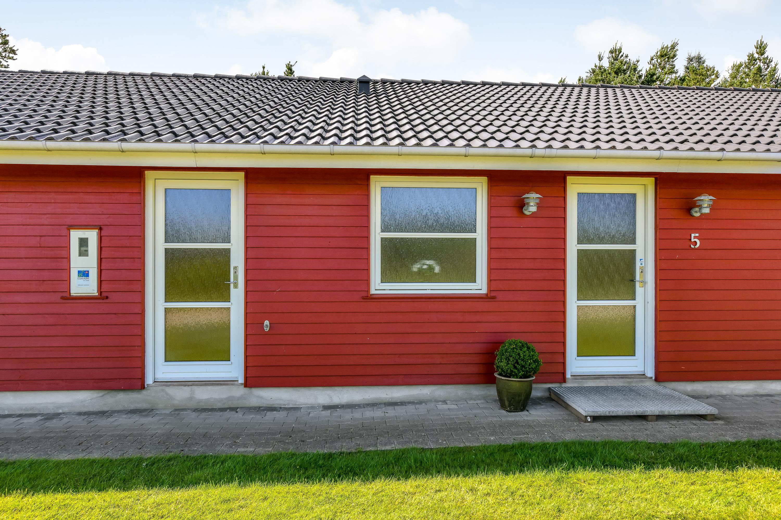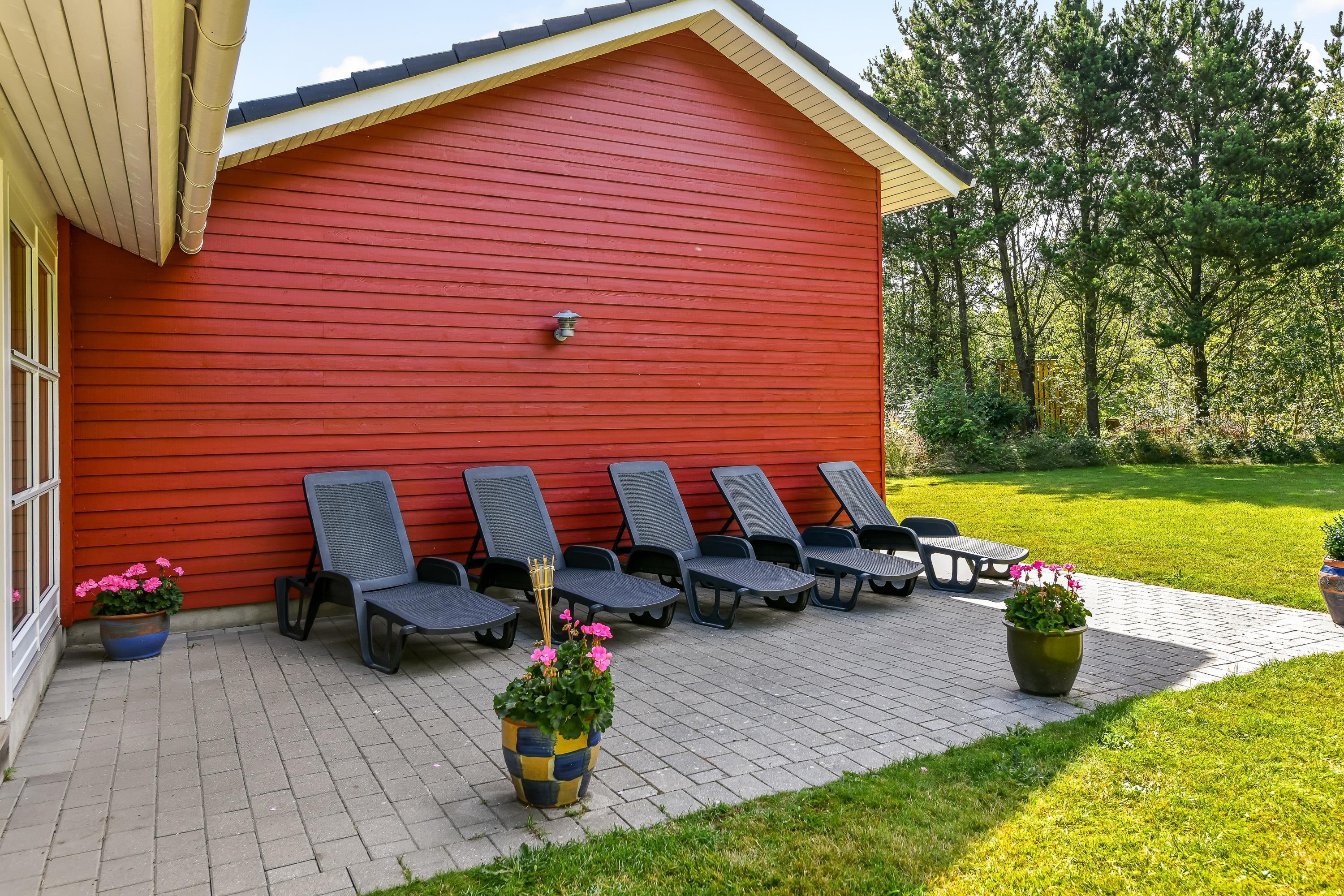 Fra stuen er der direkte adgang til den delvist overdækkede terrasse. Nyd de varme solskinsdage fra liggestolene, mens børnene og hunden leger på græsplænen eller hopper på trampolin. Til de mindste feriegæster er der tilmed sørget for en sandkasse.