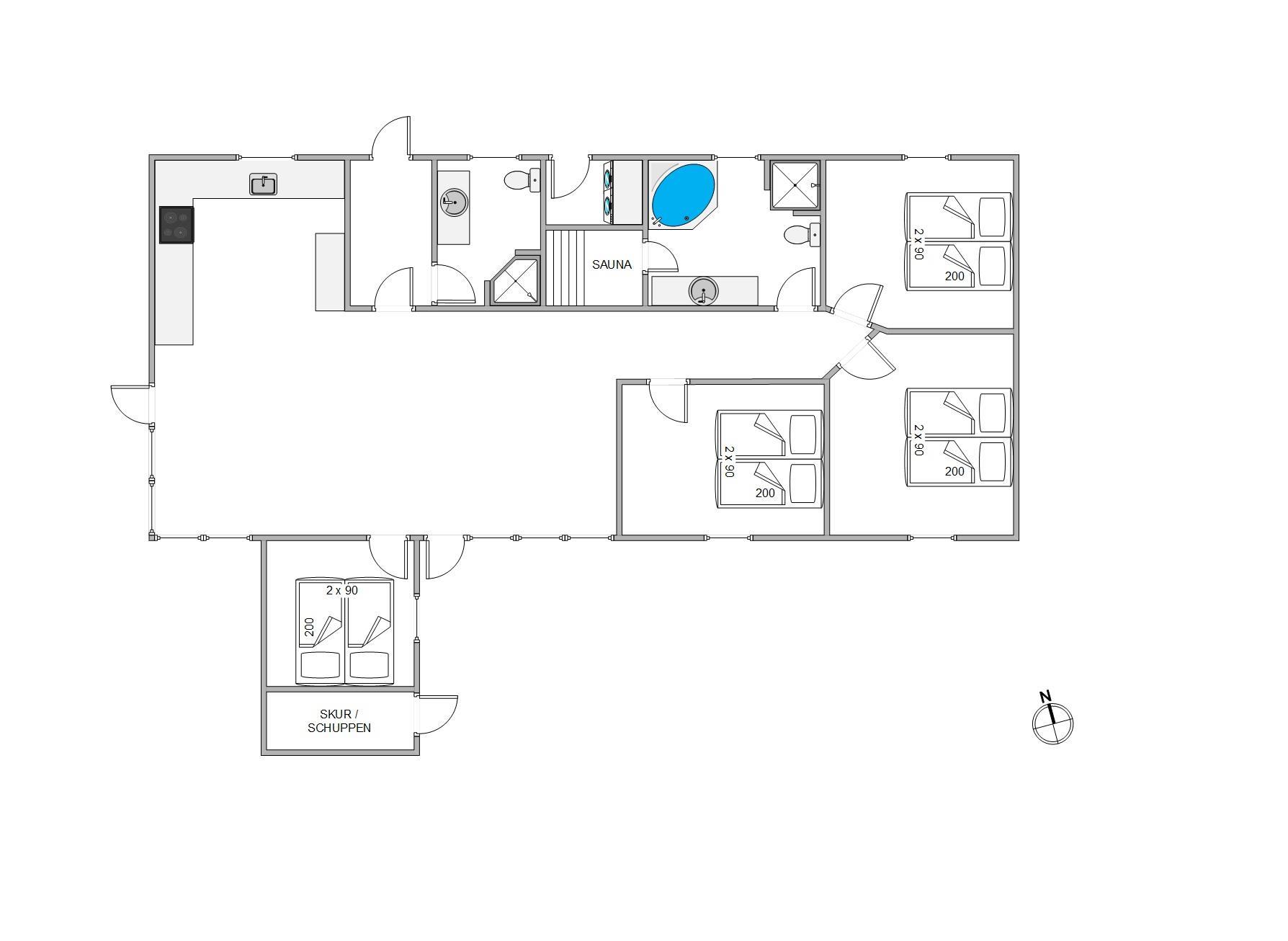Huset er udstyret med 2 badeværelser, begge med gulvvarme. I det ene finder I en lækker wellness-overraskelse; her står spabadet og saunaen klar til at give jer en følelse af ægte luksus. Her kan I slappe godt af efter en dag i den friske havluft.