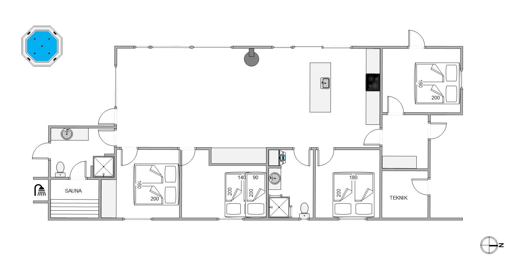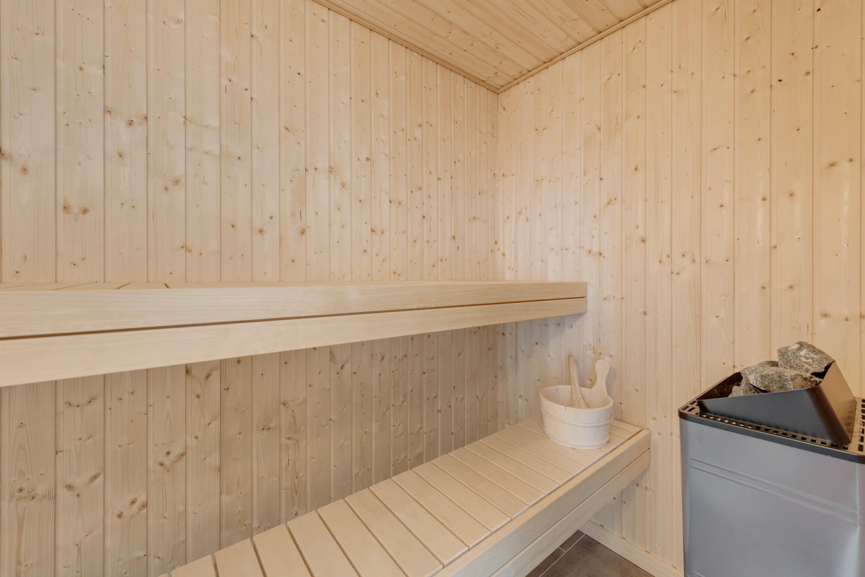 Sommerhuset er udstyret med 2 badeværelser, så I undgår lange køer til badet om morgenen. Fra det ene badeværelse er der desuden indgang til sommerhusets sauna, hvor I kan nyde nogle skønne wellness-stunder. Et sikkert hit efter en lang gåtur i den vestjyske natur! Derudover findes der et lækkert udespa på terrassen.