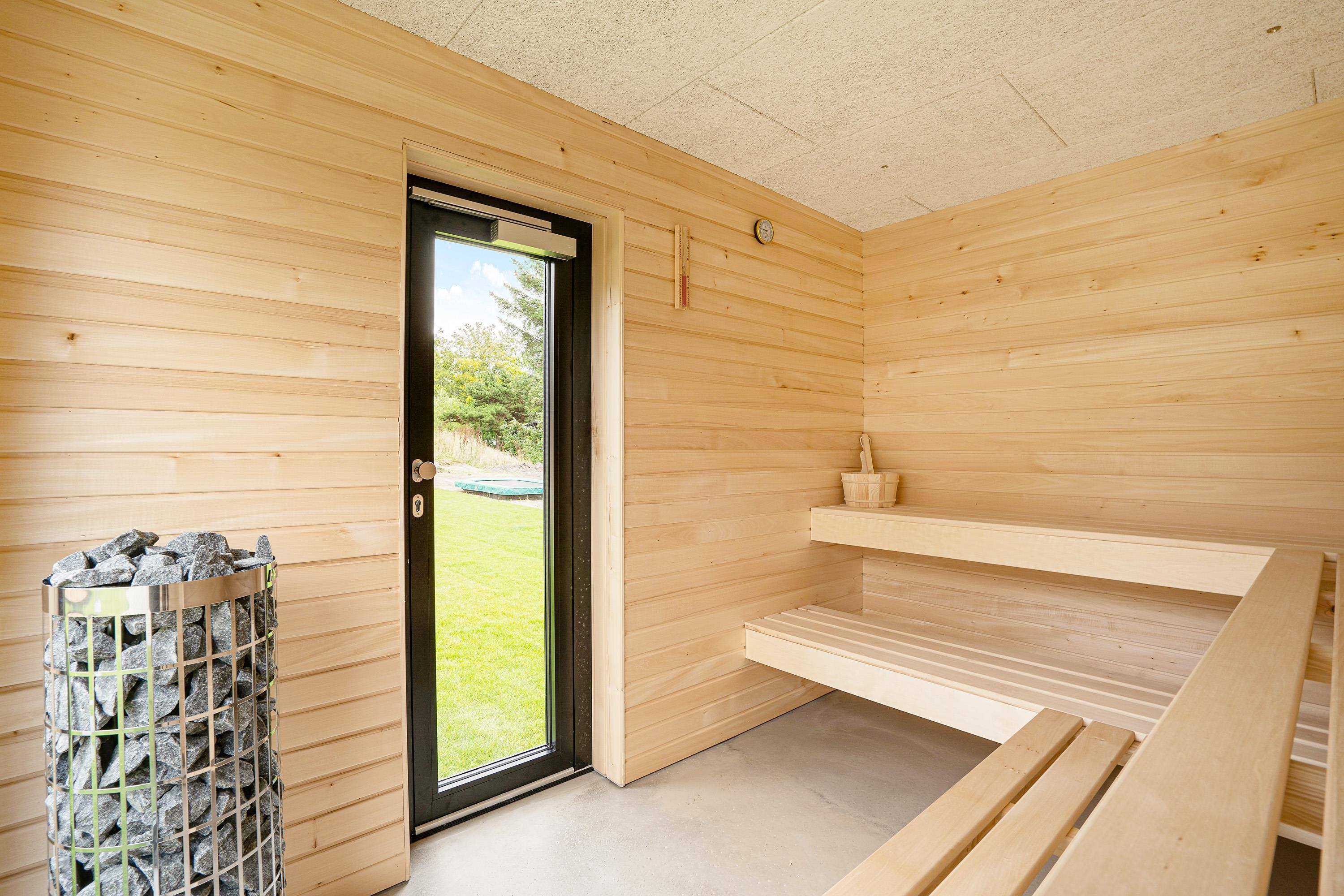 Når afslapningen skal nå det næste niveau, kan I hoppe i den store udespa, som har plads til hele 6 personer. Selv når mørket falder på, og det bliver lidt køligt, kan I sidde i det varme, boblende vand og nyde en kold øl. Dertil kommer den lækre udesauna, hvor I kan nyde en skøn wellness-stund med udsigt til Hennes grønne natur.